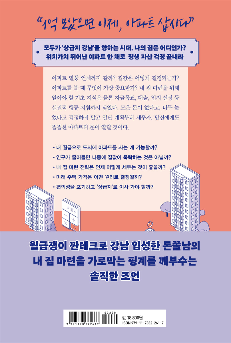 평생 자산 걱정 덜어줄 똘똘한 내 집 마련 필승법 ”1억 모았으면 이제, 아파트 삽시다“ 집을 산다는 것은 평생 힘들게 모은 목돈이 들어가는 일이다. 강력한 부동산 억제 정책과 하루가 다르게 신고가를 갱신하는 아파트 가격 때문에 언감생심 내 집 마련 시도조차 하지 못하는 이들을 위해, 머니 트레이너 김경필이 나섰다. ”내 집 마련은 초기 자본금이라는 진입 장벽이 존재한다. 하지만 장벽 너머에 무엇이 기다리는지 정확히 알면 그 장벽을 넘고 싶은 생각이 들지 않을까?“ 〈하이엔드 소금쟁이〉 〈구해줘 홈즈〉 등 각종 방송과 유튜브에서 재테크를 하고자 하는 이들에게 뼈 때리는 진단과 실속 있는 해결 방안을 제시해온 김경필, 이제 한 걸음 더 나아가 《결국 당신은 아파트를 사게 된다》에서는 돈 모으는 사람이라면 한 번쯤은 떠올려보았을 내 집 마련의 꿈을 실현할 수 있는 길을 보여준다. 저자는 사회초년생 시절 월급 155만 원 중 124만 원을 저축하며 대출을 받아 만 40세가 되기 전에 강남 아파트에 입성했다. 대출이자를 융통하기 위해 두 번이나 세를 놓고 집을 떠났어야 했지만 당시 그의 결정은 지금 가장 성공적인 재테크가 되었다. 그러나 ”아무 아파트나 사도 다 오르는 시대는 지났다. 영혼까지 끌어모아 아무 데나 사면 망한다.“ 그는 내 집 중에서 아파트, 아파트 중에서도 똘똘한 한 채를 마련하고자 하는 이들에게 냉철하게 조언한다. 집값이 너무 올라 집을 살 수 없다고? 아니다, 현재 누리고 있는 생활을 포기하지 않으면 집을 못 산다. 집을 꼭 사야 할까? 그렇다, 내 집 마련은 평생 힘들게 번 돈을 가장 안전하게 지키는 일이다. 7억 원에서 28억 원이 된 강남 아파트, 더 이상 남의 이야기가 아니다. 《결국 당신은 아파트를 사게 된다》는 집값을 결정하는 요소와 똘똘한 아파트를 알아보는 안목을 키우는 방법, 저자 본인의 경험과 실수요자들의 사례에 기반한 내 집 마련 플랜과 노하우를 알차게 담았다. 집을 사야 할까 망설이는 2030, 무엇부터 시작해야 할까 방법을 모색하는 3040, 더 나은 집으로 옮겨도 될까 한 단계 상승하고자 하는 4050, 모두를 위한 가장 실용적인 재테크 로드맵. 모두가 ‘상급지 강남’을 향하는 시대, 나의 집은 어디인가? 집값의 경제학부터 내 집 마련 실전 노하우까지 · 똘똘한 아파트, 왜 중요할까?: 자수성가 부자들이 선택한 ‘넘사벽’ 수익률 집을 빌려서 살면 손해다. 집을 사지 않더라도 어차피 집값의 60% 정도 되는 비용을 전세금 등 주거 비용으로 써야 하고, 나머지 자산을 다른 곳에 투자하여 매번 집값 상승 이상의 수익을 내야만 한다. 하지만 그것은 불가능에 가까운 일이다. 똘똘한 아파트 한 채는 일반적인 주식 투자 수익률과, 보통의 아파트 두 채를 압도하는 수익률을 보장한다. 한국에서는 1가구 1주택으로 생긴 소득에 대해서는 양도가액 12억 원까지는 단 한 푼의 세금도 내지 않고 12억 원이 넘는 고가 주택이라도 10년 이상을 보유한다면 12억 원 초과분에 대해서 양도소득이 발생하더라도 80%를 공제해준다. 실거주 목적이 큰 똘똘한 아파트 한 채는 세제상 불이익을 피하면서 미래가치가 보장되는 블루칩과도 같다. · 똘똘한 아파트란 무엇이고, 어떻게 알아볼 것인가?: 적정 가격을 파악하고 위치가치에 집중하라 집값은 사용가치와 투자가치에 의해 결정되는데, 사용가치 중 하나인 위치가치가 핵심 중의 핵심이다. 즉 똘똘한 아파트란 사람들이 선호하는 지역에 있어 위치가치가 뛰어난 중소평형의 아파트다. 전국의 ‘-리단길’처럼 각 지역에는 살기 좋고 투자하기 좋은 으뜸 거주지(강남)가 있다. 신축도 평형도 중요하지 않다. 자금 목표를 설정하고 자신의 생활권 중 위치가치가 가장 높은 지역을 선택해야 한다. 치안, 교육, 교통, 자연은 으뜸 거주지를 고르는 가장 중요한 기준이다. · 똘똘한 아파트를 어떻게 내 것으로 만들 수 있을까?: 저축 계획부터 실행 프로세스까지 인구가 줄어들고 있다고는 하지만 기대수명과 활동기가 늘어나는 만큼, 저자는 집값이 하락할 때를 기다리지 말고 지금 내 집 마련 계획을 세워야 한다고 말한다. 사회초년생은 40~50%를 저축해 무조건 종잣돈을 만들어야 하고, 결혼 후 15년까지는 맞벌이로 자금력을 키워야 한다. 미혼은 소득이 상대적으로 더 낮기 때문에 50세(정년 15년 전)에는 내 집을 마련해야 한다. 또한 저자는 내 소득 수준에 알맞은 대출금은 얼마인지, 호가·시세·실거래가·급매가 차이는 무엇인지, 가치보다 너무 비싼 집을 어떻게 피할 수 있는지도 상세하게 알려준다. 저자가 제시하는 발품 6단계는 후회 없는 임장을 보장한다. 7억에서 28억 된 강남 아파트, 아직도 남의 이야기처럼 들리는가? 핑계는 무주택 기간을 늘릴 뿐이다 아직도 내 집 마련을 망설이고 있는가? 똘똘한 한 채 마련은 시간과의 싸움이다. 소득과 집값, 생활비 모두 빠르게 상승하지만 소득보다는 집값과 생활비가 더 빠르게 올라가기 때문이다. 따라서 무주택자는 결혼 초기에, 특히 자녀가 취학하기 전에 주택에 얼마나 적은 돈을 투여하느냐가 내 집 마련을 앞당기는 열쇠가 된다. 조금 더 좋은 곳에 살고 싶다고?