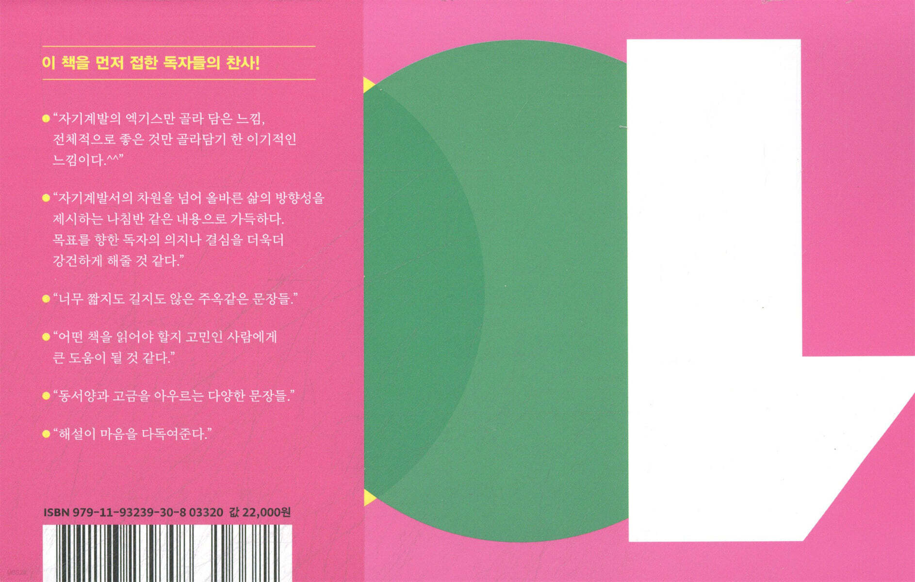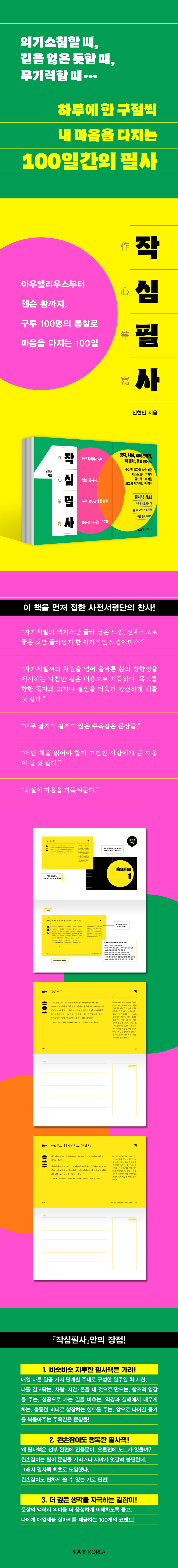 하나. 비슷비슷 지루한 필사책은 가라! 이 책은 들어가는 문장과 나가는 문장 각 하나씩과 매일 다른 일곱 가지 단계별 주제가 담긴 일주일 치 세션 열네 개로 구성되어 있다. 각 세션마다 나를 갈고닦는, 사람?시간?돈을 내 것으로 만드는, 창조적 영감을 주는, 성공으로 가는 길을 비추는, 역경과 실패에서 배우게 하는, 훌륭한 리더로 성장하는 힌트를 주는, 앞으로 나아갈 용기를 북돋아주는 문장들이 반복되는 구조다. 매일 다양한 톤의 문장을 접할 수 있어 흥미를 잃지 않도록 돕고, ‘나’에서 시작해 세상을 향해 나아가는 단계별 성장을 응원하는 두 가지 의도를 담았다. 둘. 왼손잡이도 행복한 필사책! 혹시 ‘왜 필사책은 전부 왼편에 인용문이, 오른편에 노트가 있을까?’라는 의문을 가져본 적이 있는지? 기존의 필사책을 실제로 활용할 때면 왼손잡이의 경우 팔이 문장을 가리거나 시야가 엇갈려 불편할 수밖에 없었다. 이 책은 이런 불편을 고려해 필사책 최초로 왼손잡이도 편하게 쓸 수 있는 가로 판형을 도입했다. 물론 오른손잡이도 필사할 때 손날이 금세 노트 바깥으로 나가지 않아 더욱 편하게 쓸 수 있다. 누구에게나 편안한 쓰기 경험을 제공하는 사용자 중심의 디자인이다. 이는 필사의 진정한 목적이 ‘글씨를 잘 쓰는 것’이 아니라, 꾸준히 쓰며 나를 돌보는 습관을 기르는 데 있다는 점을 반영한 결과이기도 하다. 셋. 더 깊은 생각을 자극하는 길잡이! 젊은 직장인들과 비즈니스 리더들에게 큰 울림을 준 베스트셀러 작가인 저자가 각 구절의 맥락과 의미를 더 풍성하게 이해하도록 돕고, 독자들이 스스로의 상황에 대입해볼 실마리를 제공하는 코멘트를 인용문마다 더했다. 사전서평단으로 책을 먼저 접한 한 독자는 이 코멘트가 “마음을 다독여준다.”고 표현했고, 어떤 문장은 “인용문보다 코멘트가 더 인상적이었다.”는 평도 있었다. 문장을 필사한 뒤에 코멘트를 읽고, 더 깊이 생각해보고, 또 그 생각을 노트의 메모칸에 적어보자. 저자는 서문에서 이렇게 말한다. “짧아도 괜찮고, 단어 몇 개만 남겨도 충분하다. 100번째 문장을 마치는 날, 종이 위에 남겨진 메모는 당신의 흔적이며 변화의 기록이 될 것이다. 그 마지막 페이지에서 지금보다 조금 더 원하는 모습에 가까워진 당신과 마주하길 나는 조용히 응원한다.” |