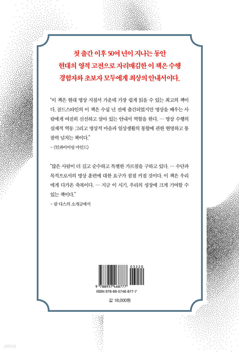 “이제 더 많은 이들이 깊고 순수하고 보다 특별한 가르침을 추구하고 있다. 이런 가르침을 얻기 위해서는 명상적 태도를 취해야 한다는 사실을 우리는 인식하고 있다. 따라서 수단으로서 그리고 목적으로서의 명상 훈련에 대한 요구가 점점 커질 것이다. 이 책에 소개하는 명상 강좌는 지금 이 시기, 우리의 이러한 성장에 크게 기여할 수 있을 것이다. 이 책은 우리에게 다가온 축복이다.” - 람 다스