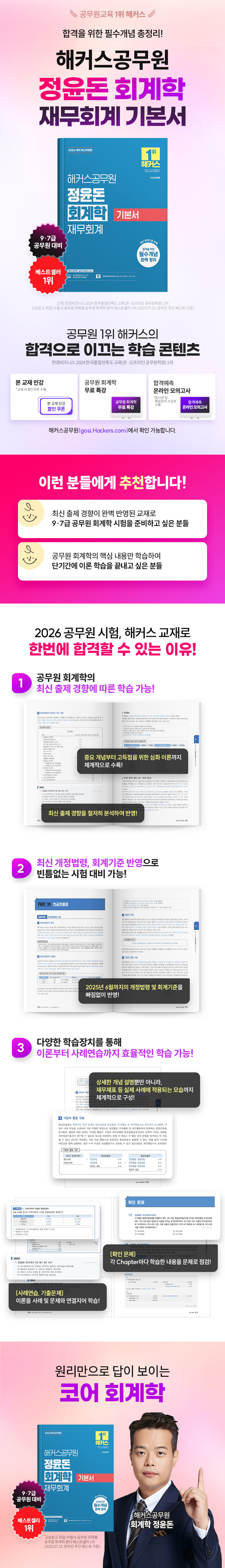 합격을 위한 필수개념 총정리! [이런 분에게 추천합니다] 1. 최신 출제 경향이 완벽 반영된 교재로 9, 7급 공무원 회계학 시험을 준비하고 싶은 분들 2. 공무원 회계학의 핵심 내용만 학습하여 단기간에 이론 학습을 끝내고 싶은 분들 [해커스 교재만의 특장점] 1. 2026년 9, 7급 공무원 대비! 공무원 회계학 최신 출제 경향에 따른 학습 가능 최신 출제 경향을 철저히 분석하여 반영하고, 반드시 알아두어야 할 기본 개념부터 고득점을 위한 심화 이론까지 체계적으로 수록하였습니다. 이를 통해 회계학을 공부하는 학습자들이 기초를 다지고 실력을 쌓을 수 있습니다. 2. 최신 개정법령, 회계기준 반영으로 빈틈없는 시험 대비 가능 2025년 6월까지의 개정법령 및 회계기준을 빠짐없이 반영하여, 법령 및 회계기준을 세부적으로 묻는 문제에도 완벽 대비가 가능합니다. 3. 다양한 학습장치를 통해 이론부터 사례연습까지 효율적인 학습 가능 1) 회계학 이론의 상세한 설명을 통한 개념학습뿐만 아니라 재무재표 등 실제 사례에 적용되는 모습까지 체계적으로 구성하여 유기적으로 학습할 수 있습니다. 2) 본문 곳곳에 ‘사례연습’, ‘기출문제’를 배치하여 이론을 사례 및 문제와 연결지어 학습할 수 있습니다. 3) 각 CHAPTER 말미에 ‘확인 문제’를 수록하여 해당 CHAPTER에서 학습한 내용을 문제로 점검할 수 있습니다. [공무원 시험 합격을 위한 해커스공무원만의 추가 학습 자료 (해커스공무원 gosi.Hackers.com)] 1. 본 교재 인강(할인쿠폰 수록) 2. 공무원 회계학 무료 특강 3. 합격예측 온라인 모의고사(응시권 및 해설강의 수강권 수록) [공무원 교육 1위] 한경비즈니스 2024 한국품질만족도 교육(온, 오프라인 공무원학원) 1위 |