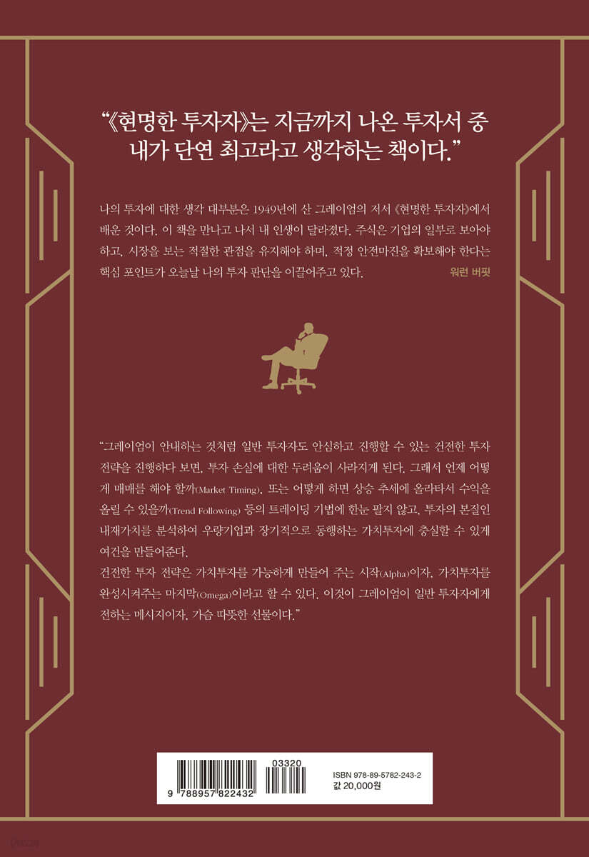 나의 투자에 대한 생각 대부분은 1949년에 산 그레이엄의 저서 《현명한 투자자》에서 배운 것이다. 이 책을 만나고 나서 내 인생이 달라졌다. 주식은 기업의 일부로 보아야 하고, 시장을 보는 적절한 관점을 유지해야 하며, 적정 안전마진을 확보해야 한다는 핵심 포인트가 오늘날 나의 투자 판단을 이끌어주고 있다. - 워런 버핏 (기업인) |