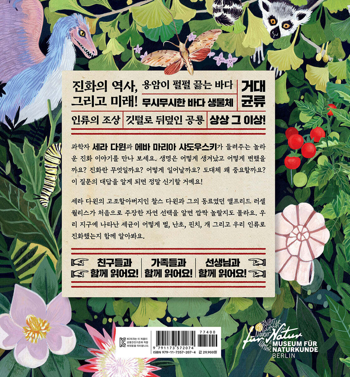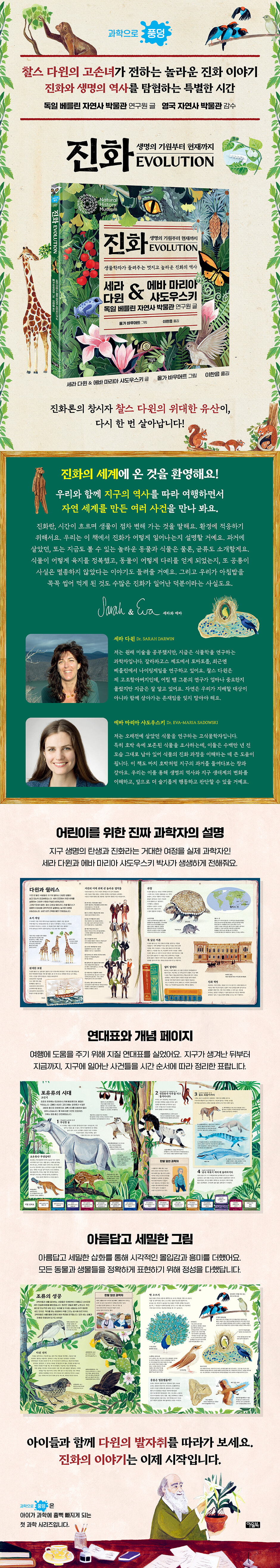 과학과 스토리텔링의 완벽한 조우 『진화 EVOLUTION』은 과학이 단순한 지식 전달을 넘어, 이야기로 다가갈 수 있다는 것을 보여주는 특별한 책입니다. 진화라는 복잡한 개념을 어린이의 눈높이에 맞춰 풀어내되, 그 과학적 깊이는 결코 가볍지 않습니다. 과학자이자 찰스 다윈의 고손녀인 세라 다윈 박사는 후손으로서의 자부심과 과학자로서의 진정성을 담아, 생명의 기원을 하나하나 되짚어 나갑니다. 공저자인 에바 마리아 샤도우스키 박사 역시 독일 자연사 박물관에서 활발히 활동 중인 과학자로, 두 사람의 협업은 책의 신뢰도를 한층 끌어올립니다. 이 책은 아이들이 과학적 사고를 기르는 데 있어 소중한 첫걸음이 되어 줄 것입니다. 연대표와 핵심 개념 설명 페이지, 그리고 세밀한 삽화들은 정보와 재미를 동시에 전하며, 아이들의 호기심을 자극합니다. 또한 영국 자연사 박물관의 감수는 이 책이 과학 교육서로서 갖는 권위와 신뢰를 더합니다. 『진화 EVOLUTION』은 어린이 독자뿐만 아니라 부모, 교사, 교육자 모두가 즐길 수 있는 책입니다. 생명의 신비를 함께 나누며, 우리가 어디에서 왔고 어디로 가고 있는지 깊이 생각해볼 수 있는 소중한 기회가 될 것입니다. |
