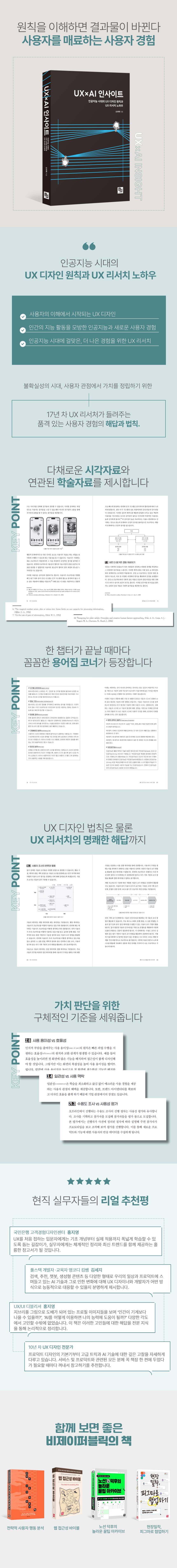 AI 기술이 일상화된 디지털 환경 속에서 사용자 경험(User eXperience, UX)의 설계가 어떻게 진화되어야 하는지 다각도에서 조망한 전문서입니다. 특히 검색, 추천, 챗봇, 생성형 콘텐츠 등 다양한 형태로 우리의 일상과 프로덕트에 스며들고 있는 AI 기술과 그로 인한 변화에 대해 UX 디자이너와 개발자가 어떤 방식으로 능동적으로 대응할 수 있을지 분명하게 제시합니다. - 김세지 (풀스택 개발자 ·교육자 영코디 킴쌤 )
