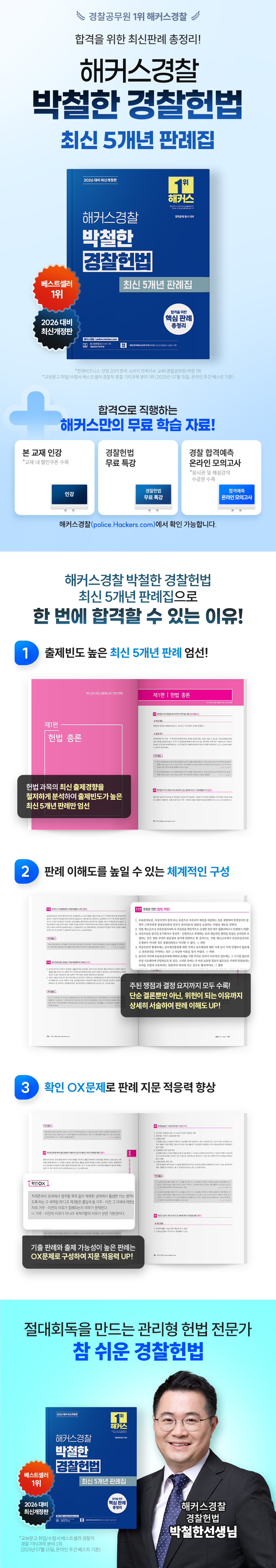 1. 출제빈도 높은 최신 5개년 판례 엄선 헌법 과목의 최신 출제 경향을 철저하게 분석하여 출제빈도가 높은 최신 5개년 판례만 엄선하였습니다. 2. 판례 이해도를 높일 수 있는 체계적인 구성 주된 쟁점과 결정 요지까지 담았으며, 단순히 결론뿐만 아니라 관련 기본권과 위헌이 되는 이유까지 상세히 서술하여 판례를 입체적으로 분석하고 파악해 판례의 이해도를 높일 수 있도록 하였습니다. 3. 확인 OX로 판례 지문 적응력 향상 기출 판례와 출제 가능성이 높은 판례는 OX문제로 구성하여 판례의 지문 적응력을 높이고 학습한 내용을 빠르게 점검할 수 있도록 하였습니다. |