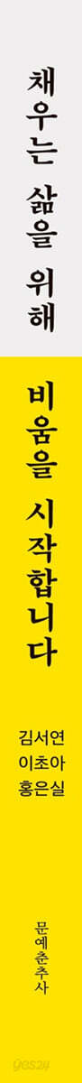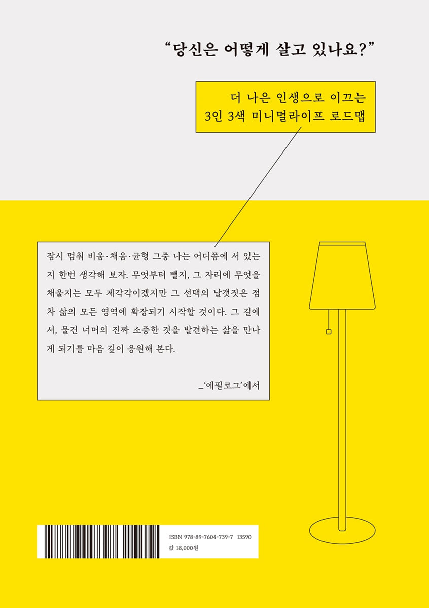 비우고 채우고 균형 잡아 완성한 3인 3색 미니멀라이프 ‘미니멀라이프’는 이제 너무나도 익숙한 라이프스타일 키워드가 되었다. 여섯 글자를 검색하면 미니멀라이프와 관련된 수많은 정보가 쏟아져 나온다. 하지만 과연 수많은 정보 틈바구니에서 미니멀라이프를 제대로 파악하고, 실천하고, 나아가는 사람이 얼마나 있을까? 셋이 합쳐 미니멀라이프 경력 32년 차인 김서연, 이초아, 홍은실은 《채우는 삶을 위해 비움을 시작합니다》를 통해 독자로 하여금 미니멀라이프의 중심을 잡도록 인도한다. 집 크기도, 소유한 것도, 가족 구성원도 제각각인 세 저자는 ‘완벽보다는 균형’을 모토로 미니멀라이프를 실천해 왔다. 각자의 관심사에 따라 전문성을 띠게 된 이들은 ‘돈’, ‘시간’, ‘건강’으로 분야를 나눠 미니멀라이프를 일상 가까이에 두는 방법을 소개한다. 미니멀라이프의 끝은 비움이 아니라, 그 너머의 ‘균형’을 보는 눈! 나 다운 방식으로 다시 채우는 삶의 기술 미니멀라이프를 추구하다 보니 오히려 물욕이 커졌다고 말하는 사람들에게 세 저자는 비우고, 채우고, 균형 맞추는 과정을 ‘돈’, ‘시간’, ‘건강’으로 분야를 나눠 섬세하게 알려 준다. 살림 경영가로서 미니멀라이프와 돈의 상관관계를 파악할 수 있도록 돕고(이초아), 루틴 디렉터로서 반복 업무를 줄이기 위한 기록법을 공유한다(홍은실). 또한 식이지도사로서 우리 몸에서 독소를 배출하는 건강한 방법도 알려 준다(김서연). 간결하고 꾸준하게 미니멀라이프를 실천하며 변화를 경험한 세 저자의 이야기는 이제 막 미니멀라이프를 시작한 사람들에게는 좋은 이정표가, 오랜 시간 미니멀라이프를 실천해 온 사람들에게는 신선한 자극이 될 것이다. 세 저자는 《채우는 삶을 위해 비움을 시작합니다》를 집필하며 ‘진짜 미니멀라이프의 끝은 완벽한 비움과 채움이 아니라 그 너머에 담긴 조화와 균형을 볼 줄 아는 눈을 가지는 것’이라는 결론에 도달했다고 말한다. 이 책과 함께 불필요한 것을 비우고, 원하는 것으로 채우고, 더 나은 조화와 균형을 이루며 물건 너머 소중한 것을 발견하기를 바란다. |