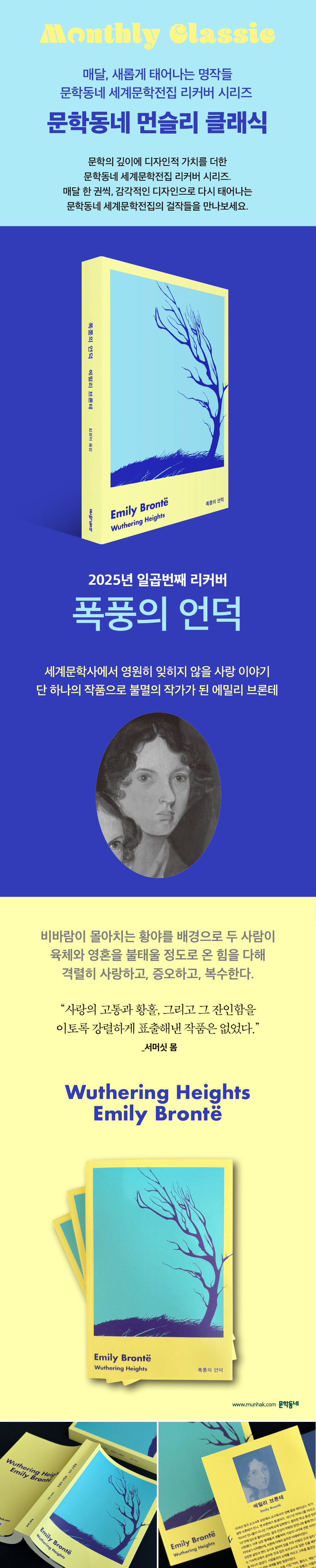에밀리 브론테의 아름답고도 열정적인 시어 “사랑의 고통과 황홀, 그리고 그 잔인함을 이토록 강렬하게 표출해낸 작품은 없었다.” _서머싯 몸 『폭풍의 언덕』은 영국 요크셔의 황량한 벽촌에서 서른 해의 짧은 생을 살다간 에밀리 브론테가 세상을 떠나기 1년 전 남긴 그녀의 유일한 장편소설이다. ‘폭풍의 언덕’이라는 저택을 배경으로 캐서린과 히스클리프의 격정적인 사랑을 그린 이 작품은 서머싯 몸이 선정한 ‘세계 10대 소설’ 중 하나이며, 셰익스피어의『리어 왕』멜빌의『모비 딕』과 더불어 영문학 3대 비극으로 꼽힌다. 전 시대를 통틀어 가장 아름다운 문학작품 중 하나로 평가받는 『폭풍의 언덕』은 열다섯 차례나 영화화되었고 연극, 드라마, 오페라 등으로 끊임없이 재생산되며 작가가 죽은 지 백오십년이 훨씬 지난 현재까지도 독자들의 뜨거운 사랑을 받고 있다. 문학동네 세계문학전집 86번으로 소개되는 『폭풍의 언덕』은 모던한 감각을 살린 표지와 에밀리 브론테의 아름다운 시어를 잘 살린 현대적인 번역으로 선보인다. 거칠고 삭막한 황야에서 정신적인 고독의 한계를 경험한 에밀리 브론테가 ‘자신의 상상력을 어두운 영혼에 내맡겨’ 창조한 캐서린과 히스클리프. 육체와 영혼을 불태우며 온힘을 다해 격렬하게 증오하고 사랑하며 자신의 정념에 충실했던 주인공들의 생생한 개성이 구어를 잘 활용한 번역으로 그려진다. “내가 그 애를 사랑하는 건 잘생겼기 때문이 아니야. 그 애가 나보다 더 나 자신이기 때문이야. 그 애의 영혼과 내 영혼이 뭘로 만들어졌는지는 모르겠지만 어쨌거나 같은 걸로 만들어져 있어. …… 모든 것이 사라진다 해도 그 애만 있으면 나는 계속 존재하겠지만, 모든 것이 그대로라 해도 그 애가 죽는다면 온 세상이 완전히 낯선 곳이 되어버릴 거야.” (본문 130p.) 에밀리 브론테는 『폭풍의 언덕』이라는 단 하나의 작품으로 불멸의 작가가 되었다. 요크셔 벽촌의 목사 딸로 태어나 정규교육을 많이 받지도 않았으며 평생을 시골집에서 살다가 서른 살에 미혼으로 죽은 한 여성이 남기고 간 소설 하나가, 시대를 초월해 사랑받으며 전 세계에 독자를 만들어냈다. 정신적인 고독의 한계를 경험하며 상상력의 환영을 키우고 문학만을 친구로 삼았던 에밀리 브론테는, V. S. 프리쳇의 말에 따르자면 “자신의 상상력을 어두운 영혼에 내맡겼다”. 그럼으로써 그녀는 세계 문학사에서 영원히 잊히지 않을 캐서린과 히스클리프라는 인물을 창조해냈다. 서른 해로 끝난 그녀의 삶에서, 그녀는 할 수 있는 것이 하나도 없었다. 그녀는 1818년에 태어났고, 요크셔의 목사관, 그 시골, 그 황야를 떠난 적이 없다. 그곳의 풍광의 혹독함은 아버지의 혹독함에 어울렸다. …… 에밀리는 줄곧 정신적 고독을 지켜냈고, 그로부터 상상력의 환영들을 키워갔다. 그녀는 밖으로 나오지 않았고, 밖으로 나타난 그녀의 모습은, 착하고 바지런하고 헌신적인, 상냥함 그 자체였다. 그녀는 모종의 침묵 속에 살아갔고, 외부 세계에서 그 침묵을 깨뜨린 것은 오직 문학뿐이었다. -『폭풍의 언덕』 작품해설 중에서 『폭풍의 언덕』이라는 제목은 소설의 주인공 캐서린과 히스클리프가 어린 시절을 보낸 저택의 이름 ‘Wuthering Heights’에서 왔다. ‘비바람이 몰아칠 때 높은 곳이 감당해야 하는 대기의 격동’을 가리키는 영국 북부의 방언 Wuthering은 소설의 전체적인 분위기를 드러내는 동시에 주인공들의 심리 상태를 나타낸다. 영국 신사 록우드가 ‘티티새 지나는 농원’을 빌려 세 들어 살기로 한 첫날, 어린 캐서린의 유령을 목격하면서 이야기는 시작된다. 록우드는 그 일로 저택 주인 히스클리프에 대해 호기심을 갖게 되고, 하녀장 넬리에게 히스클리프와 캐서린에 대한 회고담을 청해 듣는다. 그때부터 독자들도 넬리가 말해주는 3대에 걸친 사랑과 증오, 복수의 이야기에 빠져든다. 폭풍의 언덕은 로맨스 독자들이 흔히 요구하는 ‘낭만적 로맨스’를 제공하지는 않는다. 그럼에도 불구하고 독자들을 실망시키는 것이 아니라 오히려 더 큰 마음의 동요를 느끼게 한다. 그러한 힘은 작품이 현실적인 규범을 진지하게 대하는 데서 온다. 캐서린과 히스클리프는 현실에서 도피하거나 사회적인 가치를 무시하는 대신 현실 속에 존재하면서 그것에 대항해 싸운다. 사회적 가치라는 울타리에 둘러싸여 현실을 살아가는 독자들은 현실과 싸우는 그들의 사랑에 깊이 공감하며 빠져들고, 더욱 더 큰 공포와 연민을 느낀다. 19세기에 태어난 캐서린과 히스클리프가 지금까지, 그리고 앞으로도 독자들의 마음속에 살아 숨 쉬며 존재할 수 있는 가장 큰 이유이다. |