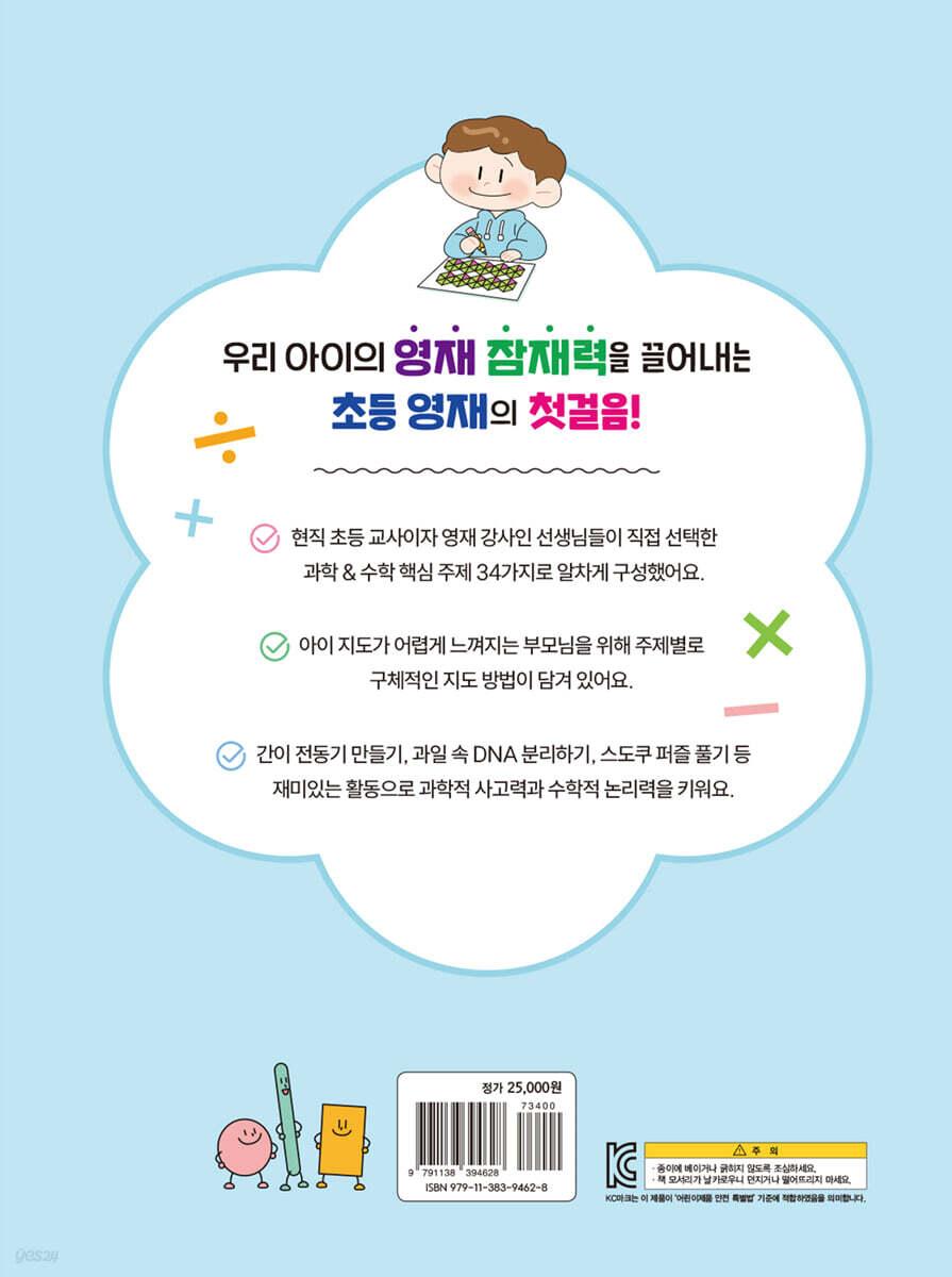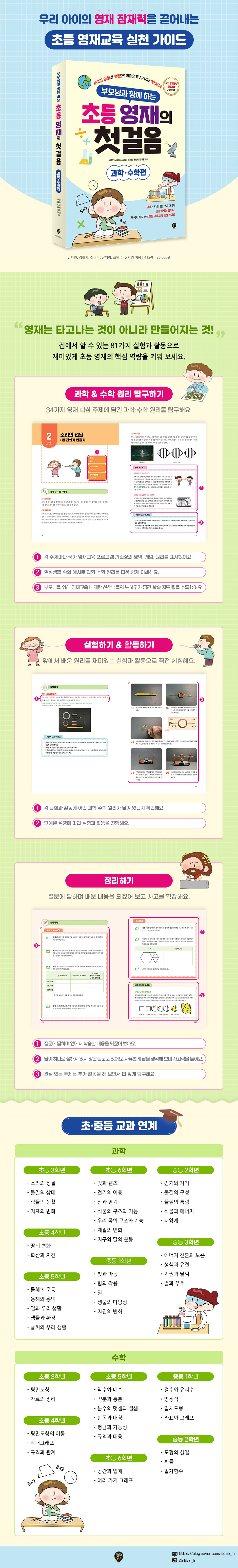 풍선 로켓으로 배우는 작용과 반작용부터 초코파이를 나누어 먹으며 배우는 분수까지 부모님과 함께 실험하고 탐구하며 영재 잠재력을 끌어내는 초등 영재교육 실천 가이드 『부모님과 함께 하는 초등 영재의 첫걸음: 과학·수학편』은 아이들이 영재교육에서 다루는 다양한 주제를 자연스럽게 접하고 스스로 탐구하는 재미를 느낄 수 있도록 도와주는 책입니다. 영재교육 경험이 풍부한 현직 초등학교 선생님들의 노하우를 바탕으로, 부모님과 아이가 함께 하는 81가지 실험과 활동을 통해 34가지 과학·수학 주제를 재미있게 학습할 수 있도록 구성했습니다. [1장 과학: 과학적 사고력을 키우는 나만의 실험]에는 18가지 과학 핵심 주제가 담겨 있습니다. 컵 전화기를 만들어 소리가 전달되는 원리를 이해하고, 딸기에서 직접 DNA를 추출해 형태를 관찰하고, 종이컵 풍속계를 만들어 바람의 세기를 알아보는 등 재미있는 실험을 통해 과학의 주요 원리를 학습할 수 있도록 구성했습니다. [2장 수학: 수학적 논리력을 키우는 창의 활동]에는 16가지 수학 핵심 주제가 담겨 있습니다. 초코파이를 나누어 먹으며 분수의 개념을 이해하고, 성냥개비로 여러 가지 형태를 만들며 평면도형의 성질을 알아보고, 주사위와 동전을 던져 경우의 수를 확인하는 등 다양한 활동을 통해 수학의 주요 원리를 학습할 수 있습니다. [답안과 부록]에는 1장과 2장에 나온 모든 문제의 답안과 일부 실험 및 활동에 필요한 도안, 스티커와 같은 부록이 수록되어 있습니다. 『부모님과 함께 하는 초등 영재의 첫걸음: 과학·수학편』으로 아이의 무한한 가능성을 키우는 여정을 시작해 보세요. 영재학급이나 영재원 입학만을 위한 단기적인 학습을 넘어, 스스로 생각하고 탐구하는 아이로 성장하는 첫걸음이 될 것입니다. 영재교육 베테랑 선생님들의 노하우를 담은 초등 영재교육 실천 가이드 81가지 실험과 활동으로 집에서 재미있게 시작하는 초등 영재교육의 첫걸음 초등 영재의 주요 역량을 키우는 34가지 과학·수학 핵심 주제 초등 영재교육의 핵심은 무엇일까요? 바로 영재의 주요 역량인 과학적 사고력과 수학적 논리력을 키우는 것입니다. 단순한 선행학습이나 문제풀이가 아니라, 아이가 스스로 배우는 즐거움을 느끼고 자연스럽게 탐구하는 습관을 만들 수 있는 접근법이 필요합니다. 이 책은 국가 영재교육 프로그램 기준에 따라 저자들이 직접 선정한 34가지 과학·수학 주제로 구성되어 있습니다. 각 주제별로 과학·수학 원리를 알아보고, 실험과 활동으로 원리를 체험하고, 문제와 추가 활동으로 앞서 배운 내용을 짚어 보는 일련의 과정을 통해 자연스럽게 초등 영재의 핵심 개념을 습득하고 주요 역량을 키울 수 있습니다. 학습의 흥미를 높이는 81가지 실험과 활동 각 주제의 주요 원리를 직접 체험해 볼 수 있는 81가지 실험과 활동을 담았습니다. 풍선 로켓 날려 보내기, 스마트폰으로 별자리 관찰하기, 여러 가지 스도쿠 풀기, 두 가지 암호로 비밀 메시지 보내기 등 다양한 실험과 활동을 통해 과학·수학 원리를 생생하고 재미있게 학습할 수 있습니다. 실험에서 어른의 도움이 필요한 부분, 실험이 끝난 후 주제와 연관지어 이야기를 나누면 좋은 내용 등 부모님이 참고할 수 있는 세부적인 지도 방법도 담겨 있습니다. 아이 지도가 어렵게 느껴지는 부모님들을 위한 구체적인 지도 방법 수록 아이의 학습 지도, 특히 과학과 수학 지도가 어렵게 느껴지는 부모님이라도 걱정하지 마세요. 매 주제마다 〈이렇게 도와주세요〉 코너에 영재교육 베테랑 저자 6인의 노하우가 담긴 구체적인 지도 방법을 수록했습니다. 어려운 개념어를 대체할 수 있는 쉬운 말, 아이의 호기심을 자극하기 위해 던지면 좋은 질문, 일상 속에서 보여주며 설명하면 좋은 예시 등 학습 효과를 높일 수 있는 다양한 팁이 담겨 있으니 참고해 보세요. |