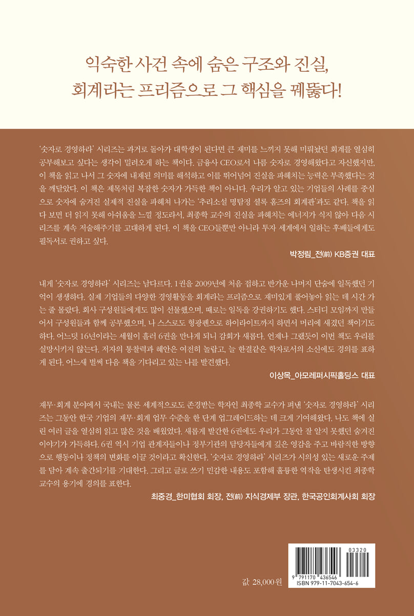 내게 ‘숫자로 경영하라’ 시리즈는 남다르다. 1권을 2009년에 처음 접하고 반가운 나머지 단숨에 일독했던 기억이 생생하다. 실제 기업들의 다양한 경영활동을 회계라는 프리즘으로 재미있게 풀어놓아 읽는 데 시간 가는 줄 몰랐다. 회사 구성원들에게도 많이 선물했으며, 때로는 일독을 강권하기도 했다. 스터디 모임까지 만들어서 구성원들과 함께 공부했으며, 나 스스로도 형광펜으로 하이라이트까지 하면서 머리에 새겼던 책이기도 하다. 어느덧 16년이라는 세월이 흘러 6권을 만나게 되니 감회가 새롭다. 언제나 그랬듯이 이번 책도 우리를 실망시키지 않는다. 저자의 통찰력과 혜안은 여전히 놀랍고, 늘 한결같은 학자로서의 소신에도 경의를 표하게 된다. 어느새 벌써 다음 책을 기다리고 있는 나를 발견했다. - 이상목 (아모레퍼시픽홀딩스 대표)