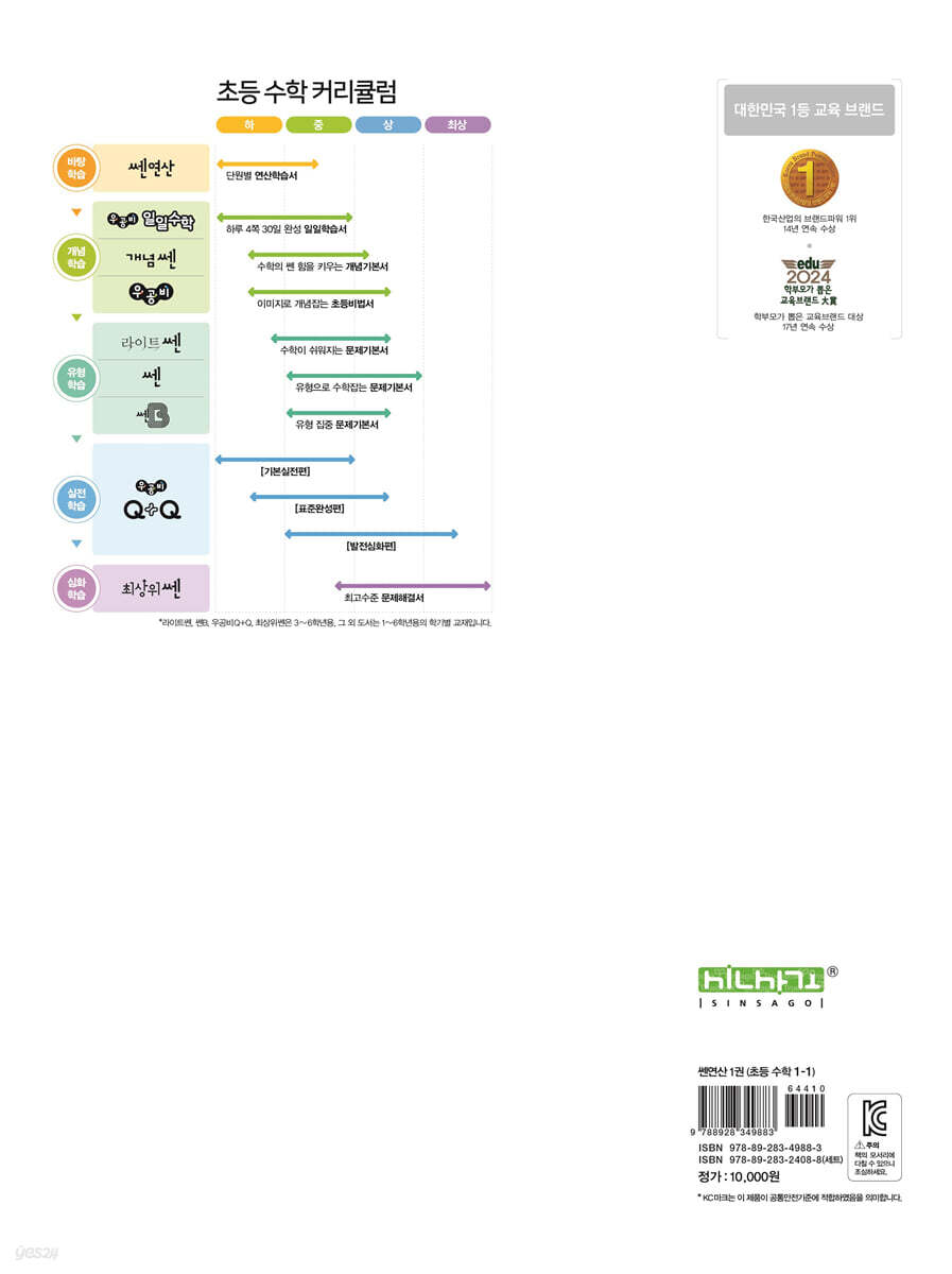 1. 한 권으로 끝내는 한 학기 완벽 연산학습 2. 효율적 연산학습 관리를 위한 학습진단표 제공 3. 연산 원리를 쉽고 오랫동안 기억하게 하는 이미지 연상 학습 4. 절대 밀리지 않는 하루 1장 구성 수학 연산의 답=쎈 『쎈연산』 『쎈연산』은 이미지 연상 학습법으로 쉽고 재미있게 연산 원리를 익히고, 반복 연산 훈련을 한 후 해당 연산이 실생활에 어떻게 접목되는지 활용하는 연습을 통해 문제해결력까지 키울 수 있도록 구성된 교재입니다. 또한 연산 영역뿐 아니라 도형, 측정, 규칙성, 자료 등 연산이 필요한 모든 영역의 문제를 제공하여 한 권으로 해당 학기의 연산 학습을 완벽하게 마스터 할 수 있는 단원별 연산강화 학습서입니다. |