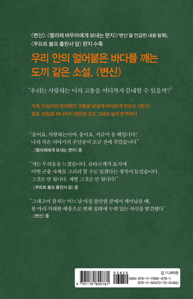 - 되도록 원문장 구조 그대로, 쉼표 마침표까지 살려 카프카의 숨결을 느끼게 하자고 역자와 의견을 나누었다. 마침 역자가 대학에서 학생들에게 변신을 많이 읽히고 그들의 깊은 반응을 경험했기에 원문에 가까운 번역이 가능했다. 특히 카프카와 그의 실제 아버지와의 관계를 많이 염두에 두었다. 그래서 폭력적이고 강압적인 아버지 앞에서 주눅들었던 그레고어의 모습이 잘 살아났다고 생각한다.