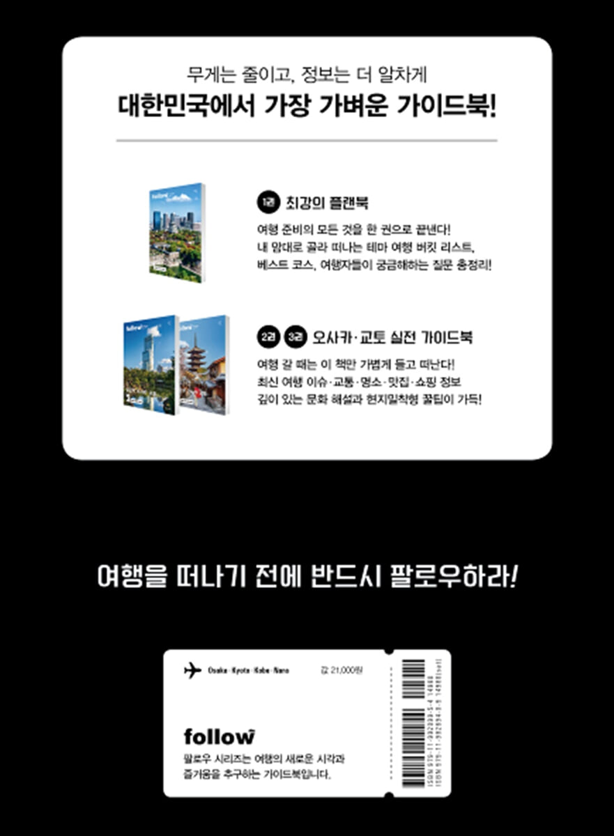 간사이 전 지역을 한 권에 담기보다, 1권 버킷 리스트 & 플랜북, 2권 오사카·고베·히메지성 실전 가이드북, 3권 교토·우지·나라·오하라 실전 가이드북으로 나누어 구성했다. 여행 목적지에 맞춰 필요한 권만 골라볼 수 있어 정보는 알차고, 여행 준비는 훨씬 가볍다. 2. 간사이의 생생한 현장 정보와 버킷 리스트, 2600여 컷의 사진으로 완성 천하의 부엌이라 불리는 오사카, 가장 일본다운 교토, 이국적인 항구도시 고베 등 간사이의 핵심 도시와 우지·나라·오하라 같은 특색 있는 소도시의 다채로운 매력을 균형 있게 담았다. 벚꽃과 단풍이 물든 계절 명소, 겨울밤을 수놓는 일루미나주, 대나무 숲 사이로 스며드는 햇살, 도톤보리의 네온과 사람들까지, 계절의 감성을 감각적인 사진으로 전한다. 꼭 경험해야 할 순간들을 모은, ‘테마별 버킷 리스트’가 여행의 깊이를 더하는 이 책의 강점이다. 3. ZONE별 핵심만 콕! 동선 중심 간사이 플래닝 전통 문화부터 MZ 감성까지, 간사이 트렌드를 완벽 분석했다. “오늘 어디 가지?” 고민은 이제 그만! 저자가 직접 두 발로 걸으며 선별한 ZONE별 분류와 엄선한 3가지 루트, 상세 지도는 구글맵보다 직관적인 여행 동선 설계가 가능하다. 오사카, 교토 처음 가는 사람도 이 책만 있으면 여행 만렙! 4. 오사카·교토 찐 맛집 270곳, 한눈에 정리! 오사카의 국룰 맛집부터 교토의 꼭 찾아가고 싶은 맛집, 감성 카페까지 음식 문화 전문가가 맛과 사진에 진심을 담아 270곳을 수록했다. 예약 필수, 현장 대기 여부는 물론, 예약 방법과 주문 요령, 대표 메뉴 등 꼭 필요한 실전 정보를 보기 쉽게 정리해 짧은 일정 중에도 놓치지 않고 들를 수 있도록 구성했다. 단순한 맛집 추천에 그치지 않고, 일본 전통 식문화도 엿볼 수 있는 풍성한 한 끼 한 끼의 큐레이션이다. 5. QR·IC카드·패스까지! 바뀐 오사카 교통 완전 정복 모바일 기반으로 개편된 오사카 최신 교통 정보를 빠짐없이 반영! 신용카드와 QR코드를 활용한 교통편 결제 및 탑승법부터 IC카드 충전 방법과 다양한 교통 패스 사용법까지, 오사카의 새로운 이동 방식을 총정리했다. 주요 지하철역, 버스 정류장, 랜드마크는 사진과 캡션으로 상세하게 안내해 초행자도 길 찾기 걱정 없이 이동할 수 있게 했다. 6. 줄 덜 서고, 더 재밌게! 유니버설 스튜디오 공략집 올랜도, LA, 그리고 오사카까지 아우르는 USJ 전문가의 노하우를 한자리에! 최적의 동선과 최소 대기 시간으로 즐기는 공략법은 기본! 닌텐도 월드 입장 확약권부터 파워업 밴드 200% 활용 팁까지, 실제 현장에서 체험으로 검증한 ‘진짜’ 알짜 정보만 담았다. 가장 효율적인 루트와 추천 맛집, 개념 지도까지 총정리해 후회 없는 하루를 완성한다. 7. 쇼핑은 취향대로! 꼭 가야 할 스폿만 쏙쏙 골라 쇼핑 대성공! 쇼핑 리스트는 넘쳐나는데 시간은 한정되어 있다면? 책 속 쇼핑 지도와 위치 정보를 한눈에 파악하기 쉽게 정리해, 시간을 아끼는 쇼핑이 가능하다. 기념품부터 편의점 간식, 드럭스토어, 한정판 주류, 돈키호테의 베스트템은 물론 캐릭터숍, 일본 인기 브랜드까지, 테마별로 꼭 가야 할 매장 리스트와 공략 아이템을 짚어준다. 모든 매장은 지도에 명확히 표시되어 있으며, 할인 쿠폰, 면세 꿀팁까지 챙겨 살수록 뿌듯한 쇼핑 경험을 보장한다. 8. 정보가 바뀌어도 걱정 NO! QR 스캔 한 번으로 최신 정보 바로 확인! 책 속 곳곳에 수록된 QR코드를 스캔하면 인기 미슐랭 맛집 리스트는 물론 바뀐 교통 상황과 이벤트 일정까지 즉시 확인할 수 있다. 종이책과 디지털 정보를 넘나들며 필요한 여행 정보를 바로 찾아볼 수 있어 예상치 못한 상황에도 스마트한 대처가 가능하다. 또한, 책에 소개된 모든 장소의 위치 정보를 내 구글맵에 저장할 수 있는 전용 지도 QR도 함께 제공한다. 9. 65장으로 짠 동선 최적화 지도와 꿀팁까지, 간사이 여행 완벽 대비! 저자가 현지에서 직접 걸으며 확인한, 구글맵에도 없는 디테일까지 담은 고퀄리티 상세 지도 65장을 수록했다. 여행 동선에 딱 맞춘 최적 루트와 주요 명소 인근 역 정보, 맛집과 쇼핑 특화 거리, 추천 스폿 위치를 한눈에 확인할 수 있다. 입국 서류, 숙소 예약, 컨택리스 카드, 데이터 유심 등 출발 전 꼭 알아야 할 준비물과 벚꽃·단풍 시즌, 계절별 날씨와 옷차림, 일본 생활 상식, 유용한 일본어, 긴급 상황 대처 등 현실 정보도 알차게 챙겼다. 오사카·교토의 복잡한 교통망과 필수 관광지 위치를 한눈에 볼 수 있도록, 실용적인 사이즈의 최신 교통 노선도를 부록으로 제공한다. |
