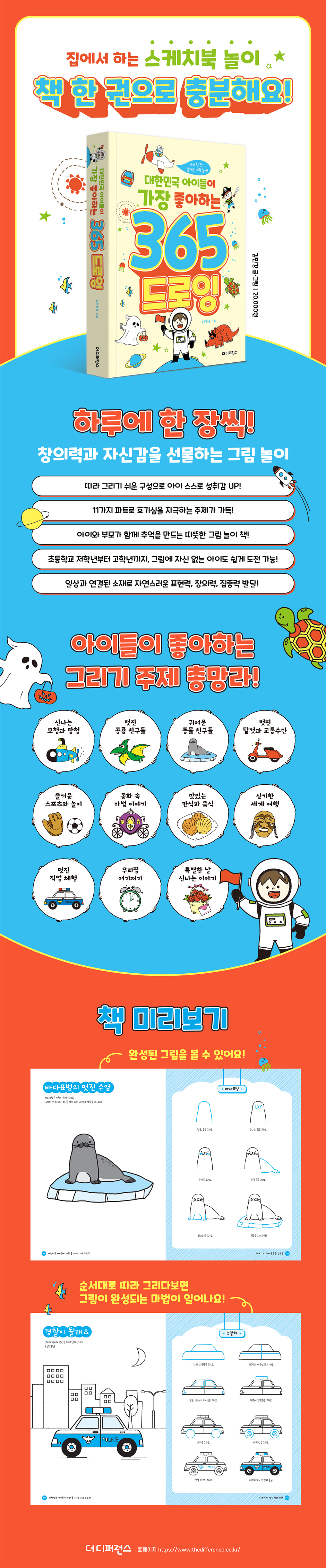 선 그리기 012 동그라미 그리기 014 세모 그리기 016 네모 그리기 018 그림 그리기 준비물 020 PART 1. 신나는 모험과 탐험 우주탐험 024 우주여행 026 나의 별을 찾아서 028 즐거운 캠핑 030 남극탐험 032 인디언을 만나다 034 야호, 정상이다! 036 바닷속 세상 038 바다의 무법자 해적 040 유령의 집 042 추억 만들기 044 PART 2. 멋진 공룡 친구들 티라노사우루스 048 스피노사우루스 050 벨로키랍토르 052 트리케라톱스 054 브라키오사우루스 056 스테고사우루스 058 프테라노돈 060 시조새 062 디플로도쿠스 064 파라사우롤로푸스 066 딜로포사우루스 068 디메트로돈 070 안킬로사우루스 072 PART 3. 귀여운 동물 친구들 동물의 왕 사자 076 줄무늬가 멋진 호랑이 078 코가 손인 코끼리 080 둥글둥글 판다 082 목이 긴 기린 084 날렵한 사냥꾼 여우 086 재주꾼 원숭이 088 꽃향기를 좋아하는 곰 090 멋진 돌고래 092 바다에 사는 고래 094 바다의 무법자 상어 096 바다표범의 멋진 수염 098 문어 친구 오징어 100 느림보 거북 102 개굴개굴 개구리 104 살금살금 꽃게 106 악어가 입을 쩍 108 나비와 여행 110 줄무늬 얼룩말 112 깔끔쟁이 너구리 114 우리 집 강아지 116 고양이 가족 나들이 118 달리기가 좋은 햄스터 120 먹보 대장 다람쥐 122 귀여운 토끼의 앞니 124 따라쟁이 앵무새 126 잠이 많은 코알라 128 느릿느릿 나무늘보 130 인기쟁이 장수풍뎅이 132 PART 4. 멋진 탈것과 교통수단 신나는 드라이브 136 부르릉 버스 타기 138 칙칙폭폭 기차여행 140 부릉부릉 오토바이 142 달려라, 자전거! 144 붕붕~ 스쿠터 146 하늘을 날아요 148 세계일주 150 스피드의 제왕 152 두둥실, 풍선을 타고 154 두두두두~ 헬리콥터 156 PART 5. 즐거운 스포츠와 놀이 슛돌이 160 내가 바로 홈런왕 162 덩크슛을 향해 164 배드민턴 왕자 166 전통 무술, 태권도 168 스피드왕 170 폴짝폴짝 줄넘기 172 PART 6. 동화 속 마법 이야기 유리구두의 주인공 신데렐라 176 요술거울과 백설공주 178 알라딘과 자스민공주 180 바닷속 인어공주 182 높은 탑 속의 라푼젤 184 요정 팅커벨 186 하늘을 나는 피터팬 188 빨간 모자 190 별나라에서 온 어린왕자 192 램프의 요정 194 도깨비의 요술방망이 196 마녀의 요술빗자루 198 마법의 성 200 달콤한 집 202 제일 작은 엄지공주 204 호박마차 206 PART 7. 맛있는 간식과 음식 깜짝 생일 파티 210 아이스크림 나라 212 냠냠, 맛있는 쿠키 214 달 모양 크루아상 216 달콤한 빵 천국 218 스테이크 샤토브리앙 220 바삭한 바게트 222 피크닉 가는 날 224 맛있는 수박 226 호호 불어 먹는 붕어빵 228 빙수야, 팥빙수야! 230 딸기 타르트 232 시원한 디저트 파르페 234 싸 먹는 크레페 236 조개 모양 쿠키 마들렌 238 친구의 생일 선물, 달콤 사탕 240 다양한 치즈 242 PART 8. 신기한 세계 여행 남산타워 246 대한민국 국보 숭례문 248 독도는 우리 땅 250 제주도 돌하르방 252 한국의 탈, 하회탈 254 에펠탑 256 자유의 여신상 258 스핑크스 260 타지마할 262 피사의 사탑 264 PART 9. 멋진 직업 체험 의사가 될래요 268 삐뽀삐뽀 앰뷸런스 270 용감한 경찰 272 경찰이 될래요 274 삐뽀삐뽀 276 오늘은 내가 요리사 278 호기심 과학실 280 몽마르트 언덕 화가의 거리 282 아름다운 샹송 284 우리 팀, 파이팅! 286 얼음 위의 요정 288 스튜어디스 290 애완동물의 꽃단장 292 PART 10. 우리집 여기저기 나의 침대 296 컴퓨터를 배워요 298 용돈 벌기 300 스스로 숙제해요 302 요술쟁이 화장대 304 외출 준비 306 반짝반짝 구두 308 매일 들고 싶은 가방 310 반짝반짝 주얼리 312 옷장 속 나의 옷 314 퐁퐁, 거품놀이 316 패션의 완성 318 배부른 돼지 저금통 320 PART 11. 특별한 날 신나는 이야기 산타할아버지가 오신대! 324 해피 크리스마스 326 내 친구 눈사람 328 신나는 할로윈데이 330 졸업을 축하해 332 마음을 담은 카네이션 334 새 학기 첫날 336 예쁜 꽃다발 338 보석 같은 눈송이 340 설날 인사 342 내가 그린 그림 344 찾아보기 350 |