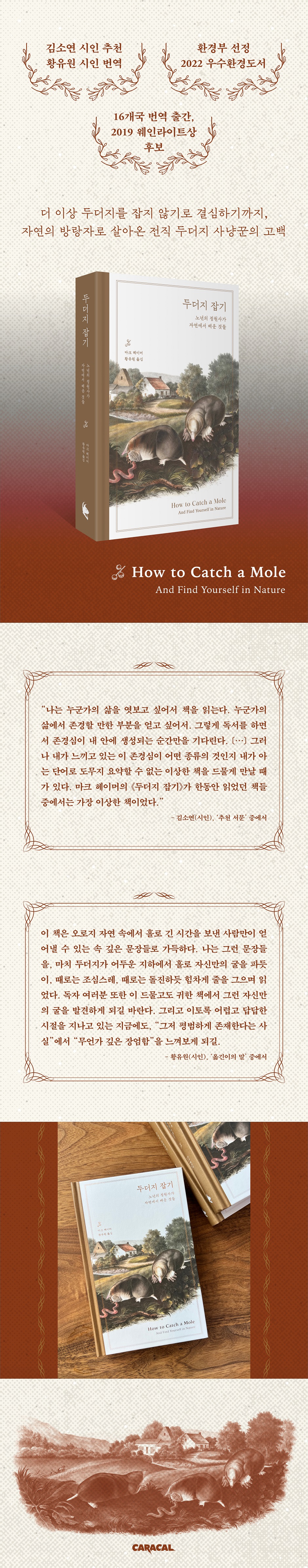 김소연 시인 추천, 황유원 시인 번역환경부 선정 2022 우수환경도서2019 웨인라이트상 자연 부문 후보미국서점협회 추천 도서, 16개국 번역 출간“헤이머는 그가 자연으로부터 겪어온 것들을 광활하게 펼쳐 보인다.마침내 왜곡 없이 우리가 자연의 본성을 이해하도록.”- 김소연 시인, ‘추천 서문’ 중에서“이 책은 오로지 자연 속에서 홀로 긴 시간을 보낸 사람만이얻어낼 수 있는 속 깊은 문장들로 가득하다.”- 황유원 시인, ‘옮긴이의 말’ 중에서친근하지만 미지의 영역에 있는 동물, 두더지두더지는 대개 비밀스럽고 신비로운 동시에 유쾌하고 귀여운 동물로 받아들여진다. 저명한 아동 문학 《버드나무에 부는 바람》에 등장하는 두더지는 순수하고 온화한 성격에 책을 즐겨 읽는다. 카카오프렌즈의 인기 캐릭터 ‘제이지’는 힙합을 좋아하는 발랄한 성격의 두더지로, 아이 어른 할 것 없이 많은 이에게 사랑받는다. 뿅망치로 머리를 때려잡는 ‘두더지 잡기 게임’은 누구나 한 번쯤 해본 적 있는 흥미진진한 놀이다. 하지만 두더지의 진짜 모습은 우리가 흔히 접해온 그런 모습들과는 조금도 같지 않다. 우리는 두더지를 모른다.두더지는 세계 곳곳의 전원 지역에 서식하며, 한국에도 많은 수의 두더지가 산다. 농경지나 정원에서 두더지는 큰 골칫거리 중 하나다. 땅 위로 잘 올라오지 않는 습성상 직접 마주하기란 쉽지 않지만, 토양을 헤집어 농작물에 피해를 주는 두더지로 적잖은 농가가 골머리를 앓는다. 인류는 오래전부터 두더지와의 싸움을 벌여왔다. 고대 로마 시대에는 땅에 물항아리를 묻어 두더지를 잡았다. 16세기 중반 식량난에 처한 영국에서는 국가가 두더지잡이를 장려함으로써 공인된 전업 두더지 사냥꾼들이 생겨났다. 그 후 영국에서는 두더지잡이가 일종의 전통적 사냥술로 인정받을 만큼 대중화되었다. 영국 내 두더지의 개체 수는 약 4천만 마리로 추산된다.우리나라에서도 다양한 두더지 퇴치술과 사냥법, 퇴치 기기 따위가 농부들과 정원사들 사이에서 많은 관심을 끈다. (유튜브에는 두더지 퇴치 관련 영상만 수백 건이 올라와 있다.) 두더지는 아이들이나 도시인들에겐 귀엽고 친근한 존재일지 모르지만, 농촌이나 교외 지역에선 땅속의 무법자로 불리며 농업 종사자들의 분노를 불러일으키는 유해 동물로 분류되곤 한다. 마크 헤이머는 이 책에서 그러한 두더지의 생태와 그들의 습성에 깃든 다양한 진실을 전한다. 동시에 농사와 원예를 망치는 야생동물로서만이 아닌, 보이지 않는 곳에서 묵묵히 자기의 삶을 일구어가는 한 생명체로서의 두더지의 모습 또한 들여다본다.자연의 방랑자로 살아온 두더지 사냥꾼의 이야기두더지는 평생을 홀로 지낸다. 어둠 속에서, 친구나 가족 없이, 집단 정체성 없이, 혼자 굴을 파고 혼자 먹이를 잡고 혼자 보금자리를 만들며 살아간다. 이 책의 저자 마크 헤이머도 10대 시절 중요한 성장기를 그렇게 보냈다. 어릴 적 집안에서 혼자 채식주의자로 지내며 가족들과 충돌하거나 놀림받았던 그는, 열여섯 살에 어머니를 여읜 후 아버지의 반강제적 권유로 집을 나와 2년 가까이를 부랑자로 살았다. 위험한 어른들을 피해 숲속에서, 부둣가에서, 생울타리 아래에서 몸을 숨긴 채 잠을 잤다. 쟁여둔 캔이나 훔친 빵을 먹거나, 먹을 게 없으면 굶었다. 봄, 여름, 가을에는 쉬지 않고 걸었고, 겨울에는 상점에서 일하며 버려진 아파트에서 히피들과 함께 살았다.10대의 헤이머에게 홈리스로 지낸 그 시간이 외롭고 힘들기만 한 것은 아니었다. 그는 숲속과 강가에서 함께 잠을 자던 야생 생물들과 자기 자신이 똑같은 존재라는 사실을 알아갔다. 낮에는 걷는 동안 온갖 식물이 열매를 맺고 잎사귀를 떨구는 모습을 지켜봤고, 밤이면 보초를 서는 검은지빠귀의 울음소리를 들으며 잠에 들었다. 실로 그는 자연 ‘속에’ 있지 않았다. 그가 곧 자연이었다. 자기 안의 자연과 가까워짐에 따라 헤이머는 동물로서의 감각을 활짝 열고서 하루하루를 자연 그 자체로 살았다. 헨리 데이비드 소로가 《월든》에서 말한 “나는 정신적인 삶을 추구하는 본능과 원시적인 삶을 갈망하는 본능이 나 자신 안에 공존하는 것을 느꼈다. 나는 선한 것 못지않게 야생적인 것을 사랑한다.”라는 구절을 몸소 체현했다.그렇게 2년에 가까운 시간을 보낸 뒤 친척 집을 찾아가 일자리를 얻으면서 부랑자의 삶은 끝이 났지만, 이때의 경험은 그의 여년에 소중한 토양이 되었다. 수많은 직업을 거친 끝에 정원사가 된 헤이머는 일이 없는 겨울철에 두더지잡이로 생계를 유지할 수 있었고, 자연 속에서 쉬지 않고 걸었던 10대 때처럼 들판을 걸으며 자연과의 합일이 주는 무구한 기쁨을 누렸다. 유년 시절부터 노년에 이르기까지 자연과 함께해 온 삶이 그에게 남긴 흔적과, 자연을 향해 그가 느끼는 경외, 그리고 그런 감정조차 아무것도 아닌 것으로 만드는 대지와 태양의 압도적인 능력을 실감했다. 자연을 길들이는 인간과 자연을 파괴하는 인간, 자연의 가치를 받아들이는 인간의 다양한 면면을 돌아보았다. 삶에 있어 중요한 것이 무엇인지 조금씩 깨닫게 되었다.굴을 파듯 자기 앞의 삶