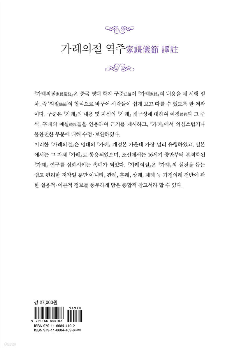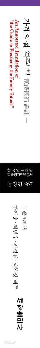 해제_7 일러두기_18 가례의절 서文公家禮儀節 序 가례의절 서家禮儀節序 21 문공가례 서文公家禮序 29 가례의절 권1文公家禮儀節卷之一_통례通禮 사당祠堂 51 통례여주通禮餘註 78 통례고증通禮考證 88 부인배고증婦人拜考證 101 심의제도深衣制度 109 심의고증深衣考證 125 온공의 『거가잡의』溫公『居家雜儀』 149 통례도通禮圖 157 가례의절 권2文公家禮儀節卷之二_관례冠禮 관冠 183 계? 224 관례여주冠禮餘註 231 관례고증冠禮考證 235 관례도冠禮圖 247 가례의절 권3文公家禮儀節卷之三_혼례昏禮 의혼議昏 251 납채納采 252 납폐納幣 264 친영親迎 272 부현구고婦見舅姑 288 묘현廟見 295 서현부지부모壻見婦之父母 298 혼례여주昏禮餘註 303 혼례고증昏禮考證 310 혼례도昏禮圖 322 |