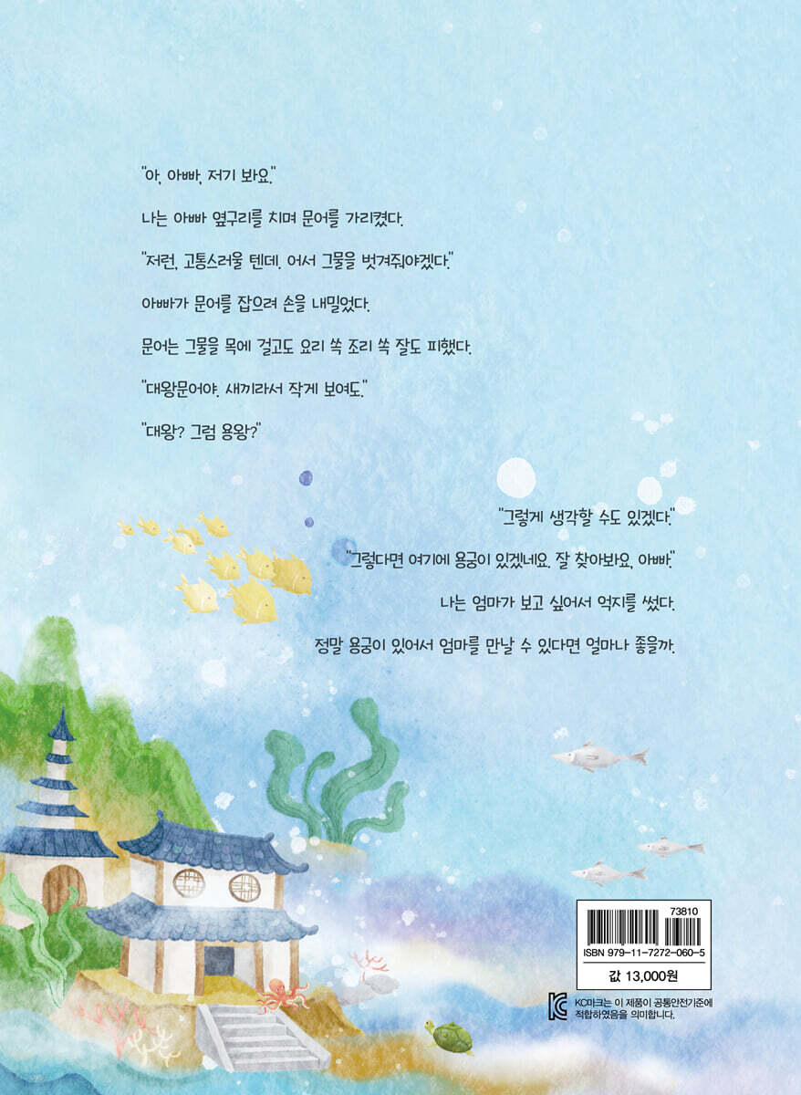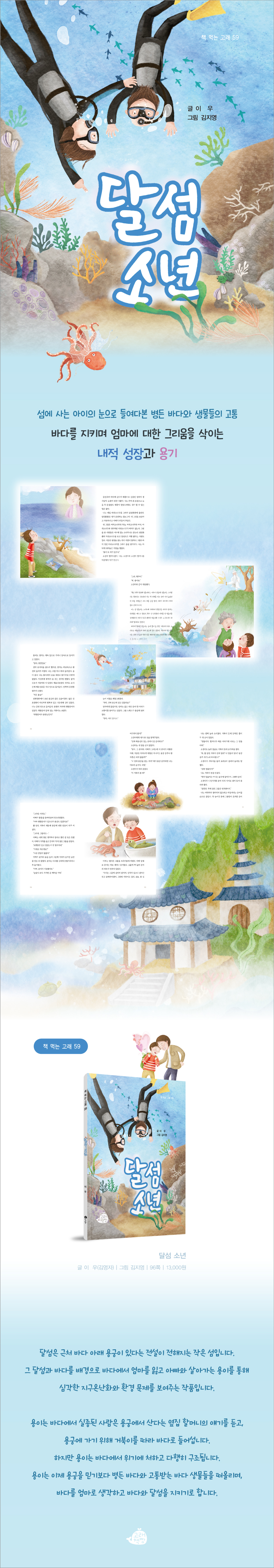 1. 달섬의 전설 2. 용궁이 진짜 있을까? 3. 병든 해송산호 4. 아빠의 고민 5. 그물 문어와 뿔 달린 거북 6. 거북이를 따라서 7. 엄마 바다 8. 환경예술제 그림 9. 바다 수호천사 |