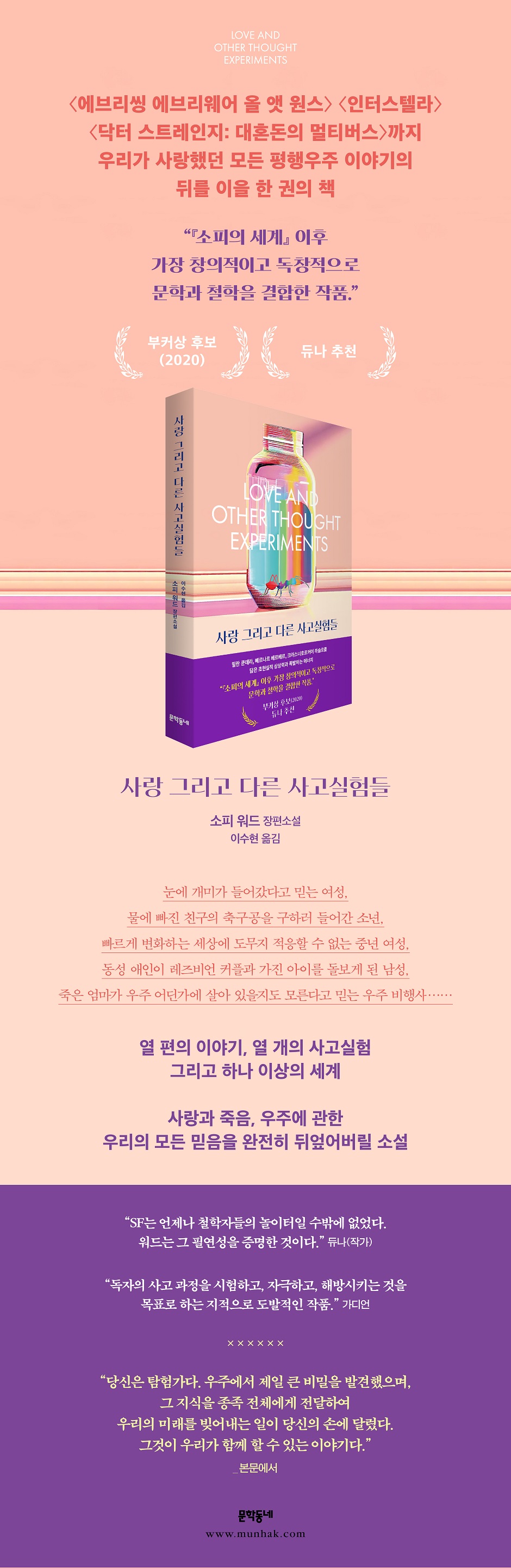 삶과 죽음, 그리고 다시 삶 그 우연과 운명의 굴레 속에서 합리성을 중시하는 과학자 일라이자에게 레이철은 때론 철없고 비현실적이지만 사랑스러운 연인이다. 두 사람은 아이를 낳는 문제에 대한 의견 차이로 다투기도 하지만 대체로 평온한 나날을 보내고 있었다. 개미가 나타나기 전까지는. 레이철은 집에 나타난 개미 때문에 심한 공포를 느끼고, 어느 날 밤 급기야 개미가 자신의 눈에 들어갔다고 확신하게 된다. 일라이자는 그 말을 믿을 수 없지만 레이철이 그런 태도에 상처받자 믿는다고 거짓말을 한다. 개미 사건 이후 더욱 굳건해진 두 사람은 게이 친구인 할의 정자를 받아 아기를 낳고, 아들 아서가 태어난다. 그러나 운명의 장난처럼 레이철은 아서를 낳고 얼마 지나지 않아 발병한 뇌종양으로 인해 세상을 떠나게 된다. 남겨진 일라이자와 할, 그리고 할의 연인인 그레그는 레이철의 빈자리를 채우기 위해 부단히 노력하며 아서를 함께 키운다. 죽음을 이해하지 못하는 어린 나이에 엄마와 이별한 아서는 사라진 레이철을 계속해서 그리워한다. 기계진동학 기술자인 그레그가 학교에 아서를 데리러 온 날, 그와 이야기를 나누던 아서는 조건만 맞는다면 인간이 우주에서 살 수 있다는 사실을 알게 된다. 그렇다면 이곳을 떠난 엄마 레이철도, 우주 어딘가에는 살고 있지 않을까? 모든 게 딱 맞는 어떤 곳이라면 말이다. 그런 믿음을 품게 된 아서는 레이철을 만날 수 있을지도 모른다는 일념으로 우주 비행사를 꿈꾸게 된다. 하나 이상의 세계를 향하여 우주를 뛰어넘는 사랑의 힘 슬프지만 아름다운 가족 서사는 시공간을 확장하며 이야기의 줄기를 뻗어나간다. 협력과 배신 중 단기적으로는 배신이 유리해 보이지만, 장기적으로는 협력이 유리함을 이야기하는 사고실험 ‘죄수의 딜레마’에서 영감을 얻은 「게임 체인저」는 아서의 할아버지가 소년이던 시절을 다룬다. 물에 빠진 친구의 공을 구하러 뛰어들어간 소년에게는 세 개의 다른 세계가 기다리고 있다. 하나, 친구와 협력해 살아남는다. 둘, 친구에게 배신당했지만 끝끝내 살아남는다. 그리고 셋, 홀로 죽는다. 이 다른 세 가지 결말은 이어지는 이야기에 지대한 영향을 끼친다. 한편 「아마이징」과 「제우스」의 화자는 개미다. 이야기의 시작점에서 레이철의 눈 안으로 들어간 바로 그 개미. 눈에 개미가 들어갔다는 레이철의 주장이 사실이었다는 점에 놀랄 새도 없이, 이야기는 곧장 인간의 뇌에 들어간 개미가 어디까지 갈 수 있는지를 보여준다. 개미는 레이철의 뇌 속에 자라나는 종양과 지식을 먹이삼아 몸집을 키워나간다. 인간의 정보를 꼼꼼히 흡수한 개미는 점차 고도로 발달한 인공 지능의 모습을 닮아간다. 소설 『사랑 그리고 다른 사고실험들』은 철학과 문학을 결합해 지적 자극을 주는 SF소설이다. 정교히 구성된 이야기를 따라가며 작가가 곳곳에 숨겨둔 퍼즐 조각을 발견하는 쾌감은 이루 말할 수 없을 정도다. 화려하고 예측이 불가하며 형이상학적이라는 말이 잘 어울리는 특별한 소설이지만, 작품을 제대로 맛보기 위해 독자가 잊지 말아야 할 중요한 키워드는 단 하나다. 그것은 제목이 알려주고 있듯, 바로 ‘사랑’이라는 우리에게 가장 익숙한 사고실험이다. 믿기 어려운 것을 믿게 하고, 기꺼이 비합리적인 선택을 하게 하고, 때론 지구 밖으로 나아갈 용기를 주며 심지어는 하나의 우주를 뛰어넘을 수도 있게 만드는 힘. 그런 사랑의 힘을 알고 있다면, 알고 싶다면 이 책을 펼쳐보길 권한다. 사랑과 다른 사고실험들의 놀라운 결과를 바로 이 책에서 확인해보기를.