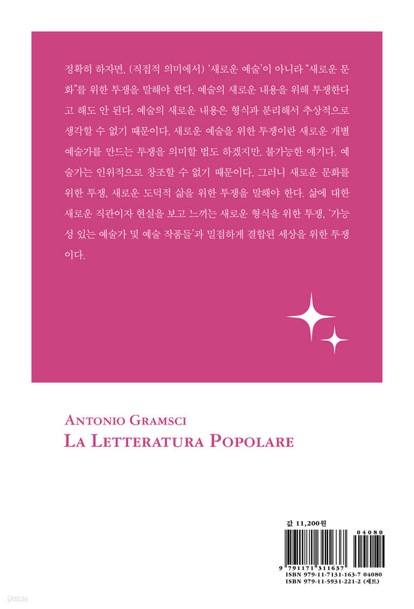 --- 「들어가는 말」 중에서 이탈리아 국가 건설기에 나타난 여러 문제 속에 협조와 종속의 그물이 존재한다는 의식이 지식인 계층과 지배 계급에 게는 없었다. 어느 누구도 이 문제들을 서로 일정한 관계를 맺고 있는 하나의 몸통으로 제시하지 않았다. 그저 그때그때의 관심사에 따라 시대적으로 뿔뿔이 흩어져 있는 개별 논점을 끄집어냈고, 그마저도 뭐가 문제인지 명확하게 표명한 적이 없었으며, 문제를 천착할 의지도 보이지 않았다. 그래서 논의는 추상화된 형태의 문화와 지성이 되어버렸고, 역사적 전망도 없었기 때문에, 구체적이고 일관된 정치사회적 해결방식을 조망할 여지도 없었다. --- 「제1장 문제」 중에서 정확히 하자면, (직접적 의미에서) ‘새로운 예술’이 아니라 ‘새로운 문화’를 위한 투쟁을 말해야 한다. 예술의 새로운 내용을 위해 투쟁한다고 해도 안 된다. 예술의 새로운 내용은 형식과 분리해서 추상적으로 생각할 수 없기 때문이다. 새로운 예술을 위한 투쟁이란 새로운 개별 예술가를 만드는 투쟁을 의미할 법도 하겠지만, 불가능한 얘기다. 예술가는 인위적으로 창조할 수 없기 때문이다. 그러니 새로운 문화를 위한 투쟁, 새로운 도덕적 삶을 위한 투쟁을 말해야 한다. 삶에 대한 새로운 직관이자 현실을 보고 느끼는 새로운 형식을 위한 투쟁, ‘가능성 있는 예술가 및 예술 작품들’과 밀접하게 결합된 세상을 위한 투쟁이다. --- 「제2장 새로운 예술」 중에서 이탈리아 대중이 외국 작가를 편애한다는 말은 무슨 뜻인가? 이탈리아 대중이 외국 지식인들이 확보한 지적·도덕적 헤게모니 아래에 있다는 말인가? 다시 말해 이탈리아 대중이 자기 나라 지식인보다 외국 지식인들에게 더 큰 연대감을 느끼고, 그래서 이 나라에는 지적·도덕적인 국민 유대가 없다는 말인가? [이탈리아에] 대중 출신의 지식인은 없다. 간혹 있긴 하지만, 그들은 대중과의 연대감을 느끼지 않는다(수사적으로 느낄지는 모르겠다). 지식인들은 대중을 모르고 대중의 필요를 느끼지 못하며, 대중의 열망과 정서도 모른다. 그래서 지식인들은 대중의 저편에 서 있는, 따로 떨어져 공중에 흩어진 무엇과도 같다. 지식인은 특권 계급이며, 대중과 유기적인 관계를 맺지도, 주어진 역할을 해내지도 못한다. --- 「제3장 대중의 개념」 중에서 근대 세계에서 이런 문제는 실존의 강제적 합리화가 중산 지식인 계급에게 유례없이 점점 더 강하게 침투함에 따라 과거와는 다르게 나타난다. 그러나 중산 지식인 계급에서도 문제는 모험의 쇠진이 아니라 일상적 삶의 과도한 모험성, 즉 실존의 과도한 불확정성에 있다. 그러한 불확정성에 맞서는 개인의 방어책은 없다. 따라서 우리는 주도권을 자유로이 행사하여 ‘추하고’ 불쾌한 모험을 거부할 때, 그리고 다른 사람들이 하지 않은 새로운 상황을 만들 때, ‘멋지고’ 흥미로운 모험을 경험할 수 있다. --- 「제4장 대중 문학」 중에서 이탈리아의 예술적 ‘민주주의’에는 왜 음악적 표현만 있을 뿐 ‘문학적’ 표현은 없는가? 언어가 국민적이 아닌 세계적이었다는 것(음악이 그러했다)은 이탈리아 지식인들이 국민--- 「대중적 특성을 결여한다는 점과 관련이 있는가? 모든 나라에서 지식인들의 자발적 국민화가 확고히 일어나고, 이런 현상이 비록 그 수위가 낮긴 했지만(18세기, 특히 18세기 후반에도 세계적이기보다는 국민적이었다) 어쨌든 확인되는 바로 그 당시에, 이탈리아 지식인은 음악을 통해 유럽인의 역할을 계속 해나간다. 우리는 [음악, 특히 오페라] 대본의 줄거리가 전혀 ‘국민적’이지 않고 유럽적이라는 사실을 확인할 수 있다. --- 「제5장 대중 문화」 중에서 그람시는 왜 대중 문학을 주목하는가? 사실 그람시가 말하는 대중과 국민의 개념은 고정되어 있지 않다. 맥락에 따라, 추구하고 지향하는 바에 따라 외피가 변한다. 그람시가 말하는 국민과 대중은 지식인의 사명의식과 실천이 깃든 개념이다. 그들은 지식인들과 함께 공동의 지평을 향해 나아가는 집단이다. 문학은 국민적일 때 대중적이고, 대중적일 때 국민적이다. 따라서 국민--- 「대중 개념을 추구하고 지향하는 것이 문학의 바람직한 형태다. 그것을 그람시는 지적, 도덕적 내용을 갖춘 문학이라고 말한다. --- 「해제」 중에서 |
