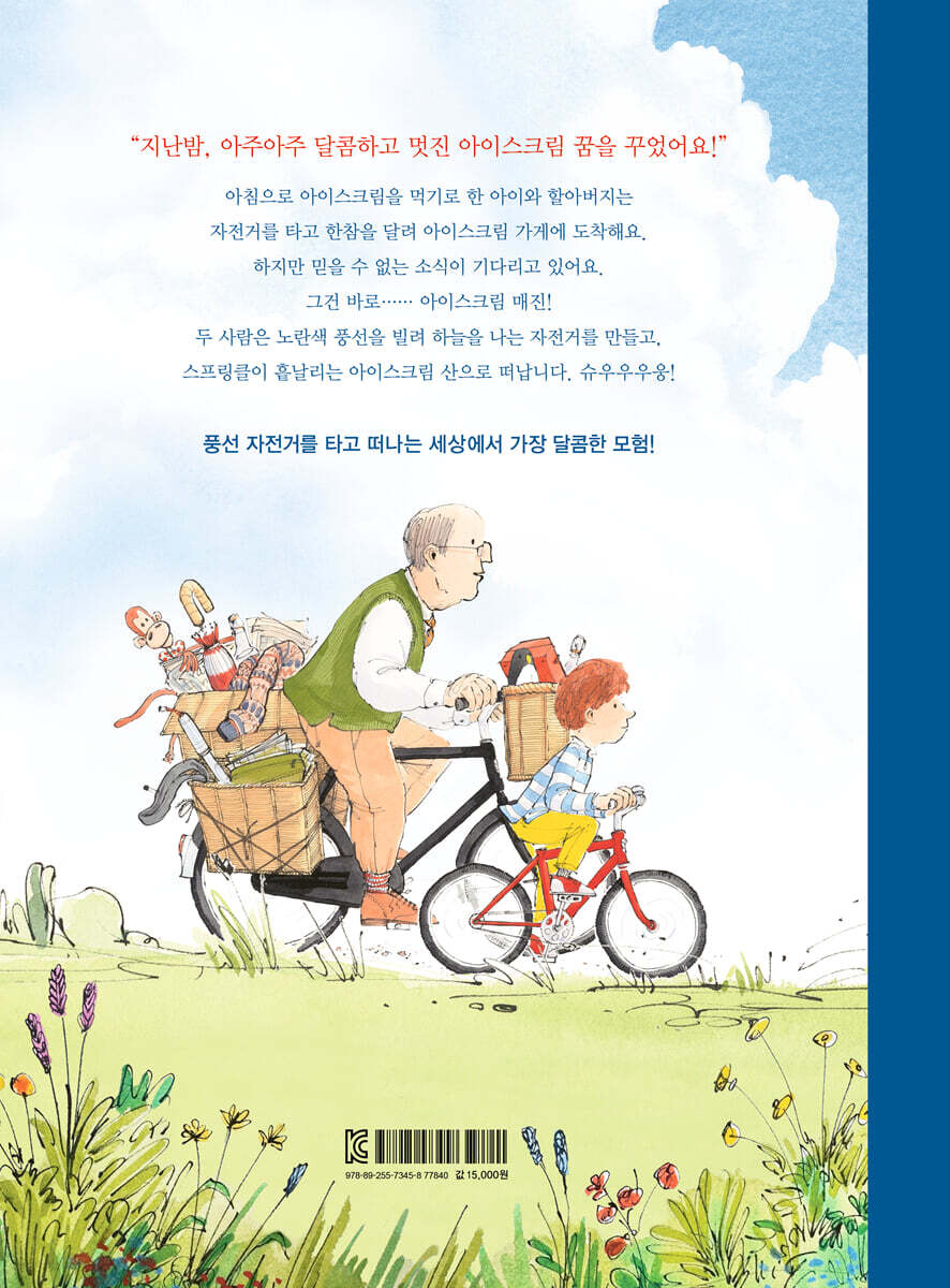 지난밤, 아이스크림 꿈을 꾼 아이는 할아버지에게 아침으로 아이스크림을 먹자고 제안한다. 할아버지는 흔쾌히 손자의 제안을 받아 주고, 아이는 아이스크림을 먹을 생각에 한껏 신이 난다. 출발하려는 순간, 자전거 바퀴의 공기가 다 빠져 있는 걸 발견하고 바퀴에 공기를 채우고, 미처 챙기지 못한 준비물도 챙긴다. 드디어 준비 완료! 두 사람은 열심히 달려 아이스크림 가게에 도착하지만, 믿을 수 없는 소식을 듣는다. 바로 아이스크림이 다 팔린 것! 하지만 아이는 슬퍼하고만 있지 않는다. 아이스크림 가게에서 노란색 풍선 하나를 빌려 바람을 채우고 뚝딱뚝딱 무언가를 만들더니, 저 멀리 아이스크림 산을 향해 날기 시작한다. 과연 하늘을 날아 도착한 아이스크림 산에서는 어떤 기적 같은 모험이 두 사람을 기다리고 있을까?