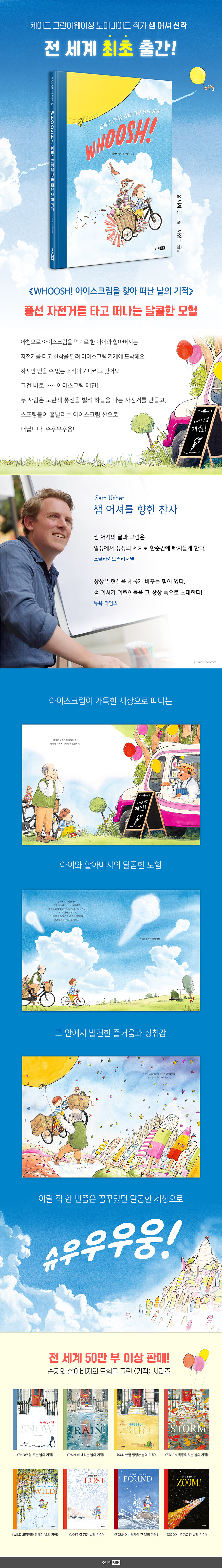 아이와 할아버지의 달콤한 모험 지난밤, 아이스크림 꿈을 꾼 아이는 할아버지에게 아침으로 아이스크림을 먹자고 제안한다. 두 사람은 한참을 달려 아이스크림 가게에 도착하지만, 믿을 수 없는 소식을 듣게 된다. 그건 바로 ‘아이스크림 매진!’ 슬퍼하고만 있을 수 없었던 두 사람은 노란색 풍선을 빌려 하늘을 나는 자전거를 만들고, 서둘러 달콤한 아이스크림을 찾아 떠난다. 《WHOOSH! 아이스크림을 찾아 떠난 날의 기적》은 영국 그림책 전통을 잇는 작가, 샘 어셔의 신작 그림책이다. 영국에서도 아직 출간되지 않은 작품으로, 우리나라에서 전 세계 최초로 출간된다. 샘 어셔가 선사하는 이번 모험은 아이와 할아버지가 아이스크림을 찾아 ‘아이스크림 산’으로 떠나는 이야기이다. 달콤함으로 가득한 아이스크림 산은 어릴 적 누구나 한 번쯤은 꿈꿔 보았던 세계이자 상상 속에서만 존재하던 꿈의 장소다. 작가는 그런 환상적인 세계로 독자들을 초대하며 마치 진짜 모험을 떠나는 듯한 설렘을 선사한다. 상상을 통해 평범한 일상을 즐겁게 물들이는 달콤한 모험이 지금 시작된다! 적극적이고 주체적으로 모험을 이끄는 아이와 그 뒤를 묵묵히 따르는 할아버지의 미더운 관계 아이스크림 가게로 가기 위해 준비하는 두 사람의 모습을 보면, 할아버지가 둘의 관계를 주도한다. 혹시 모를 상황에 대비해 에어 펌프, 공구 상자, 구급상자, 우산 등을 챙기자는 할아버지의 말에 얼른 집 안으로 뛰어 들어가는 사람은 바로 아이이기 때문이다. 하지만 아이스크림이 다 팔렸다는 소식을 들은 순간, 아이는 완전히 다른 모습으로 모험 준비에 앞장선다. 너무 멀어 갈 수 없겠다며 망설이는 할아버지를 대신해 풍선을 빌려 오는 것도, 환상의 세계로 떠날 기발한 방법을 떠올리는 것도 아이이니 말이다. 하늘을 나는 자전거를 만들 때도 할아버지는 옆에서 조용히 지켜보거나 소극적으로 돕는 역할에 머무른다. 작가는 이러한 모습들을 통해 모험의 진짜 리더는 어른인 할아버지가 아니라 아이임을 자연스럽게 보여 준다. 두 사람이 상황에 맞게 역할을 유연하게 바꾸는 것, 주도권이 어른에게만 있지 않다는 것 모두 이 책의 주요한 미덕이다. 항상 어른은 이끌고, 아이는 따르기만 하는 전형적인 구도를 벗어난 점에서 이 모험은 독자들에게 더욱 특별한 감동을 준다. 케이트 그린어웨이상, 워터스톤즈상 노미네이트 작가 샘 어셔의 펜 드로잉과 수채화가 돋보이는 일러스트 샘 어셔는 펜으로 스케치를 한 뒤, 투명하고 맑은 수채화와 불투명하고 진한 느낌의 구아슈를 조화롭게 결합해 일러스트를 완성한다. 하늘이나 넓은 들판 같은 배경을 그릴 때는 수채화를 주로 사용해 청량하고 감성적인 분위기를 연출하고, 아이와 할아버지가 무언가를 만드는 장면처럼 섬세한 묘사가 필요한 장면에서는 구아슈로 디테일을 보강해 입체감을 더한다. 샘 어셔는 이 두 기법의 장점을 살려 감성적인 배경 위에 명확한 시각적 포인트를 균형 있게 배치하며 은은한 감정의 흐름과 생동감 있는 화면을 동시에 만들어 낸다. 그림책의 페이지를 넘길 때마다 다채롭게 전개되는 화면 구성은 독자의 시선을 단단히 사로잡는다. 컷을 나누어 이야기의 긴장감을 높이거나, 한 장면을 여백 없이 판면 전체로 확장해 자연의 스케일과 아름다움을 시원하게 표현하기도 한다. 특히 스프링클이 흩날리고 아이스크림이 가득 쌓인 ‘아이스크림 산’ 장면은 아이들이 상상 속에서 그려 보던 세계를 눈앞에 펼쳐 보이며 어린이 독자의 상상력을 자극하고, 이야기 속으로 몰입하게 만드는 시각적 즐거움을 선사한다. 함께해서 더 특별한 모험, 그 안에서 발견한 즐거움과 성취감 “아주 멋진 모험이었어! 이렇게 맛있는 아이스크림은 처음이야.” _ 본문 중에서 집으로 돌아온 두 사람은 달콤한 아이스크림을 먹으며 즐거웠던 모험 이야기를 나눈다. 할아버지는 아이에게 이렇게 맛있는 아이스크림은 처음이라고 말하는데, 이는 단순히 맛을 표현한 것이 아니다. 할아버지가 손자와 함께 모험을 떠나는 과정에서 느낀 즐거움과 그 안에서 발견한 유대감, 그리고 직접 무언가를 해냈다는 성취감이 더해져 만들어진 특별한 경험을 의미한다. 두 사람이 먹는 아이스크림은 단순한 간식을 넘어 함께한 시간의 결실인 셈이다. 상상 속 세계를 모험하고 함께 무언가를 이루어 낸 경험이 있기에 아이스크림이 더욱 달콤하게 느껴지는 것이 아닐까. 내일 또 자전거를 타고 싶다는 아이의 말에서는 다음번에도 같이 모험을 떠나고 싶다는 순수한 마음이 고스란히 묻어난다. 두 사람의 행복하고 소중한 추억이 독자들에게도 잔잔히 스며들 것이다. 추천의 말 글이 많지 않아 독자의 생각으로 채울 수 있게 한 여유와 차분함이 어른들도 좋아할 만한다. _ 국내 독자 서평 중에서 새로운 세계를 만나는 흥미로운 경험에 빠지게 만드는 샘 어셔의 〈기적〉 시리즈!_ 국내 독자 서평 중에서 |
