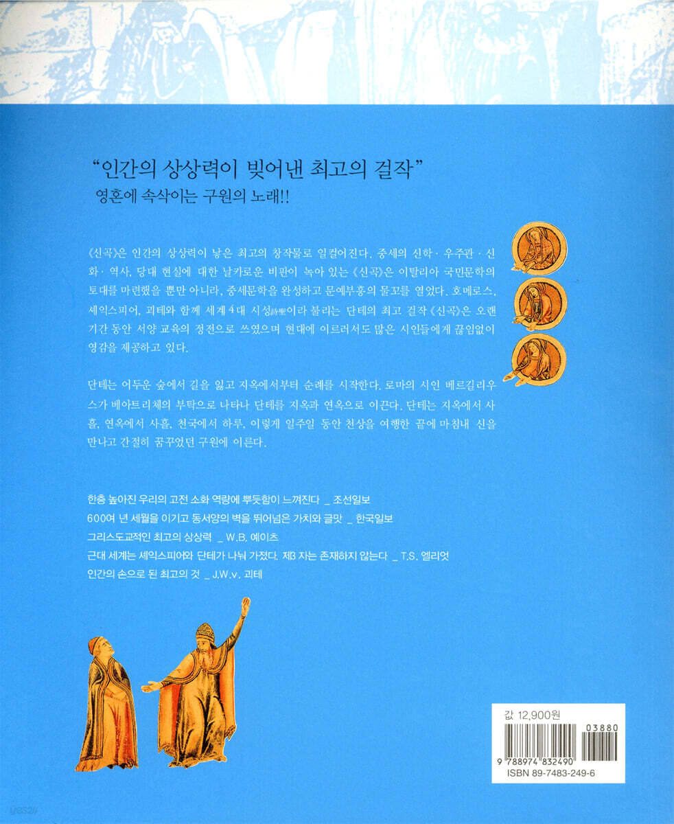 첫째, 이탈리아어판으로 번역하면서 원문을 충실히 살렸다. 국내에 출간되어 널리 읽히고 있는『신곡』의 대부분 중역한 책들이다. 그래서 원작이 가지고 있는 의미가 희석되거나 오역된 경우가 심심치 않다. 이 책은 원전에 가장 가까운 판본으로 알려진 주세페 반델리의 주해 이탈리아어판으로 번역하여 단테의 문체를 그대로 살렸다. 또 국내 출간본의 오역을 바로 잡아『신곡』의 진가를 느끼게 한다. 둘째, 누구나 쉽게 읽을 수 있는 산문으로 새롭게 옮겼다. 이제까지 우리가 읽어온『신곡』은 방대한 운문으로 이뤄져 해독하기 어려웠다. 역자와 출판사는 원작의 운문 형식을 산문 형식으로 풀어서 엮는 작업이 필요하다는 데 의견을 모았다. 이 작업은 원문을 철저히 참고하면서 이뤄졌으며『신곡』언어와 감동을 생생한 현대어로 풀어내는 데 심혈을 기울였다. 셋째, 일러스트 판『신곡』이라고 할 정도로 풍부한 도판이 삽입된 비주얼한 편집이 돋보인다. 중세시대의 필사본부터 산드로 보티첼리, 윌리엄 블레이크, 단테 가브리엘 로세티, 구스타브 도레, 존 플랙스먼 등에 이르기까지, 수세기에 동안 많은 미술가들이 그린 ‘신곡’을 만날 수 있는 국내 유일의『신곡』이라 할 수 있다. 이 책의 그림만 보아도『신곡』의 감동을 체험할 수 있을 정도로 풍부하고 아름다운 화면이 펼쳐진다. 넷째, 작품의 이해를 돕는 별면을 첨부했다.『신곡』을 이해하는 데 반드시 필요한 정보를 다양한 별면을 마련해 전달한다. <생애와 작품>에서는 단테의 일생과 작품이 씌어진 배경을 알려주며, 각 장마다 배치된 <그림으로 보는 지옥 ? 연옥 ? 천국>에서는 지옥도, 연옥도, 천국도의 일러스트를 섬세하게 그려 삽입하고, 역자의 해설을 덧붙여 독자의 이해를 높였다. 다섯째, 원문이 갖고 있는 중세의 심오한 신학과 우주관, 배경 지식을 전달하기 위해 상세하고 정확한 주석을 덧붙였다. 적절하게 삽입된 주석이 작품을 읽는 재미를 더해준다. 단테가 오류를 범했던 내용들도 주석으로 바로 잡았다. |