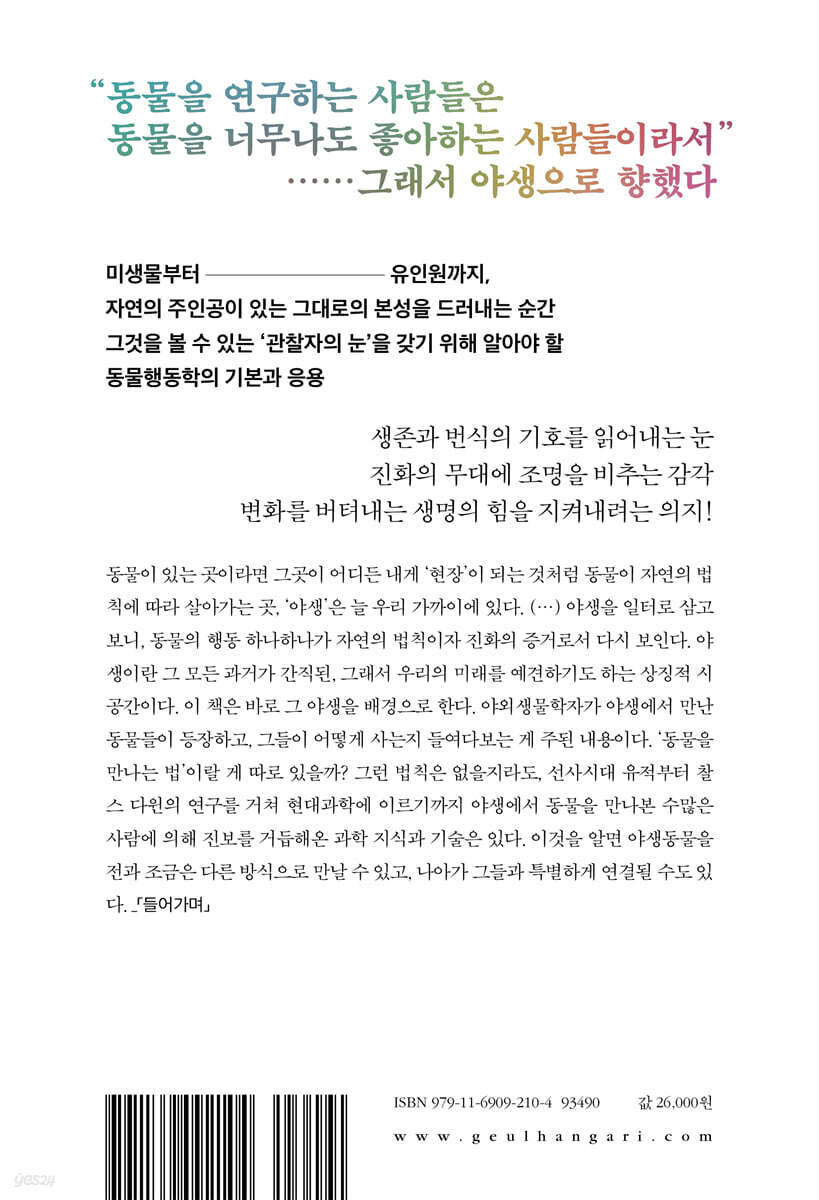 1장 관찰자의 눈 2장 동물의 짝 고르기 3장 동물의 짝짓기 4장 동물의 색 5장 모여 사는 동물들 6장 공생의 기술 7장 이동하는 동물들 8장 동물을 관찰하는 새로운 방법 9장 추위와 더위 10장 동물의 잠 11장 동물의 지혜 12장 동물의 의사소통 13장 고통과 슬픔 14장 잃어버린 야생 15장 야생의 위기 주 참고문헌 찾아보기 |