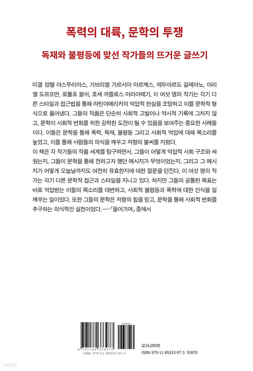 이 책은 각 작가들의 작품 세계를 탐구하면서, 그들이 어떻게 억압적 사회 구조와 싸웠는지, 그들이 문학을 통해 전하고자 했던 메시지가 무엇이었는지, 그리고 그 메시지가 어떻게 오늘날까지도 여전히 유효한지에 대한 질문을 던진다. 이 여섯 명의 작가는 각기 다른 문학적 접근과 스타일을 지니고 있다. 하지만 그들의 공통된 목표는 바로 억압받는 이들의 목소리를 대변하고, 사회적 불평등과 폭력에 대한 인식을 일깨우는 일이었다. 또한 그들의 문학은 저항의 힘을 믿고, 문학을 통해 사회적 변화를 추구하는 의식적인 실천이었다.