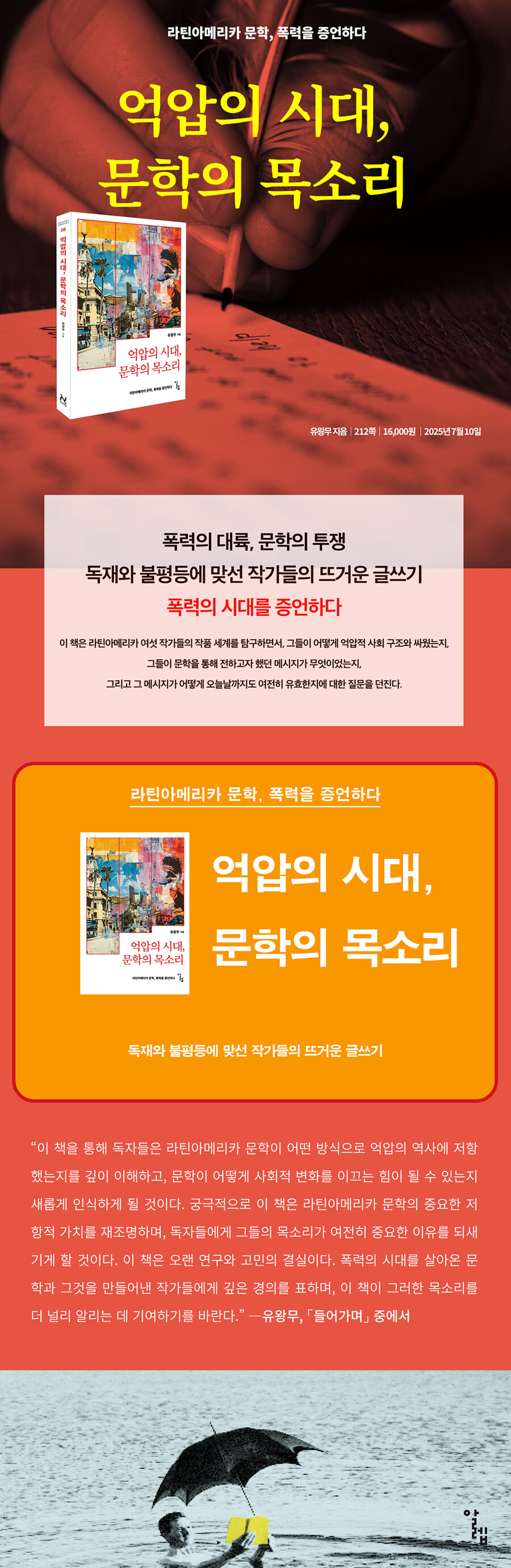 라틴아메리카를 생각하면 눈부신 안데스의 설산, 끝없이 펼쳐진 우유니 소금사막, 리오넬 메시로 대표되는 열정적인 축구 문화가 떠오른다. 그러나 그 아름다운 풍경과 열정의 이면에는 식민 지배와 군사 독재, 폭력과 착취로 얼룩진 참혹한 과거가 있다. 유왕무 교수는 라틴아메리카 문학과 문화를 오랜 시간 연구해온 연구자이자 번역가로, 현지에서 직접 학위를 받고 수많은 저작과 번역을 통해 이 대륙의 억압과 저항의 목소리를 국내에 전해왔다. 유왕무 교수의 『억압의 시대, 문학의 목소리』는 라틴아메리카가 겪어온 폭력과 억압의 역사를 문학이 어떻게 기록하고 증언해 왔는지 살핀다. 과테말라의 미겔 앙헬 아스뚜리아스는 독재자 소설로 절대 권력의 실체를 형상화했고, 콜롬비아의 가브리엘 가르시아 마르께스는 『백년의 고독』으로 은폐된 학살과 폭력을 마술적 사실주의로 풀어냈다. 우루과이의 에두아르도 갈레아노는 군부 독재와 망명을 겪으며 억압의 현실을 증언했고, 칠레의 아리엘 도르프만은 연극과 에세이를 통해 검열과 폭력에 맞서 침묵 당한 내면의 목소리를 무대에 올렸다. 아르헨티나의 로돌포 왈쉬는 르포와 허구를 결합해 진실을 폭로했으며, 페루의 호세 까를로스 마리아떼기는 인디헤니스모 사상을 통해 토착민 현실과 해방의 길을 제시했다. 이 여섯 작가는 시대와 장르를 달리했지만, 각자만의 방식으로 폭력과 독재를 기록하고 검열과 억압에서 진실을 건져 올려 후세에 전했다. 최근 한국 사회는 비상계엄으로 인해 다시금 독재의 그림자를 목격했다. 완전히 사라진 줄 알았던 국가 권력에 의한 폭력이 아직 사라지지 않았음을 전 국민이 목격했다. 이렇듯 갈등과 분쟁, 혐오와 왜곡은 눈에 보이지 않는 형태로 지금도 사회 곳곳에 스며 있다. 중요한 것은 이런 사건과 균열을 어떻게 기록하고, 어떤 이야기로 후세에 남길 것인가이다. 『억압의 시대, 문학의 목소리』는 라틴아메리카의 참혹한 역사 속에서 문학이 어떻게 억압받은 목소리를 증언하고 스토리텔링할 수 있는지를 보여준다. 문학이 해부한 절대 권력: 권력의 신화를 벗긴 문학의 칼끝 제1장은 라틴아메리카 문학의 중요한 갈래인 ‘독재자 소설’을 중심으로 권력과 폭력의 문제를 다룬다. 19세기 이후 라틴아메리카에서는 반복된 군부 쿠데타와 독재 체제를 통해 권력이 소수에 집중되고, 폭력은 정치와 일상에 깊숙이 스며들었다. 현실에서 접근할 수 없었던 권력의 실체는 문학이 대신 기록했다. 미겔 앙헬 아스뚜리아스(Miguel Angel Asturias, 1899-1974)의 『대통령 각하』와 가브리엘 가르시아 마르께스의 『족장의 가을』은 그 대표적 성취다. 아스뚜리아스는 『대통령 각하』에서 절대 권력이 개인의 일상과 내면까지 어떻게 지배하는지를 환상적이고 시적인 언어로 그려냈다. 독재자는 직접 등장하지 않아도 체제 전체를 조종하며, 공포는 일상화된다. 반면 가르시아 마르께스의 『족장의 가을』은 독재자의 신화적이고 모순적인 내면에 초점을 맞춘다. 그는 절대 권력으로 민중을 억압하는 동시에 외세에 종속되며 스스로 고독의 덫에 갇힌 존재로 그려진다. 두 작품 모두 독재자 개인을 넘어서 폭력의 구조가 어떻게 사회를 잠식하는지를 문학적으로 형상화한다. 독재자 소설은 라틴아메리카의 피비린내 나는 정치사와 함께 성장해 왔다. 단순한 폭력 고발을 넘어, 문학이 권력의 본질을 어떻게 드러낼 수 있는지를 보여준다. 오늘날에도 독재자 소설이 여전히 읽혀야 하는 이유는, 폭력의 언어가 사라지지 않았기 때문이다. 제1장은 라틴아메리카 문학이 권력과 폭력의 구조를 어떻게 기록하고, 그 기억을 오늘에도 어떻게 이어가고 있는지, 그 시작점을 다시 묻는다. 망각에 맞선 기록: 폭력의 시대를 증언하다 제2장은 에두아르도 갈레아노(Eduardo Galeano, 1940-2015)의 『사랑과 전쟁의 낮과 밤』을 중심으로 군부 독재가 지배하던 라틴아메리카의 집단적 기억과 증언의 의미를 탐구한다. 갈레아노는 저널리즘을 바탕으로 다양한 장르의 글쓰기를 시도하면서, 독재 권력에 대한 저항과 사회적 부조리를 고발하는 작업을 지속했다. 그의 작품은 단순한 개인의 회고가 아니라, 침묵 당한 민중의 목소리를 이어 붙인 집단적 증언이다. 134개의 단편 에세이로 구성된 『사랑과 전쟁의 낮과 밤』은 갈레아노가 작가로서의 글쓰기와 기자로서의 글쓰기를 융합한 첫 번째 시도였다. 그는 자신의 경험과 관심사를 회고 형식으로 펼치며 정치?사회적 문제와 연결 짓는 방식으로 기존 증언 문학이 가진 한계를 극복하려 했다. 이 작품을 통해 갈레아노가 드러내려 하는 문제는 단순히 정치?사회적 사안에 국한되지 않는다. 그는 비논리적이고 부조리한 현실에 맞서는 인간의 문제에도 관심을 두며, 작품 속에서 이데올로기와 계층 간 갈등을 통해 불의, 착취, 억압을 강렬하게 부각한다. 『사랑과 전쟁의 낮과 밤』은 인간적이고 합리적인 사회 체제를 구축하기 위한 비판적 자세를 일관되게 제시하는 작품이다. 그는 ‘낮’과 ‘밤’이 공존하는 세상처럼 균형과 조화가 이루어진 사회를 꿈꾼다. 한 시대의 권위적 구조와 부조리