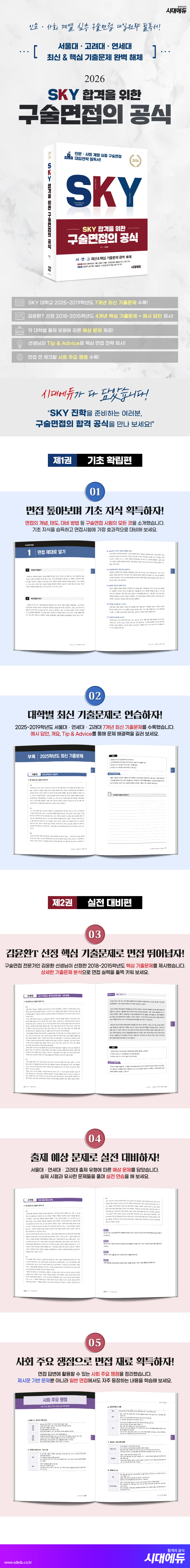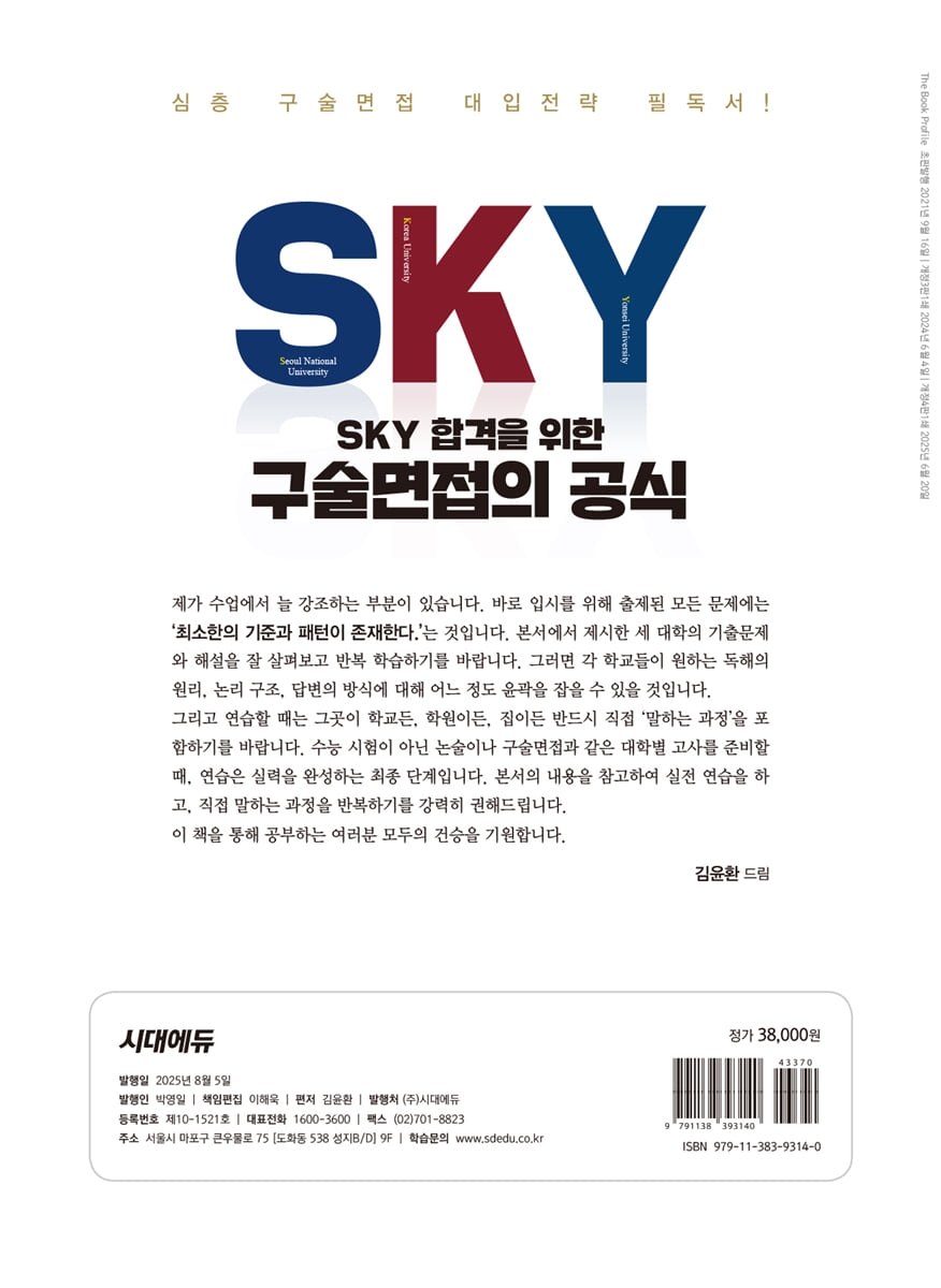 부록 2025학년도 대학별 최신 기출문제 서울대 2025학년도 인문학/사회과학 연세대 2025학년도 활동우수형 인문·통합계열 고려대 2025학년도 계열적합형 PART 1 면접 톺아보기 CHAPTER 1 면접 제대로 알기 1. 면접의 개념은? 2. 왜 면접인가요? CHAPTER 2 면접 태도 체화하기 1. 바람직한 태도 2. 면접 답변 요령 CHAPTER 3 면접 준비하기 1. 배경지식 늘리기 2. 생기부에 완전 익숙해지기 3. 기출문제 점검하기 PART 2 면접 연습하기 대학별 최신 기출문제 서울대 2024학년도 인문학/사회과학(오전/오후) 서울대 2023학년도 인문학/사회과학(오전/오후) 서울대 2022학년도 인문학/사회과학(오전/오후) 서울대 2021학년도 인문학/사회과학(오전/오후) 서울대 2020학년도 인문학/사회과학(오전/오후) 서울대 2019학년도 인문학/사회과학(오전/오후) 연세대 2024학년도 추천형/활동우수형 인문·통합계열 연세대 2023학년도 추천형/활동우수형/고른기회전형(오전/오후) 연세대 2022학년도 추천형/활동우수형(오전/오후)/국제형 연세대 2021학년도 인문·사회·통합계열 연세대 2020학년도 면접형/활동우수형 인문·사회계열 연세대 2019학년도 활동우수형(오전/오후) 고려대 2024학년도 인문계열(오전/오후) 고려대 2023학년도 인문계열(오전/오후) 고려대 2022학년도 인문계열(오전/오후) 고려대 2021학년도 계열적합형 인문계열(오전/오후) 고려대 2020학년도 계열적합형 인문계열(오전/오후) 고려대 2019학년도 계열적합형 인문계열(오전/오후) 제2권 ┃ 실전 대비편 PART 1 면접 뛰어넘기 CHAPTER 1 김윤환T 선정 핵심 기출문제 서울대 2018학년도 일반전형 인문학(오전/오후) 서울대 2017학년도 일반전형 인문학(오전/오후) 연세대 2017학년도 특기자전형 인문·사회계열 연세대 2016학년도 특기자전형 인문·사회계열 연세대 2015학년도 특기자전형 인문·사회계열 고려대 2018학년도 일반전형 인문계열(오전/오후) 고려대 2018학년도 고교추천전형 인문계열(오전/오후) 고려대 2018학년도 특기자전형 인문계열(오전/오후) 고려대 2018학년도 고교추천Ⅱ, 일반전형 모의면접 고려대 2017학년도 융합인재전형 인문계열(오전/오후) 고려대 2017학년도 학교장추천전형 인문계열(오전/오후) 고려대 2016학년도 융합인재전형 인문계열(오후) 고려대 2016학년도 학교장추천전형 인문계열(오전/오후) CHAPTER 2 출제 예상 문제 서울대 인문학 예상 문제 서울대 사회과학 예상 문제 연세대 인문·사회·통합계열 예상 문제 고려대 인문계열 예상 문제 PART 2 읽어 보기 사회 주요 쟁점 |