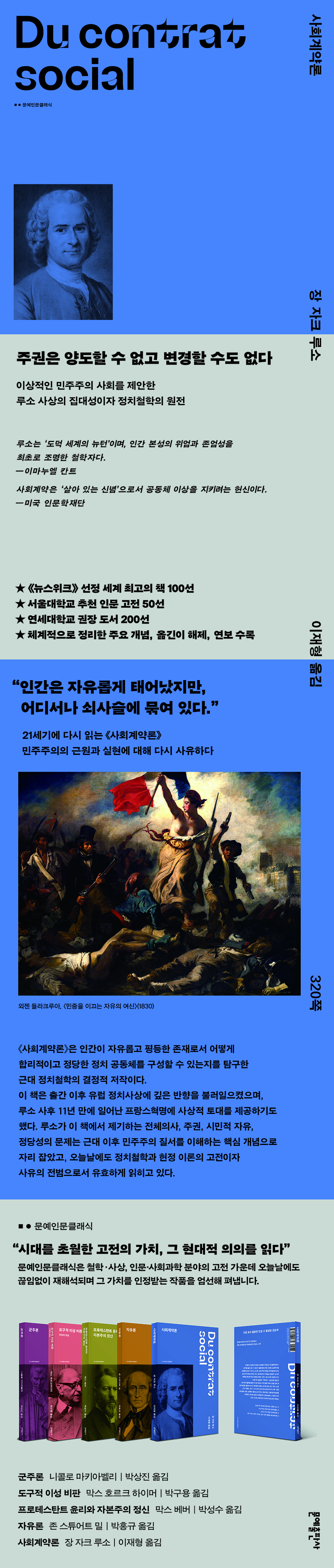 루소 사상의 집대성이자 정치철학의 원전 민주주의 실현에 초석을 놓은 루소의 대표 저작 『사회계약론』은 인간이 자유롭고 평등한 존재로서 어떻게 합리적이고 정당한 정치 공동체를 구성할 수 있는지를 탐구한 근대 정치철학의 결정적 저작이다. 루소는 인간이 자연 상태에서 지니는 자유를 상실하지 않으면서도 사회 속에서 살아가기 위한 가장 정당한 방식으로, 모든 시민이 공동의 전체 의사에 참여해 주권을 형성하는 ‘사회계약’ 개념을 제시한다. 이 책은 출간 이후 유럽 정치사상에 깊은 반향을 불러일으켰으며, 루소 사후 11년 만에 일어난 프랑스혁명에 사상적 토대를 제공하기도 했다. 루소가 이 책에서 제기하는 전체 의사, 주권, 시민적 자유, 정당성의 문제는 근대 이후 민주주의 질서를 이해하는 핵심 개념으로 자리 잡았고, 오늘날에도 정치철학과 헌정 이론의 고전이자 사유의 전범으로서 여전히 유효하게 읽히고 있다. 문예인문클래식으로 새롭게 선보이는 『사회계약론』에는 부록으로 ‘주요 개념’과 ‘옮긴이 해제’, ‘장 자크 루소 연보’가 수록되어 있다. ‘주요 개념’에서는 주권, 전체 의사, 법, 입법자, 정부 등의 개념이 책 속에서 어떻게 정의되고, 어떤 맥락에서 쓰였는지, 저자의 의도는 무엇인지 체계적으로 정리하고, 상세한 ‘옮긴이 해제’는 루소가 『사회계약론』을 구상하게 된 배경과 루소 이전의 사회계약에 대한 사회적 견해를 소개하며 각 부와 장의 내용을 분석했다. 더불어 ‘장 자크 루소 연보’를 통해 혁명적인 사상을 탄생시킨 저자의 생애를 한눈에 살펴볼 수 있다. “인간은 자유롭게 태어났지만, 어디서나 쇠사슬에 묶여 있다.” “인간은 자유롭게 태어났지만, 어디서나 쇠사슬에 묶여 있다.” 루소는 이 첫 문장으로 개인의 자유와 공동체 질서 사이의 긴장을 어떻게 해결할 것인가라는 정치철학의 핵심 문제를 제기한다. 전체는 4부로 구성되어 있으며 각 부는 사회계약과 정치 권위의 정당성, 주권과 일반의지에 기반한 정치체의 본질과 법체계, 법의 효력과 종교 등 국가의 존속과 시민 사회의 유지 조건에 관해 단계적으로 전개된다. 1부에서는 사회계약의 필요성과 자연 상태의 한계를 설명한다. 『사회계약론』에 앞서 출간한 『인간 기원 불평등』에서도 주장한 바와 같이 루소는 인간이 자연 상태에서는 자유롭고 평등했지만 사유재산을 소유함에 따라 불평등이 생겨났다고 보았다. 이러한 문제를 해결하기 위해 인간은 사회계약을 맺어 정치 공동체를 구성한다. 그러나 루소는 홉스처럼 절대 권력을 정당화하지 않고 진정한 자유는 시민들이 스스로 법을 만드는 데서 나온다고 주장한다. 2부에서는 ‘주권’과 ‘전체 의사’의 개념을 중심으로 올바른 정치체의 구조를 설명한다. 주권은 국민 전체에 있고, 주권은 양도할 수 없으며 분할할 수도 없다고 주장한다. 전체 의사는 공동체 전체의 공공선을 추구하는 의지로, 개인의 사적 이익이 아닌 공적 이익을 반영한다. 진정한 자유는 바로 전체 의사에 따를 때 실현되며, 개인이 법의 공동 입법자가 될 때 자유와 평등이 보장된다. 3부는 정부의 형태와 역할에 대해 다룬다. 루소는 입법권은 국민의 전체 의사에서 비롯되며, 집행권은 이를 실행하는 도구에 불과하다는 점을 강조한다. 즉, 정부는 주권자인 국민의 명령을 이행하는 집행자일 뿐이며, 진정한 권력은 국민에게 있다. 또한 군주정치, 귀족정치, 민주정치 등 여러 정부 형태를 비교하면서, 국토의 크기나 국민의 성향에 따라 적절한 정부 형태가 달라질 수 있다고 주장한다. 루소에게 중요한 것은 어떤 체제이든지 전체 의사를 충실히 반영하고 실행해야 정당하다는 점이다. 4부는 시민 덕성과 정치 공동체의 지속 가능성에 관해 고찰한다. 루소는 자유로운 시민 사회를 유지하기 위해 시민 교육, 종교, 풍속 등 비정치적 요소의 중요성을 강조한다. 특히 국가 질서를 지탱하기 위해 ‘시민 종교’라는 개념을 제시한다. 이는 특정 종교 교리를 강요하는 것이 아니라 공동체 유대와 공공선을 강화하기 위한 신념 체계로, 정치 공동체의 도덕적 기반을 제공해야 한다고 역설한다. 21세기에 다시 읽는 『사회계약론』 민주주의의 근원과 실현에 대해 다시 사유하다 루소가 『사회계약론』을 집필해 발표한 18세기는 신분제가 존재했고, 당시로서는 이 책이 담고 있는 사상이 너무나 혁명적이었기에 전폭적인 지지를 받지는 못했다. 수많은 찬반양론의 중심에 서 있던 이 책은 260년이 지난 지금도 정치철학 역사상 가장 논쟁적인 텍스트 중 하나로 평가받는다. 이 책이 주장하는 이상적인 민주주의 사회는 21세기인 오늘날에도 여전히 많은 것을 시사하며, 자유, 정의, 평등, 법, 인권에 대해 생각할 거리를 던져준다. 특별히 『사회계약론』이 오늘날 한국 사회에서 새롭게 조명되는 이유는 단지 고전으로서 위상 때문만은 아니다. 헌정 질서에 중대한 위기를 불러온 계엄령 선포와 그에 따른 대통령 탄핵, 그리고 다시 치러진 대통령 선거 과정은 우리 사회가 ‘정부란 무엇인가?’ ‘정당한 정치 권력은 어디에서 비롯되는가’라는 질문과 다시 마주