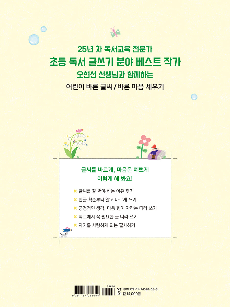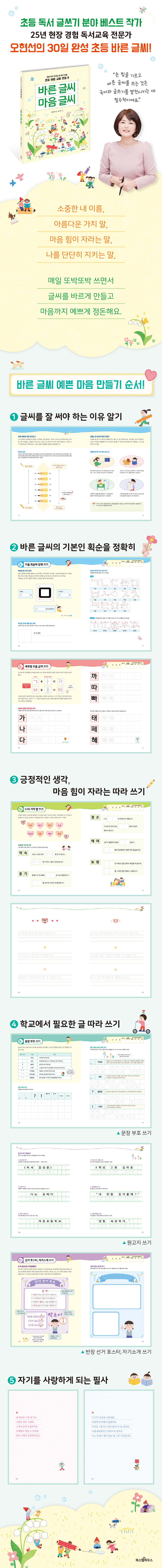 지금까지 수많은 어린이를 지도한 경험을 바탕으로 바른 글씨를 쓰기 어려워하는 경우를 3가지로 분석했어요. 1) 자모음 획순을 정확히 알지 못하거나 초성 중성 종성 순서 쓰기를 모르는 경우 2) 손의 힘이 부족한 경우 3) 글씨를 바르게 써야 하는 이유를 모르는 경우랍니다. 이 3가지의 어려워하는 포인트를 해소할 수 있게 구성했고, 바른 글씨의 기초를 확실히 잡도록 구성되었어요. ■ 예쁜 말, 힘을 주는 말을 또박또박 쓰며 마음도 바르게 바른 글씨를 연습한다고, 맥락 없는 단어들을 흰 종이 위에 수없이 쓰는 것은 지루해요. 짧더라도 소중한 뜻, 예쁜 생각이 드러나는 단어와 문장을 따라 쓰도록 내용을 엄선해 수록했어요. 또박또박 글씨를 천천히 따라 쓰는 건 모양 교정의 효과도 있지만, 나아가 필사의 효과도 있어요. 필사는 마음을 진정시키게 돕고, 좋은 단어와 문장을 찾아내는 능력, 그 단어와 문장을 대화와 글쓰기에 다시 활용하는 능력 등이 두루 길러져서 많이 추천하는 활동이지요. 필사의 효과도 기대하며 소중한 내 이름, 귀한 가치 말, 나를 사랑하는 글, 나를 단단히 지키는 글, 남을 배려하고 감사를 표현하는 글 등을 매일 조금씩 써 봐요. 글씨가 바르게 세워지면서 마음과 생각도 긍정적으로 바로 세워질 거예요. ■ 오현선 작가가 초등 친구들에게 주는 응원 글 필사 초등 친구들이 많이 가지는 고민에 오현선 작가가 들려주는 따뜻한 응원 글을 맨 마지막 장에서 필사할 수 있게 수록했어요. 나를 사랑하게 되는 글, 친구 관계 고민이 있을 때 풀어 주는 글, 힘들 때 스스로를 응원하고 자존감을 북돋우는 글을 또박또박 바르게 따라 써 봐요. 크고 작은 고민이 있을 때마다 필사하며 마음을 가다듬을 수 있는 경험을 가져다줄 거예요. 어린이를 위한 첫 필사 책으로도 활용하기 좋아요. ■ 글씨 크기, 필기도구, 쓰는 칸 모두 단계별로 연습 이 책은 초등 저학년부터 고학년까지 두루 해 볼 수 있어요. 한글 획순에서 시작해 간단한 단어와 어절을 쓰고, 그다음 문장, 그리고 긴 글까지 기초 한글부터 짧은 단어, 긴 글까지 한 단계씩 도전하도록 구성되어 있어요. 글씨 크기도 처음에는 크게 쓰다가 점점 작게 쓰도록 난이도를 조절했어요. 필기도구도 글씨가 서툰 친구들은 굵은 색연필로 시작해서, 4B, 2B, HB, 색깔 펜으로 쓰기까지 실력에 따라 단계를 바꾸도록 안내합니다. 또 노트 모양도 칸 노트에서 시작해 줄 노트, 줄 없는 노트까지 수준을 나누어서 천천히 모든 어린이가 잘 따라 쓸 수 있도록 했어요. ■ 문장 부호, 원고지, 독서록, 선거 포스터, 자기소개 등 초등 글쓰기 팁 초등 국어에서 필요한 다양한 독서와 글쓰기 상식도 담겨 있어요. 글씨를 또박또박 따라 쓰면서 여러 가지 글쓰기를 두루 경험해 봐요. 문장 부호 쓰기, 겹받침 쓰기, 원고지 쓰기, 일기와 독서록 쓰기, 선거 포스터와 자기소개 쓰기 등 학교에서 꼭 쓰게 되는 글쓰기 상식과 갈래 글 종류를 한 권으로 모두 만나고 연습할 수 있습니다. |