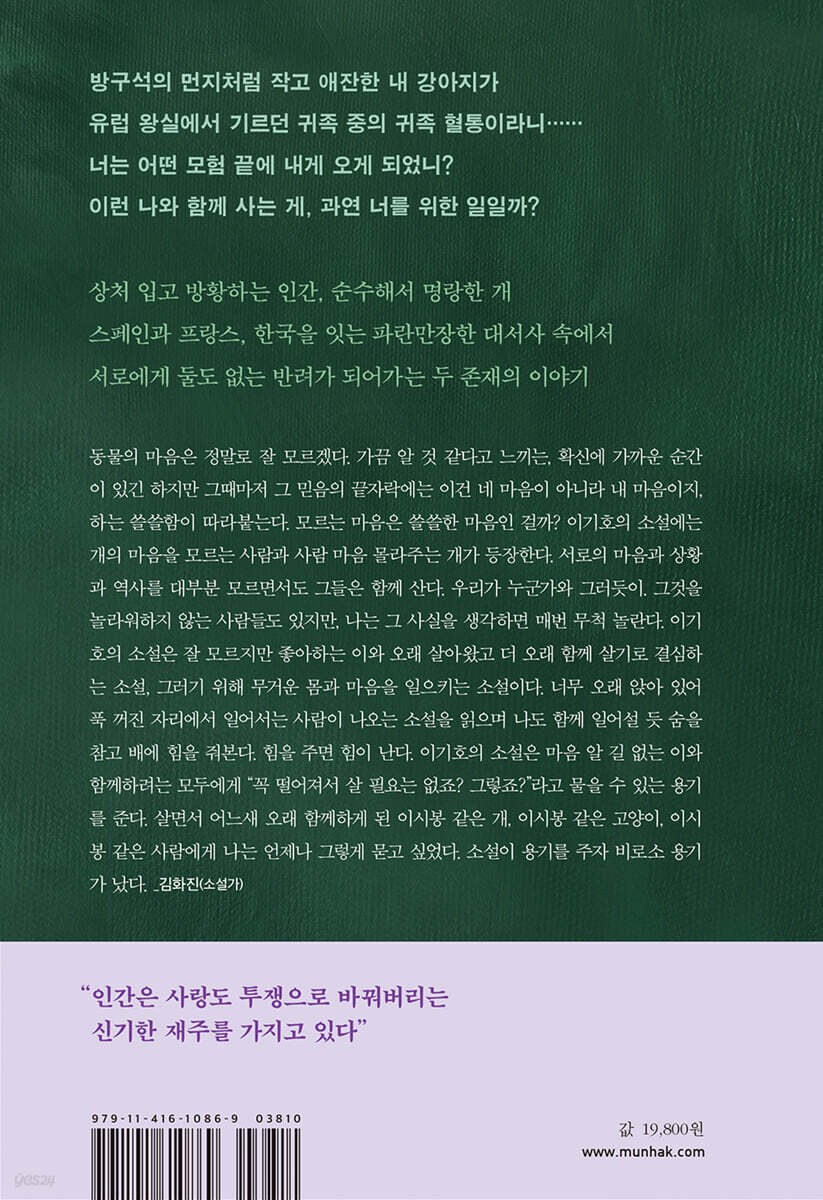 유럽 왕실에서 기르던 귀족 중의 귀족 혈통이라니…… 너는 어떤 모험 끝에 내게 오게 되었니? 이런 나와 함께 사는 게, 과연 너를 위한 일일까? 이시봉의 보호자 ‘이시습’은 아직 자신만의 삶의 궤도를 확립하지 못하고 방황중인 20대 청년이다. 아버지를 불의의 사고로 떠나보낸 후, 시습의 가족들은 겉으로는 드러나지 않는 심각한 마음의 상처를 입은 상태다. 이시봉을 집에 데려와 “우리집 막내”라 부르며 애지중지했던 아버지의 죽음에 이시봉이 연루되어 있기 때문이다. 머리로는 이시봉에게 잘못이 없다는 것을 이해해도 가슴으로는 이시봉을 용서하지 못하는 어머니와 함께 살기에, 시습은 이시봉을 마음껏 사랑하고 싶을 때도 집안의 눈치를 살핀다. 현실에서 도피하고자 술에 의존하게 된 시습은 그 와중에도 이시봉을 꼭 끼고 다니며 보살핀다. 비록 이시봉의 몰골이 시습과 닮아가 꼬질꼬질하고 비루해질지언정. 여동생 ‘시현’과 친구들의 걱정과 안타까운 시선을 한몸에 받으면서도 이시봉과 서로 의지하며 작은 생활반경 안에서 재활을 해나가던 시습 앞에, 어느 날 비숑 프리제만 전문으로 다룬다는 브리딩 업체 ‘앙시앙 하우스’가 나타난다. 그곳의 수석 브리더 ‘미셸 김’은 시습에게 놀라운 말을 한다. 조사 결과 이시봉이 과거 유럽 왕실에서 기르던 고귀한 혈통으로, 이제 세상에 몇 마리 남지 않은 ‘비숑의 왕’이라는 것. 미셸 김은 이시봉을 넘겨받는 조건으로 적지 않은 돈을 제안하며, 앙시앙 하우스에는 이시봉을 위한 호화로운 시설과 체계적이고 안락한 케어가 보장되어 있다고 시습을 회유한다. 말도 안 되는 제안이라 여겼지만, 이시봉과 함께 앙시앙 하우스에 방문하고 업체 대표 ‘정채민’의 뜨거운 애정 공세를 지켜보며 시습은 마음이 복잡해진다. 스스로의 삶에 자신이 없는 시습은 자신이 이시봉의 더 나은 삶을 응원하지 못하고 곁에 붙잡아두고 있는 듯한 기분을 느낀다. 이시봉을 향한 자신의 사랑도 한 점 부끄러움 없는 진실한 사랑인데, 왜 자꾸만 사랑에 우열이 가려지는 것만 같을까? 이시봉의 혈통에 관한 앙시앙 하우스의 주장이 사실인지 확인하기 위해 아버지가 어린 이시봉을 입양해올 무렵 남긴 행적을 추적하던 시습은 또 한번 놀라운 사실을 마주한다. 아버지의 지인 중에 ‘인간 이시봉’이 있었던 것이다. 시습, 시현과 함께 ‘시’ 자 돌림으로 지어진 줄만 알았던 이시봉의 이름에 대한 비밀이 풀려나오기 시작하며, 소설은 본격적으로 파란만장한 대서사를 향해 나아간다. 상처 입고 방황하는 인간, 순수해서 명랑한 개 스페인과 프랑스, 한국을 잇는 파란만장한 대서사 속에서 서로에게 둘도 없는 반려가 되어가는 두 존재의 이야기 이후 서사는 크게 세 갈래로 나뉜다. 현시점과 가장 가까운 서사는 이시습이 이시봉의 이름에 얽힌 사연을 추적한 끝에 진실과 맞닿는 이야기이다. 시습의 아버지는 과거 공장 노동조합에서 활동하다 주위의 만류에도 불구하고 희망퇴직한 후, 자신을 대신해 노조 간부가 되어 갖은 고초를 치르게 된 동료 이시봉으로부터 개 농장에 맡겨진 강아지를 담보물 삼아 돈을 빌려달라는 부탁을 받았는데, 그것이 이 모든 인연의 단초였음이 밝혀진다. 그 강아지를 동료의 이름으로 부르며 속죄하는 마음으로 끝까지 지켜냈을 아버지의 마음을 확인하는 이 서사는 부조리한 사회에서 발생하는 비극과 그로 인한 아픔을 짊어지고 살아가는 인간의 개별적인 표정들을 생생하게 그려낸다. 비숑 프리제 이시봉이 개 농장에 방치되기에 이른 사연은 정채민의 과거 서사와 관련이 있다. 앙시앙 하우스의 정채민 대표는 자신이 이시봉에게 얼마나 진심을 다하고 있는지 피력하기 위해 이시습을 초대해 긴 이야기를 들려준다. 유복한 환경에서 자란 정채민은 청년 시절 프랑스로 유학을 갔고, 그곳에서 가난한 한국인 예술가 부부 ‘김상우’와 ‘박유정’을 알게 된다. 어느 날 그들 앞에 유럽 왕가의 혈통을 지닌 개 두 마리가 나타난다. 정채민, 김상우, 박유정은 애정을 바쳐 돌본 그 개들을 한국으로 들이기 위해 힘을 모으지만, 결국 사랑과 질투와 돈이 얽힌 갈등 끝에 마음이 엇갈리고 만다. 예술을 선망하던 가난한 이들이 꿈과 불화하고 현실과 타협하게 되는 과정, 숨겨왔던 사랑이 오랜 시간을 통과하며 변질되는 과정이 애틋하고도 격정적인 서사 위에 드러난다. 그렇다면 왕가에서 생활하던 비숑 프리제들은 왜 이리도 초라한 계보를 이어가게 되었는가. 그 까닭은 1808년 스페인에서 발발한 민중 봉기와 관련이 있다고 정채민은 말한다. 시곗바늘이 왕정 시대로 되돌아가고, 더욱 먼 과거로 확장된 서사는 스페인 총리이자 왕비의 정부 역할을 하며 민중의 원성을 산 마누엘 고도이의 이야기를 들려준다. 약육강식의 시대, 이시봉의 선조 강아지들은 위계관계를 공고히 하기 위해 하사되는 정치적 재산이었고, 연모의 마음을 감춘 채 사랑하는 이를 점잖게 만날 빌미였으며, 한 시대를 대표하던 인간을 무너뜨릴 때 그 인간보다 먼저 짓밟을 제물이었다. 마누엘 고도이가 몰락하며 그가 애지중지하던 개들 또한 비참한 말로를 