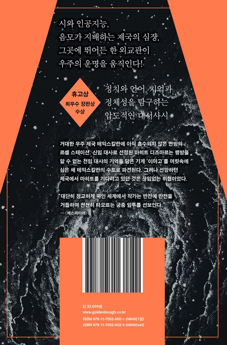 놀라운 SF 데뷔작. 작은 우주 기지 출신의 대사가, 모두가 자신을 죽이려 하는 듯한 우주 제국의 수도에서 살아남아야만 한다. 여기에 간질간질한 여성 캐릭터 간의 로맨스 라인이 곁들여지다니. 멋지다. - 릭 라이어던 (소설가, 『퍼시 잭슨과 올림포스의 신』 시리즈의 작가)