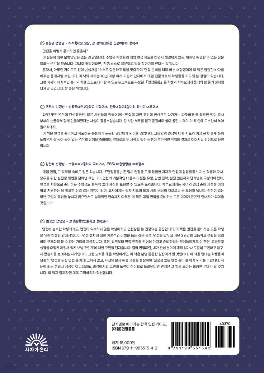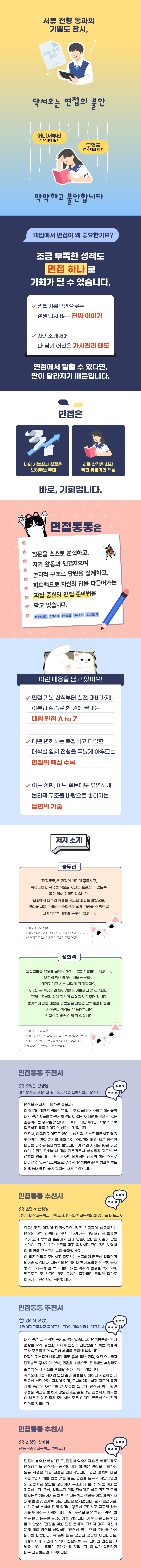 혼자서, 아무런 가이드도 없이 난생처음 ‘스스로 질문하고 답을 찾아가며’ 면접 준비를 해야 하는 수험생에게 이 책은 깜깜한 바다를 비추는 등대처럼 보입니다. 이 책의 저자는 10년 이상 여러 기관과 단체에서 대입 전문가로서 학생들을 지도해 본 경험이 있습니다. 그런 저자의 체계적인 정리와 학생 스스로 대비할 수 있는 워크북으로 구성된 『면접통통』은 학생과 학부모에게 등대의 한 줄기 빛처럼 다가갈 것입니다. - 오칠근 (마석중학교 교장, 전 경기도교육청 진로지원과 장학사)