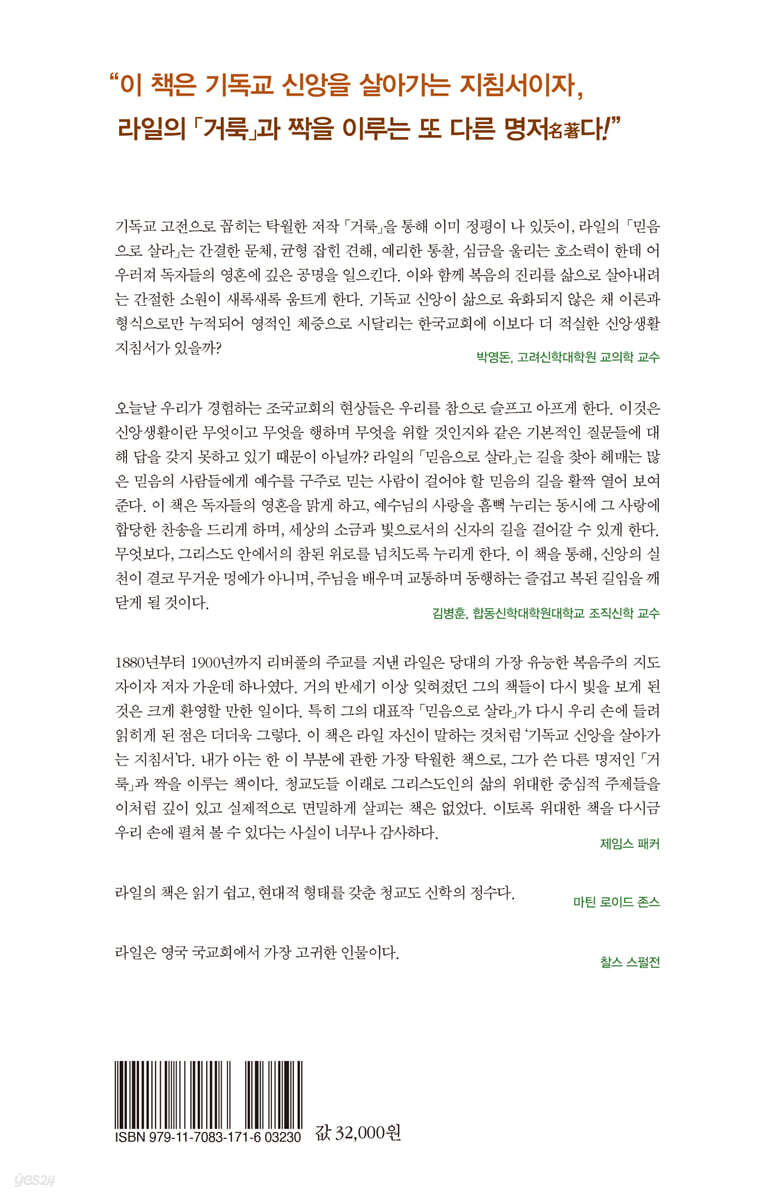 1880년부터 1900년까지 리버풀의 주교를 지낸 라일은 당대의 가장 유능한 복음주의 지도자이자 저자 가운데 하나였다. 거의 반세기 이상 잊혀졌던 그의 책들이 다시 빛을 보게 된 것은 크게 환영할 만한 일이다. 특히 그의 대표작 「믿음으로 살라」가 다시 우리 손에 들려 읽히게 된 점은 더더욱 그렇다. 이 책은 라일 자신이 말하는 것처럼 ‘기독교 신앙을 살아가는 지침서’다. 내가 아는 한 이 부분에 관한 가장 탁월한 책으로, 그가 쓴 다른 명저인 「거룩」과 짝을 이루는 책이다. 청교도들 이래로 그리스도인의 삶의 위대한 중심적 주제들을 이처럼 깊이 있고 실제적으로 면밀하게 살피는 책은 없었다. 이토록 위대한 책을 다시금 우리 손에 펼쳐 볼 수 있다는 사실이 너무나 감사하다. - 제임스 패커