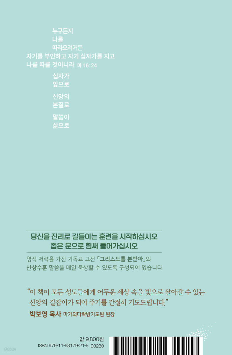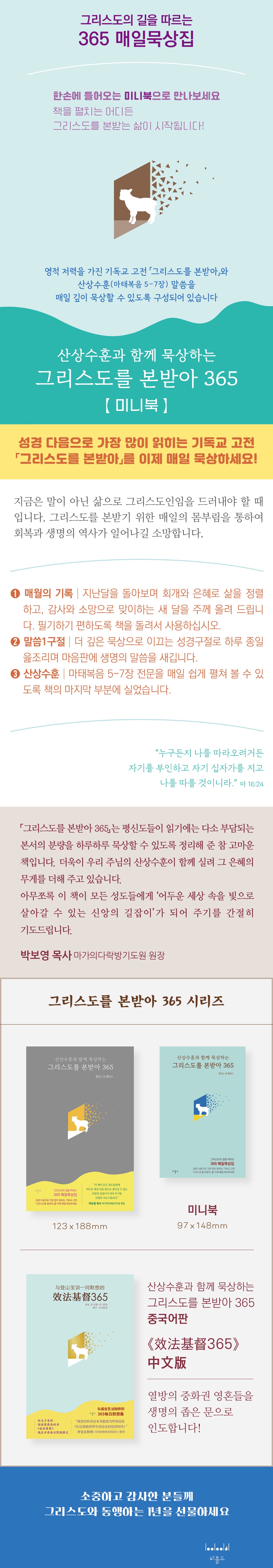 이 세상에 가장 큰 기적의 소식이 있다면 하나님의 아들이신 예수께서 우리 안에 사시겠다고 결정하신 것입니다. 그 아들이 우리 안에 계셔서 우리로 하여금 그분의 형상을 본받게 하십니다. 그리스도를 본받는 삶은, 우리 자신에게서 말미암는 갈망이 아니라 우리 안에 계신 예수님께서 우리 안에 심어 두신 것입니다. 오래전, 「그리스도를 본받아」를 처음 읽으며 떨리는 가슴으로 밤잠을 설쳤던 기억이 있습니다. 사랑하는 주님을 먼저 본받으며 달려갔던 신앙의 선배의 흔적을 따라 저 또한 이 책을 벗으로 삼아 지금도 곁에 두며 매일 읽고 있습니다. 「그리스도를 본받아 365」는 평신도들이 읽기에는 다소 부담되는 본서의 분량을 하루하루 묵상할 수 있도록 정리해 준 참 고마운 책입니다. 더욱이 우리 주님의 산상수훈이 함께 실려 그 은혜의 무게를 더해 주고 있습니다. 아무쪼록 이 책이 모든 성도들에게 ‘어두운 세상 속을 빛으로 살아갈 수 있는 신앙의 길잡이’가 되어 주기를 간절히 기도드립니다. - 박보영 (목사, 마가의다락방기도원 원장)