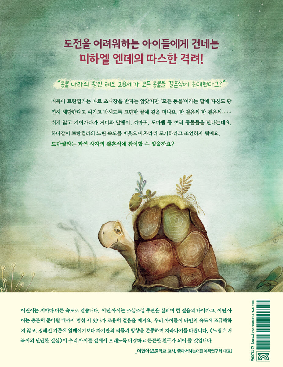 늦게 도착해도 가장 환한 순간에 닿을 수 있어.” 어린이는 저마다 다른 속도로 걷습니다. 어떤 아이는 조심조심 주변을 살피며 한 걸음씩 나아가고, 어떤 아이는 충분히 준비될 때까지 멈춰 서 있다가 조용히 걸음을 떼지요. 하지만 세상은 자꾸만 묻습니다. “그렇게 느려서 도착은 할 수 있겠니?” 《느림보 거북이의 단단한 결심》의 트란퀼라는 그 질문에 대답하지 않습니다. 대신 묵묵히 걷습니다. 결혼식이 정말 열릴지, 이미 끝난 것은 아닌지, 길이 맞는지조차 확신할 수 없는 상황 속에서도 흔들림 없이 자신의 속도를 지켜 냅니다. 이야기의 끝에서 트란퀼라는 마침내 잔치가 열리는 자리에 닿습니다. 처음 그렸던 술탄의 결혼식은 아니지만, 눈부시게 빛나는 새로운 축제의 한복판에 도착하지요. 동물들이 기뻐하며 환호하는 그 순간, 트란퀼라는 이렇게 말합니다. “내가 말했잖아. 제시간에 도착할 거라고.” 남들보다 늦지 않는 것보다 자기 걸음을 믿고 끝까지 가 보는 용기가 더 소중합니다. 자기만의 속도를 끝까지 지켜 낸 사람에게는 반드시 환하고 넉넉한 자리가 열립니다. 우리 아이들이 타인의 속도에 조급해하지 않고, 정해진 기준에 얽매이기보다 자기만의 리듬과 방향을 존중하며 자라나기를 바랍니다. 《느림보 거북이의 단단한 결심》이 아이들 곁에서 오래도록 다정하고 든든한 친구가 되어 줄 것입니다. - 이현아 (『어린이 마음 약국』 저자, 교사, 좋아서하는그림책연구회 대표) |