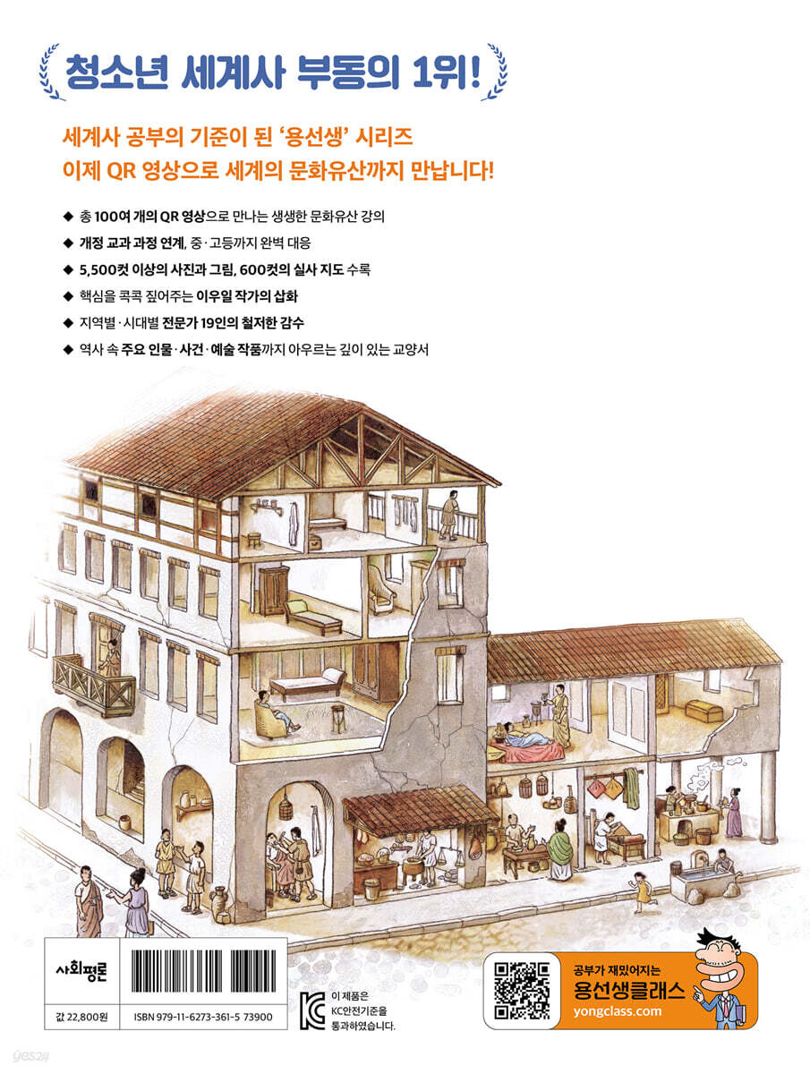 《교양으로 읽는 용선생 세계사》전면 개정판 무엇이 바뀌었나요? ■용선생식 쉬운 서술로 술술 읽히는 세계사책! 《교양으로 읽는 용선생 세계사》의 가장 큰 강점은 어려운 내용을 쉽게 풀어낸 용선생식 서술입니다. 용선생과 다섯 아이들로 이루어진 ‘용선생 역사반’의 떠들썩한 토론식 수업을 그대로 옮겨놓은 독특한 서술방식으로 세계사가 전개됩니다. 그리스 민주주의의 발달 과정, 크리스트교·불교·이슬람교가 세계 종교로 발돋움하게 된 배경, 중국 전국 시대 제후들이 부국강병 정책을 펼쳤던 이유 등의 어려운 주제를 누구나 이해하기 쉬운 대화체 서술과 용선생의 재치 있는 설명으로 역사의 실마리를 차근차근 풀어나갑니다. 전면 개정판에서는 서술을 보강하여 더 쉽고 잘 읽히는 글로 다듬었습니다. 한층 더 친절한 서술로 세계사가 훨씬 흥미롭게 느껴집니다. ■총 100여 개의 QR 영상으로 만나는 생생한 문화유산 강의! 세계사 공부에서 가장 아쉬운 점은 ‘직접 가서 보기 어렵다’는 점입니다. 전면 개정판은 이를 보완하기 위해 전 세계의 유물과 유적, 사건과 인물을 생생하게 전달하는 QR 영상을 추가하였습니다. 총 100여 개의 영상은 회차마다 다양한 주제의 영상을 흥미로운 스토리로 풀어나갑니다. 세계사 공부에 필요한 유물 유적의 생생한 사진 자료, 까다로운 고증을 거쳐 만든 AI 복원도와 상상화, 용선생과 아이들의 재미난 애니메이션 연출로 구성되어, 종이책의 한계를 벗어나 세계 곳곳의 유물과 유적지, 주요 세계사 사건과 인물의 에피소드를 흥미롭게 경험할 수 있습니다. ■중·고등 개정 교과 과정 연계! 전면 개정판은 중·고등학교 교과 과정을 연계했습니다. 각 권의 차례에서 교시별로 교과서 단원과의 연계를 확인할 수 있습니다. 세계사 용어 역시 교과서에서 사용하는 용어로 통일했습니다. 또한 정리 노트, 핵심 문제 페이지도 교과 연계 중심으로 제작했습니다. [나선애의 정리 노트]에서는 교과서 필수 핵심어를 중심으로 읽은 내용을 체계적으로 정리할 수 있고, [세계사 달인을 찾아라!]에서는 실제 학교 시험에 나오는 내신 문제를 수록해 학습 효과를 높였습니다. 교과 과정 연계를 위해 현직 역사 선생님을 감수자로 섭외하여 교육 현장의 목소리도 담았습니다. ■5,500컷 이상의 사진과 그림, 600컷의 실사 지도 용선생은 줄글뿐 아니라 이미지를 통해서도 역사 내용을 전달합니다. 세계사를 처음 배우는 아이들에게는 시각 자료가 큰 도움이 됩니다. 사진과 그림은 당시의 분위기를 생생하게 전달하고, 역사적 상상력을 키우는 데도 효과적입니다. 그래서 《교양으로 읽는 용선생 세계사》에는 압도적으로 많은 이미지 자료를 삽입했습니다. ‘전면 개정판’에서는 이미지 자료를 더욱 선명하게 볼 수 있도록 디자인 사양을 업그레이드했습니다. 그뿐 아니라 핵심을 찌르는 이우일 작가의 그림, 과거 생활 모습을 충실히 재현한 복원도와 설명 삽화는 역사적 사실을 생생하게 보여주는 동시에, 재미와 정보까지 모두 담고 있습니다. 세계사 공부를 위해서는 지리 감각을 키우는 것이 중요합니다. 이를 위해 높은 수준의 지도를 최대한 많이 삽입했습니다. 총 600컷에 달하는 실사 지도를 이용해 역사적 사건이 벌어진 무대는 물론 그곳의 자연환경을 단박에 파악할 수 있습니다. ■과거 역사와 현재의 삶을 잇는 ‘역사의 현장 지금은?’ 《교양으로 읽는 용선생 세계사》는 과거와 현재를 연결하기 위한 코너도 마련했습니다. 책의 각 교시 수업이 시작되기에 앞서 역사적 현장의 현재 모습을 살펴볼 수 있는 〈역사의 현장 지금은?〉을 읽게 됩니다. 메소포타미아 문명이 일어난 곳에 지금은 이라크라는 나라가 있다는 사실을 몰랐던 아이들은 과거와 현재를 연결하며 다양한 상상을 하게 됩니다. 또한 전면 개정판에서는 세계 각국의 인물, 사건 등 인문 지리 정보를 업데이트하여 시대의 변화를 충실히 반영했습니다. ■지역별·시대별 전문가 16인의 철저한 감수 《교양으로 읽는 용선생 세계사》는 제작비 30억, 40여 명의 개발진이 참여한 책입니다. 사회평론 역사연구소는 총 100여 차례의 전문가를 초빙해 강의를 진행하였고, 수백 권에 이르는 국내외 참고 문헌과 연구 자료를 바탕으로 내용에 깊이를 더했습니다. 또한 세계 각 지역과 시대를 대표하는 역사 전문가 16인의 자문과 철저한 검수를 거쳐, 각 교시의 역사 서술을 더욱 균형 있게 구성했습니다. 2권에서는 서아시아, 지중해 세계에 통일 제국이 탄생한 과정을 다룹니다. 고대 그리스 문명과 헬레니즘의 형성, 로마 제국의 흥망성쇠 등 서양 고대사의 굵직한 흐름을 담았습니다. |