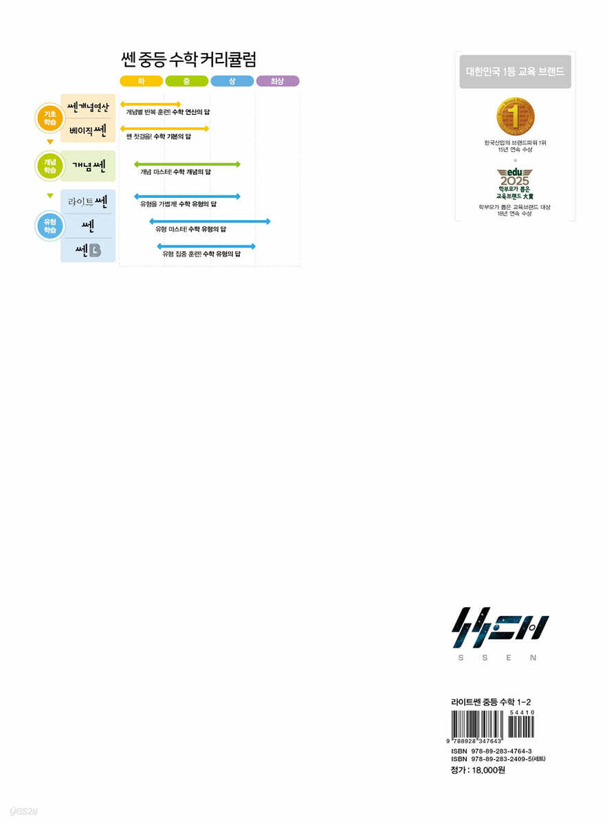 1. 2022 개정 교육과정을 충실히 반영한 개념 정리 및 유형 분류 2. 어려운 문제를 제외한 모든 문제를 구성 3. 유형을 세분화하여 제시 4. 실전 연습으로 완벽한 학습 마무리 수학을 어려워하는 학생들이 수학을 포기하지 않도록 부담을 줄인 “문제기본서 라이트쎈” 실력에 맞는 교재를 선택하면 학습 성취도를 높일 수 있습니다. 어려운 개념과 문제로 학습 의욕이 꺾이지 않도록 출제 빈도가 낮은 어려운 문제를 과감히 생략하였습니다. 또 기본 실력을 강화하고 유형별 학습을 통해 문제해결력을 향상시킬 수 있도록 하였습니다. 수학 유형의 답, 라이트쎈! 라이트쎈은 수학을 어려워하는 학생들에게 최적화된 문제기본서입니다. |