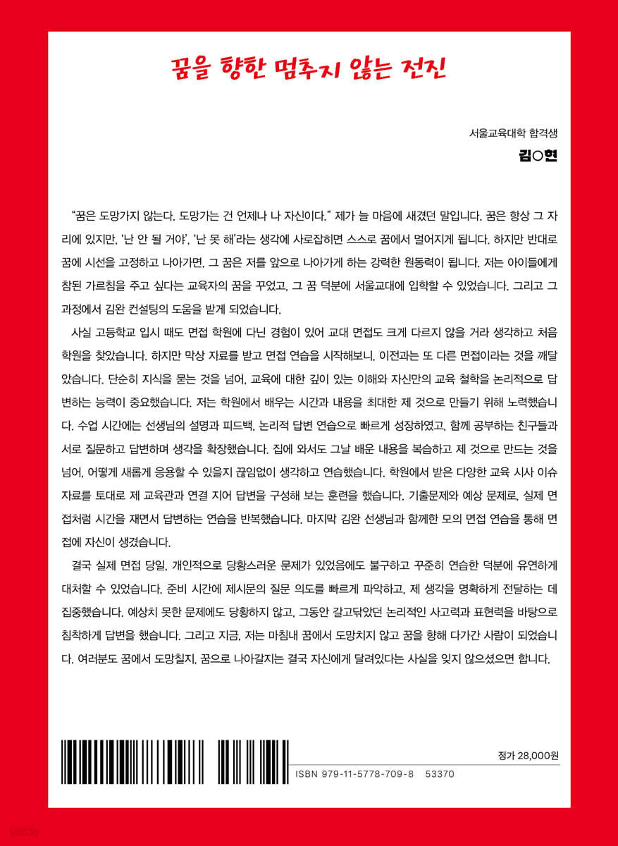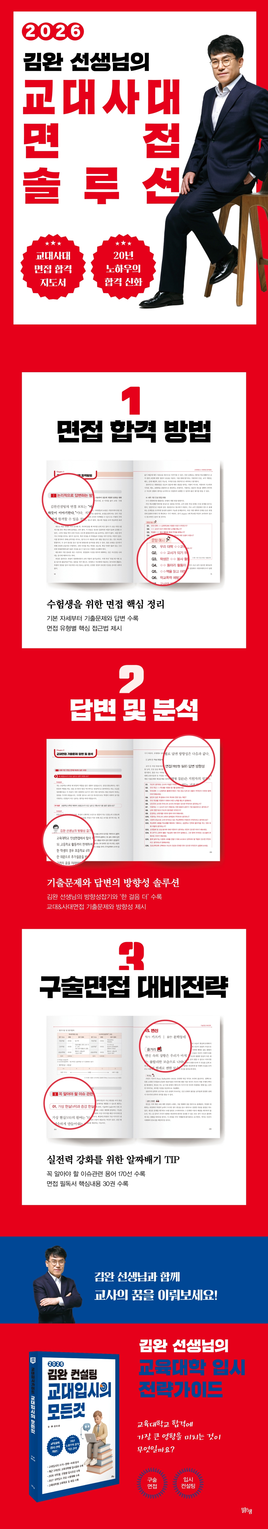 이슈 관련 교양 필수용어 170선 수록, 면접 추천도서 핵심내용 30권 수록 이 책의 구성은 Chapter1에서는 교대·사대 면접 합격방법으로 논리적으로 답변하는 방법, 반드시 출제되는 문제, 면접 유형별 접근법 3개의 소단원에 교대면접 기본 지식과 면접에 합격할 수 있는 핵심 내용만을 정리하였며 Chapter2에서는 합격한 학생들의 기출문제 답변과 ‘김완 선생님의 방향성 잡기와 한 걸음 더’를 수록하여 학생 스스로 질문에 대한 방향성을 찾을 수 있게 하였다. Chapter3 사범대 면접 방향성과 예상문제를 수록하여 사범대를 지원하는 학생이 면접 준비를 하는 데 도움이 되게 하였으며 Chapter4 구술면접 대비 전략에서는 ‘대학별 특성 및 평가기준’, ‘꼭 알아야 할 이슈 관련 필수 용어 170선’으로 구성하여 심화된 면접을 준비하는 데 도움이 되도록 하였습니다. 지금까지 교육대학 최다 합격생을 배출한 김완 컨설팅 교대입시연구소와 함께 교사의 꿈을 이루시길 바랍니다. |