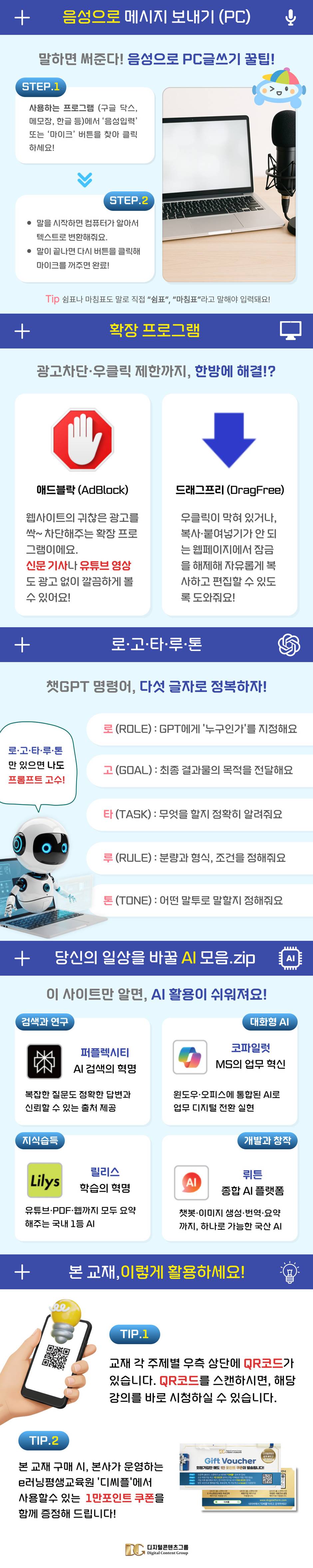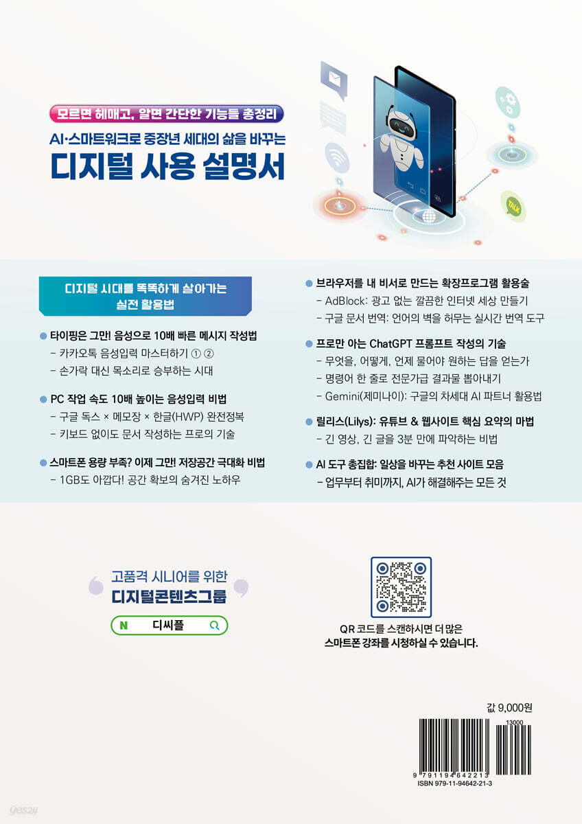 - 스마트폰으로 여는 즐거운 일상 - 이 책은 단순한 스마트폰 사용법을 넘어, 디지털 환경에 낯선 시니어들도 쉽게 접근할 수 있도록 다양한 기능을 단계별로 설명한 실전형 스마트폰 활용서입니다. 음성으로 메시지 보내기, 저장공간 정리, 최적화 위젯 설정, PC 음성 입력, 크롬 확장기능 설치, 광고 차단, 사진 편집 앱 활용 등 스마트폰과 인터넷을 보다 똑똑하게 활용할 수 있는 기능들이 풍성하게 담겨 있습니다. 특히 ChatGPT, Gemini, 릴리스(Lilys), 감성공장, 포토퍼니아 등 최신 AI 도구 활용법까지 포함되어 있어, 시니어들이 디지털 세상과 한 걸음 더 가까워질 수 있도록 실용적 안내를 제공합니다. 모든 주요 주제에는 QR코드가 포함되어 있어, 카메라로 스캔만 하면 바로 강의로 연결됩니다. 텍스트 학습과 영상 강의의 결합은 이해도를 높이고 학습 지속성을 높이는 효과적인 구성입니다. 스마트폰을 다룰 때 생기는 막연한 두려움이나 거부감을 줄여주고, 배우는 즉시 실천에 옮길 수 있는 구성으로 짜여져 있어 자기주도적 학습이 가능한 점도 이 책의 큰 강점입니다. 또한 책 속에서 제공되는 1만 포인트 쿠폰은 디지털콘텐츠그룹의 공식 플랫폼 '디씨플'에서 유료 콘텐츠 구매, 전자책 다운로드, 멤버십 가입 등에 사용할 수 있어 학습에 도움을 줍니다. 이 포인트는 신규 회원가입 즉시 발급되며, 친구 추천, 출석 체크 등 다양한 활동을 통해 추가 적립도 가능해 실질적인 교육 혜택으로 이어집니다. 교육이 끝난 후에도 디지털콘텐츠 e러닝평생교육원에서 계속해서 최신 트렌드에 맞춘 강의를 시청하거나, 스마트폰 활용지도사, 디지털문해지도사, AI 전문지도사 등의 자격과정에 도전할 수 있도록 하여, 학습의 끝이 아닌 ‘시작’을 위한 책이라 할 수 있습니다. 이 책을 통해 디지털을 새로운 즐거움으로 받아들이고, 일상에서의 활용뿐 아니라 자격 취득과 제2의 인생 설계까지 이어지기를 기대합니다. 단순한 교재를 넘어 ‘디지털 자신감’을 키워주는 진정한 동반자가 되어줄 것입니다. |