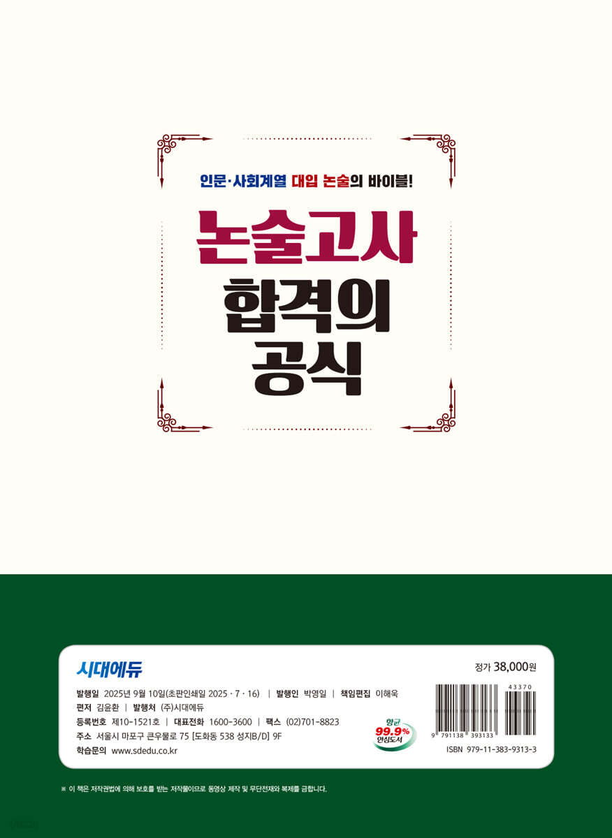 PART 1 논술 톺아보기 CHAPTER 1 개요 작성론 1. 개요 작성의 일반적인 단계 2. 합격 선배가 전하는 ‘개요 작성의 팁’ 3. 서로 다른 두 가지 스타일의 개요 구성 CHAPTER 2 독해 방법론 단계별 독해법 PART 2 논술 유형 점검하기 CHAPTER 1 요약 유형 정복하기 1. 요약 유형을 정복하는 단계별 접근법 2. 실전 문제로 감각 익히기 3. 실전 문제 답안 확인하기 4. 실전 적용 Tip으로 최종 정리하기 CHAPTER 2 비교 유형 정복하기 1. 비교 유형을 정복하는 단계별 접근법 2. 비교 제시문의 대표 유형 3. 실전 문제로 감각 익히기 4. 실전 문제 답안 확인하기 5. 실전 적용 Tip으로 최종 정리하기 CHAPTER 3 평가 유형 정복하기 1. 평가 유형이란? 2. 평가 유형 답안의 기본 구조 3. 평가 유형 문제에서 주의할 부분 4. 실전 문제로 감각 익히기 5. 실전 문제 답안 확인하기 6. 실전 적용 Tip으로 최종 정리하기 CHAPTER 4 대안 논증 유형 정복하기 1. 대안 논증 유형이란? 2. 대안 논증 유형을 정복하는 단계별 접근법 3. 실전 문제로 감각 익히기 4. 실전 문제 답안 확인하기 5. 실전 적용 Tip으로 최종 정리하기 CHAPTER 5 자료 해석 유형 정복하기 1. 도표 분석의 기본 접근 단계 2. 실전 문제로 감각 익히기 3. 실전 문제 답안 확인하기 4. 실전 적용 Tip으로 최종 정리하기 [제2권 ┃ 실전 대비편] PART 1 대학별 최신 기출문제 CHAPTER 1 2025학년도 기출문제 경희대학교 고려대학교 서강대학교 성균관대학교 연세대학교 CHAPTER 2 2024학년도 기출문제 경희대학교 고려대학교 서강대학교 성균관대학교 연세대학교 PART 2 논술 뛰어넘기 CHAPTER 1 김윤환T 선정 핵심 기출문제 경희대학교 고려대학교 서강대학교 성균관대학교 연세대학교 CHAPTER 2 출제 예상 문제 고려대학교 연세대학교 |