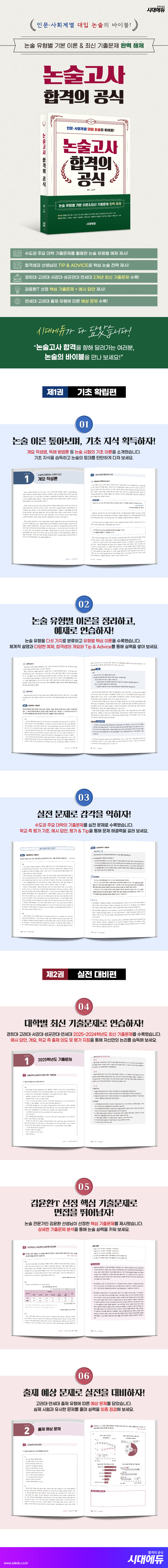 출간에 앞서 수백 편 이상의 합격 답안을 수집·복원·분석하여 고득점 답안과 변별력 있는 답안을 파헤치고, 합격생들과 진행한 인터뷰를 토대로 검증했습니다. 이러한 과정을 거쳐 완성한 이 책은 가장 실전적인 ‘논술 기술서’이자 ‘논술 이론서’입니다. 수록된 합격 답안을 면밀히 살피고, 창조적으로 수용하길 바랍니다. 검증된 답안을 학습하고 모방하는 방식을 통해 자신만의 논술 스타일을 찾아갈 수 있게 될 것입니다. 이 책으로 공부하는 수험생 여러분들이 ‘소망하고 노력하는 만큼 이루어진다.’는 진리를 가슴에 새기길 바랍니다. 여러분은 충분히 해낼 수 있습니다. 이 책으로 공부하는 모든 이들의 건승을 기원합니다! _ 저자의 말 중에서 |