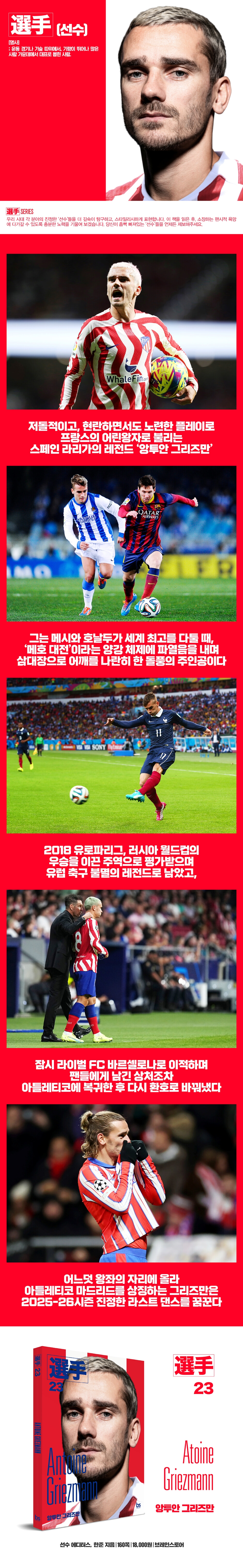 그 속에서 기회를 뛰어넘은 그리즈만 끝없는 열정으로 완성된 그의 꿈 레알 소시에다드에서 시작되어 아틀레티코 마드리드에서 비상한 그리즈만은 항상 주어진 기회를 놓치지 않고 최고의 자리에 오르기 위한 열정을 보여주었다. 자신의 첫 번째 유소년 팀 마콩에 걸려 있는 그리즈만의 '레알 소시에다드' 유니폼과 '나를 만들어준 클럽'이라는 문구처럼, 그리즈만은 레알 소시에다드에서 진정한 커리어를 시작했는데, 당시 레알 소시에다드가 2부리그로 강등되면서 스쿼드의 퀄리티가 이전보다 떨어진 틈을 놓치지 않고 그리즈만은 팀의 1부리그 승격의 역사를 쓴 주요 선수로 활약했다. 2014년 아틀레티코 마드리드로 이적했을 당시에도, 프랑크 리베리의 부상으로 2014 브라질 월드컵에서 꾸준히 출전 기회를 얻으며 리베리의 자리를 이어받은 것이다. 마찬가지로 선참의 부상 공백으로 찾아온 기회를 자기 힘으로 움켜쥔 것이다. 또한 그리즈만은 레알 소시에다드에서 육성한 최고의 외국인 선수 중 한 명으로서 출신보다 가치를 더 중시하는 구단의 철학대로 외국인 선수들이 소외감을 느끼지 않고 활동하고 지원하는 환경 속에서 성장했다. 그렇기에 그리즈만은 프랑스 국적의 선수임에도 한 클럽의 최고의 레전드로 인정받는 데에는 태어난 도시와 성장한 클럽이 꼭 중요한 것이 아니라는 것을 보여준 선수로도 평가받았다. [선수 23- 앙투안 그리즈만]은 단순히 축구선수 그리즈만의 이야기가 아닌, 한 명의 인물로서 그가 밟아온 여정을 담고 있다. |