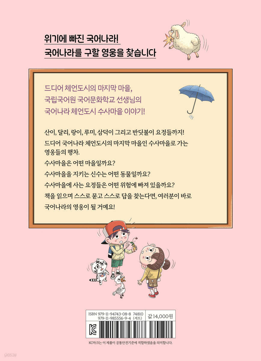 모험 가득한 판타지 동화로 만나는 국어 전문가 선생님의 수사 이야기 여기서 잠깐 문제 하나! 국어나라는 ‘명사마을, 대명사마을, 수사마을, 동사마을, 형용사마을, 부사마을, 관형사마을, 감탄사마을’ 총 8개 마을이 있어요. 이 8개 마을을 세어 본다면 어떻게 세나요? 하나, 둘, 셋, 넷…? 일, 이, 삼, 사…? 둘 다 맞답니다. 수량을 세는 수사는 양수사인데 ‘하나, 둘, 셋’과 같이 고유어로 세기도 하고, ‘일, 이, 삼’과 같이 한자어로 세기도 해요. 그렇다면 다시 하나 물어 볼게요. “아침에 일어나면 무엇을 하나요? 순서대로 말해 보세요.” 첫 번째는 이불을 개고, 두 번째는 세수하고 이를 닦는다고요? ‘첫 번째, 두 번째, 세 번째’와 같이 순서를 세는 수사를 서수사라고 해요. 수사마을은 바로 이 양수사와 서수사 요정들이 사는 마을이랍니다. ‘제일, 제이, 제삼’처럼 한자어 서수사 요정들도 있네요. 마지막으로 다시 문제 하나 낼게요. “숫자 영(0)은 명사일까, 수사일까요?” “왜 26은 고유어로 읽고, 555는 한자어로 읽을까요?” 이처럼 ‘국어나라 수사마을 이야기’에는 국어 전문가 선생님의 다양하고 깊이 있는 수사 이야기가 가득하답니다. 수사 요정들이 사는 수사마을은 마왕이 어떤 모습으로 만들어 놓았을까요? 국어나라의 영웅들은 어떤 활약을 펼치고 어떤 국어 지식을 쌓게 될까요? 그림 속에 갇힌 수사마을 양 한 마리와 알록달록한 우산이 가득한 그림, 쿠키 공장과 수묵 산수화 그림의 비밀 그런데 수사마을로 향하는 영웅들 앞에는 끊어진 출렁다리가 놓입니다. 끊어진 출렁다리의 디딤판을 찾아서 이어야 수사마을로 갈 수 있어요. 디딤판을 이으려면 ‘반의어’인 디딤판을 찾아야 해요. 영웅들은 10개의 반의어 디딤판을 찾아 출렁다리를 맞추어 반의어 공부를 확실히 하지요. 드디어 수사마을 입구에 도착하니, 마을 입구에 그림 액자 세 개가 공중에 떠 있어요. 양 한 마리와 알록달록한 우산이 있는 그림, 쿠키를 만들고 있는 공장 모습의 그림, 물 위에 작은 배 한 척이 떠 있는 수묵 산수화 그림이에요. 영웅들은 그림 액자 뒷면에 적힌 임무를 수행하고 그림 속으로 들어가 수사마을의 신수 양양이를 만나요. 그리고 양양이에게서 액자 속 그림들의 비밀을 듣게 됩니다. 바로 수사요정들이 갇혀 있는 그림 액자들이었어요. 수정 구슬 속의 고유어 양수사 요정들과 쿠키 공장의 고유어 서수사 요정들 양양이를 만난 기쁨도 잠시, 곧 알록달록한 우산들이 착, 착 접히더니 영웅들을 공격해 옵니다. 그 우산들의 손잡이에는 숫자 퍼즐 조각들이 달려 있어요. 영웅들은 그 숫자 조각들을 떼어내 퍼즐 조각을 맞추어 수정 구슬 속에 갇힌 ‘고유어 양수사’ 요정들을 구해냅니다. 이어서 쿠키 공장에서 만든 쿠키에 홀린 고유어 서수사 요정들도 구해냅니다. 반죽을 만드는 첫째 요정, 쿠키 모양을 만드는 둘째 요정, 쿠키 위에 재료를 뿌리는 셋째 요정…열한째, 열두째…. 고유어 서수사 요정들을 찾아 쿠키 기계를 돌렸더니 요정들이 마법에서 풀려났어요. 수묵 산수화 속의 한자어 양수사 서수사 요정들과 체언도시 정화 마지막 수묵 산수화 그림 속으로 갔더니, 영웅들이 탄 배가 ‘첨벙’ 폭포 아래로 떨어졌어요. 잠시 뒤 찾아온 고요함, 저 멀리 서원이 보여요. 서원에 있는 4폭 병풍에 새겨져 있는 글자들이 한자어 서수사와 양수사 요정들을 구해내는 임무였어요. 그 임무를 수행하려면 ‘만파식적’ 피리를 찾아야 해요. 신라 때부터 내려오던 신물, 만파식적은 모든 재앙을 물리치는 힘을 지녔거든요. 피리를 부는 조건을 알아낸 영웅들은 피리를 불고 한자어 양수사 서수사 요정들도 구해냅니다. 이리하여 국어나라의 영웅들인 산이, 달리, 랑이와 친구들은 체언도시의 명사마을, 대명사마을에 이어 수사마을에서도 마왕의 검은 안개를 모두 물리치고 집으로 돌아옵니다. 그 길에 삼덕이 부모님과 가족들도 만나 기쁨의 눈물을 흘립니다. 체언도시의 세 마을을 구해내며 국어나라 영웅들의 국어 지식도 가득 채워졌어요! 산이도 달리도 랑이를 따라 국어나라로 가기 전보다 마음도 훌쩍, 국어 지식도 훌쩍 자랐지요. 산이 달리와 함께 이 책을 보는 여러분의 국어 지식도 훌쩍 자라게 될 거예요. |