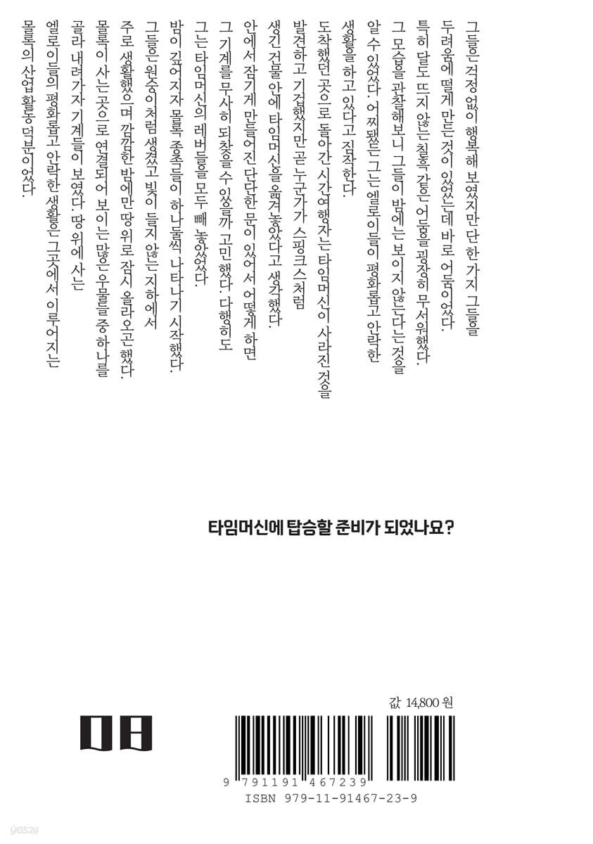 시간여행자는 우리를 한번 쭉 둘러보더니 기계로 시선을 돌렸다. “자, 그럼?” 심리학자가 말했다.
