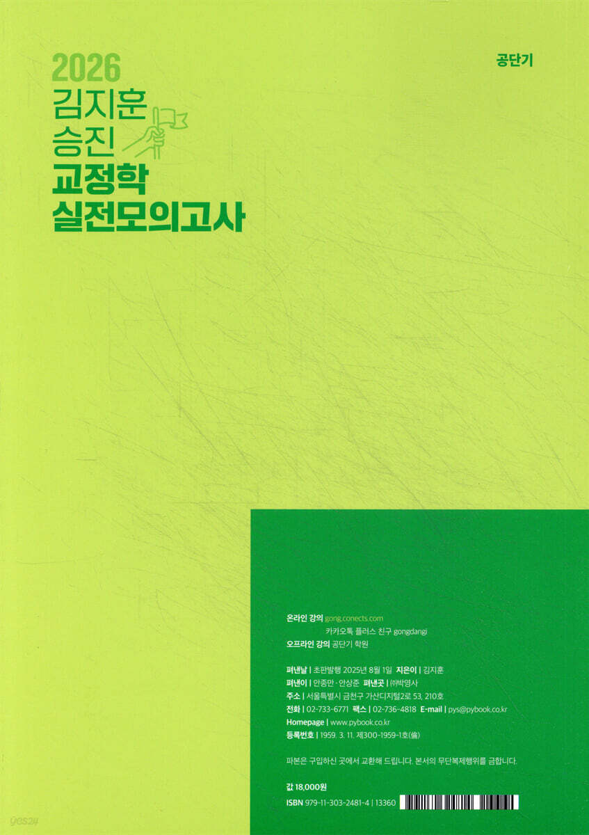 모의고사는 25문제 15회분으로 최종 마무리에 적합하도록 구성되어 있습니다. 따라서 승진 교정학 기본서의 회독을 늘린 뒤 요약집으로 전체적인 정리 및 암기를 한 후, 최종점검 차원에서 풀어보시길 바랍니다. 25문제를 20분 이내로 풀 수 있도록 시간 체크를 하시면서 연습하시면 실전에서 시간문제에 대한 어려움은 상당히 줄어들 것으로 생각됩니다. 본 모의고사집에 대한 별도의 강의는 없습니다. 최대한 자세히 해설을 첨부하였으니 혼자서도 무난하게 푸실 수 있을 것입니다. 혹시 이해되지 않거나 궁금한 점이 있으면 언제든 네이버 정도교정학 카페 게시판이나 이메일(jhkim0118@naver.com)로 문의주시면 빠른 답변 드리도록 하겠습니다. 정도 교정인 여러분들의 건승을 기원합니다. |