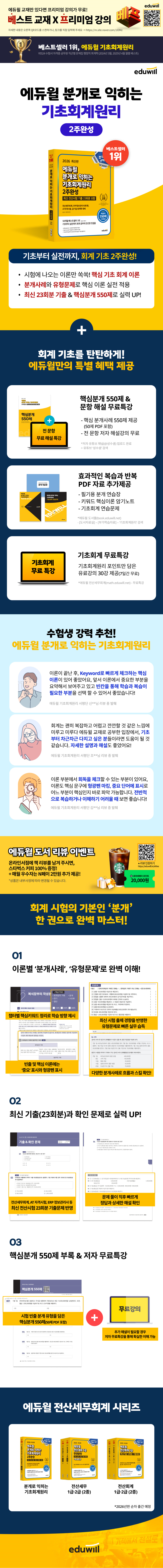 [CHAPTER 01 재무제표의 원리] 부기와 회계 재무상태표 손익계산서 순손익 계산 기출&확인 문제 [CHAPTER 02 복식장부의 작성원리] 회계기록의 대상과 방법 전기와 회계장부 회계순환의 과정 기출&확인 문제 2. PART 02 계정과목론 [CHAPTER 01 상기업의 영업활동] 재무제표의 기본구조 상기업의 주영업활동 기출&확인 문제 [CHAPTER 02 제조기업의 원가] 원가의 개념과 분류 원가의 흐름 기출&확인 문제 [CHAPTER 03 당좌자산과 유동부채] 당좌자산과 유동부채1 당좌자산과 유동부채2 기출&확인 문제 [CHAPTER 04 비유동자산] 유형자산 무형자산 투자자산 기타 비유동자산 기출&확인 문제 [CHAPTER 05 비유동부채와 충당부채] 대손회계와 충당부채 비유동부채 기출&확인 문제 [CHAPTER 06 자본] 자본의 의의 및 성격 자본의 회계처리 기출&확인 문제 [CHAPTER 07 손익계산서 및 재무제표 결산] 수익과 비용 및 재무제표 작성기준 결산의 의의와 기말수정분개 종합사례를 통한 결산과정 재고조사표와 정산표 재무제표의 연관관계 기출&확인 문제 3. [부록] 핵심분개 550제 |