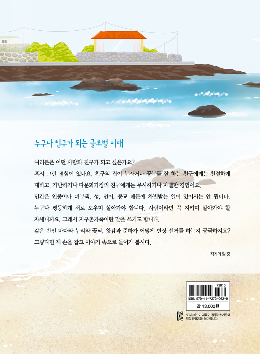 다름을 인정하고 진심 어린 이해를 통한 우정과 용기 제주도에 사는 4학년 소년 바다는 이번 반장 선거에 도전하기로 합니다. 가장 친한 친구 준하의 적극적인 응원과 아빠가 남겨준 소중한 마스코트가 용기를 주고, 친구들에게 과자도 나누고 친절을 베풀며 선거운동을 하지만 예상치 못한 경쟁자가 등장합니다. 바로 예멘에서 온 난민 소녀 누리입니다. 누리는 밝고 친절하며 자발적으로 반 친구들을 도와주면서 아이들의 신뢰를 얻습니다. 처음엔 누리를 단순히 ‘외국인’으로 여기던 바다는 친구들마저 누리를 지지하자 질투심에 휘말리게 되고, 준하 역시 누리에 대한 편견 어린 말로 바다를 부추기면서 누리를 향한 흑색선전마저 벌이게 되고, 선거일은 점점 다가옵니다. |