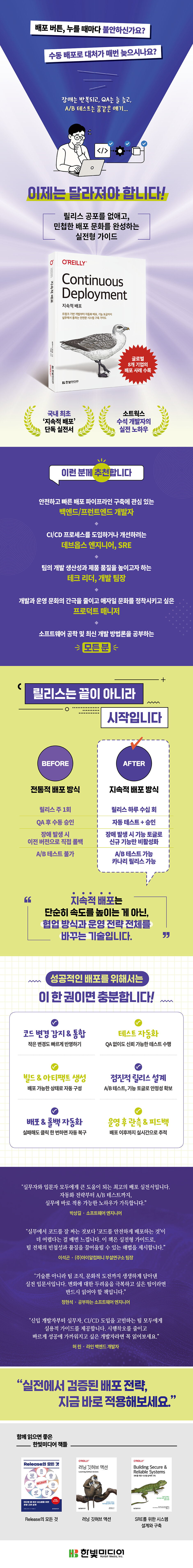더 빠른 피드백, 더 안전한 릴리스로 신뢰할 수 있는 소프트웨어 구축하기이제 배포는 개발자만의 책임이 아닙니다. 프런트엔드, 백엔드, QA, 제품 관리자까지 모두가 함께 책임져야 할 핵심 과정이며, 조직의 민첩성과 제품 품질을 좌우하는 요소입니다. DORA 메트릭, 린, DevOps 같은 현대 개발 문화는 개발과 운영의 경계를 허물고 피드백 루프를 단축하며 이 변화를 가속화하고 있습니다. 이 책은 그런 흐름 속에서 독자가 중심에 설 수 있도록 도와줍니다. 이 책을 통해 개발 초기 기획부터 배포 이후 운영까지, 기능 단위 배포, 데이터 마이그레이션, A/B 테스트 전략 등 실무에 바로 적용할 수 있는 기술과 인사이트를 폭넓게 배울 수 있습니다. 소프트웨어를 더 빠르고 안전하게 전달하고 싶은가요? 지금 이 책에서 해답을 찾으시길 바랍니다.이 책의 특징● 이론부터 실전까지: 지속적 배포의 개념부터 실제 코드 레벨의 구현까지 체계적으로 안내● 실전 예제 코드: 리액트(프런트엔드), 스프링 부트(백엔드), SQL(데이터베이스)을 아우르는 실용 예제를 제공● 안전한 변경 관리: 운영 중인 기능을 리팩터링하고 데이터베이스 스키마를 마이그레이션하는 구체적인 패턴 제시.● 글로벌 기업 사례 연구: 오토스카우트24, N26 등 8개 기업이 지속적 배포를 도입하고 기술 문화를 혁신한 과정을 심층 분석● 개발 문화 개선: 기술적 프랙티스를 넘어, 조직이 변화에 대응하고 신뢰를 구축하는 문화 소개대상 독자● 지속적 배포를 잘 알고 있긴 하나, 과연 우리 팀에 적합한 프랙티스인지 의문인 사람● 지속적 전달은 익숙하지만 지속적 배포는 그렇지 않아서 늘 제대로 한번 배워보고 싶은 사람● 지속적 배포를 도입한 팀에 합류하게 됐는데, 지속적 배포를 하는 이유와 방법을 알고 싶은 사람● 이미 지속적 배포로 전환하기로 했지만, 수동 프로덕션 게이트를 없애면 무슨 일이 벌어질지 알고 싶은 사람● 완전 새로운 제품을 기획 중이고 이를 계기로 지속적 배포를 적용해보고 싶은데, 아무래도 처음이라 어디서부터 어떻게 시작해야 할지 막막한 사람주요 내용● 개발 계획을 실시간 프로덕션 배포를 염두에 두고 설계하는 방법● 실제 운영 중인 기능을 리팩터링하거나 데이터 저장 방식을 변경하는 패턴● 다양한 피처 토글로 프로덕션 환경에서 기능을 테스트하고 릴리스하는 방법● 가시성, 성능, 테스트 자동화, 보안 요소를 고려해 작업을 나누고 배포하는 방법● 작업 중인 기능을 점진적으로 프로덕션에 배포하면서도 회귀 오류를 방지하는 기법
