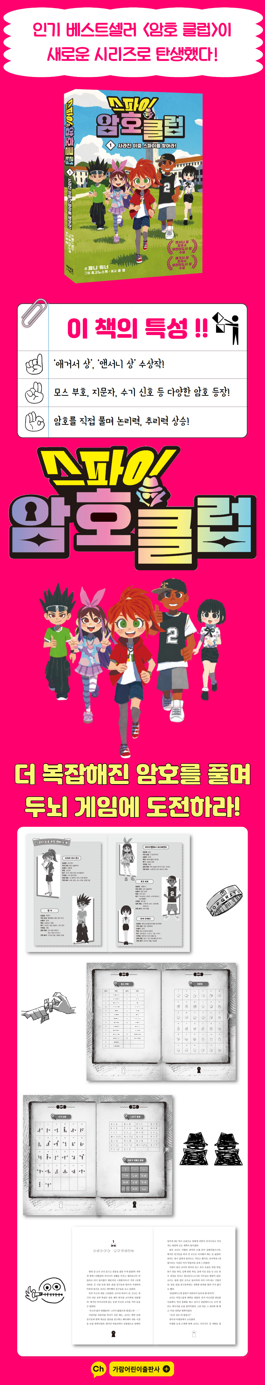 ‘애거서 상’, ‘앤서니 상’ 수상에 빛나는 페니 워너의 신작!인기 베스트셀러 「암호 클럽」 시리즈의 뒤를 잇는 흥미로운 두뇌 게임!수수께끼와 암호, 비밀 메시지를 풀어 미스터리 사건을 해결하라! 「스파이 암호 클럽」 시리즈는 초등학생 대상의 미스터리 탐정 소설이다. 전 20권으로 인기리에 막을 내린 「암호 클럽」의 주인공 코디, 퀸, 루크, 마리아, 미카가 한층 업그레이드된 「스파이 암호 클럽」으로 또다시 독자들을 찾아왔다.이 책의 주인공인 코디, 퀸, 루크, 마리아, 미카는 암호를 만들고 푸는 걸 매우 좋아한다. 「암호 클럽」의 뒤를 잇는 「스파이 암호 클럽」을 만들어 각자의 비밀 우편함과 클럽하우스를 만들고, 주변에서 일어나는 갖가지 사건들에 숨겨진 암호를 풀어 나간다. 각 장마다 해결해야 할 암호가 주어지며, 이 책을 읽는 독자들은 스파이 암호 클럽 멤버들과 함께 적극적으로 암호 풀이에 참여할 수 있다.《사라진 이중 스파이를 찾아라!》는 「스파이 암호 클럽」 시리즈의 시작을 여는 첫 번째 이야기로, 오랜만에 뭉친 다섯 친구가 스파이 캠프에 참가하면서 벌어지는 흥미진진한 사건들을 그리고 있다.암호와 추리, 탐정 소설은 언제나 아이들의 호기심을 자극한다. 다섯 명의 또래 아이들이 등장하는 이 소설은 탐정 추리 소설이라는 기본 틀에 암호 해독이라는 흥미 요소를 더했다. 독자와 대화하는 방식으로 이루어진 이 흥미진진한 책에는 다양한 암호들이 등장한다. 한글 자모음으로 이루어진 문자숫자식 암호, 지문자, 모스 부호, 수기 신호, 애너그램 등 간단하고도 비교적 보편적으로 알려진 암호들이 등장한다. 그 밖에도 시리즈가 진행되면서 셜록 홈스의 춤추는 사람 암호, 그림 속에 암호가 숨겨진 스테가노그래피 등 고전적이지 않은 독톡하고 참신한 암호들도 하나씩 등장할 예정이다. 암호 클럽 멤버들은 비밀을 유지하기 위해 평소에 암호를 주고받고, 암호는 사건 해결에서 중요한 단서가 된다. 독자들에게 다양한 암호를 제시하고 읽는 법을 안내함으로써 단순히 이야기의 줄거리를 쫓아가는 데 머물지 않고 암호를 풀고 사건을 추리하도록 이끈다. 독자들은 이 책에 나오는 암호를 직접 풀면서 부담 없이 여러 교과의 내용을 익힐 수 있다. 이 책에 실린 암호들은 난이도가 제각각 다르므로, 학업 수준이 서로 다른 아이들도 자신에게 맞는 암호를 찾고 ‘암호 언어’들에 익숙해질 수 있다. 책을 읽고 나서 독자들은 직접 암호를 만들어 볼 수도 있고, 서로 비밀 메시지를 보내서 상대방의 암호를 풀어 볼 수도 있다. 새로운 암호를 만들고 해결하면서 자신도 모르는 사이에 논리력과 추리력이 향상될 것이다.